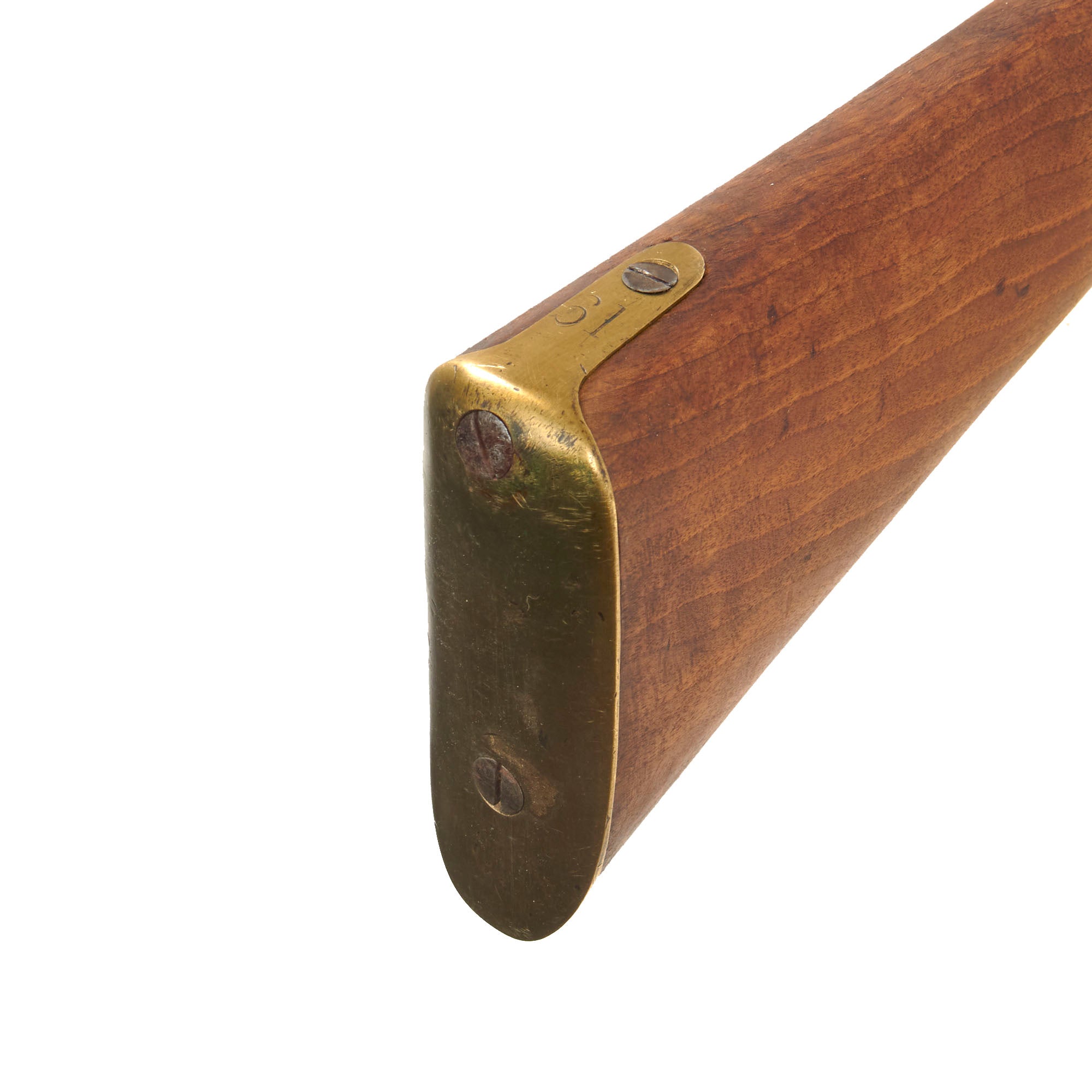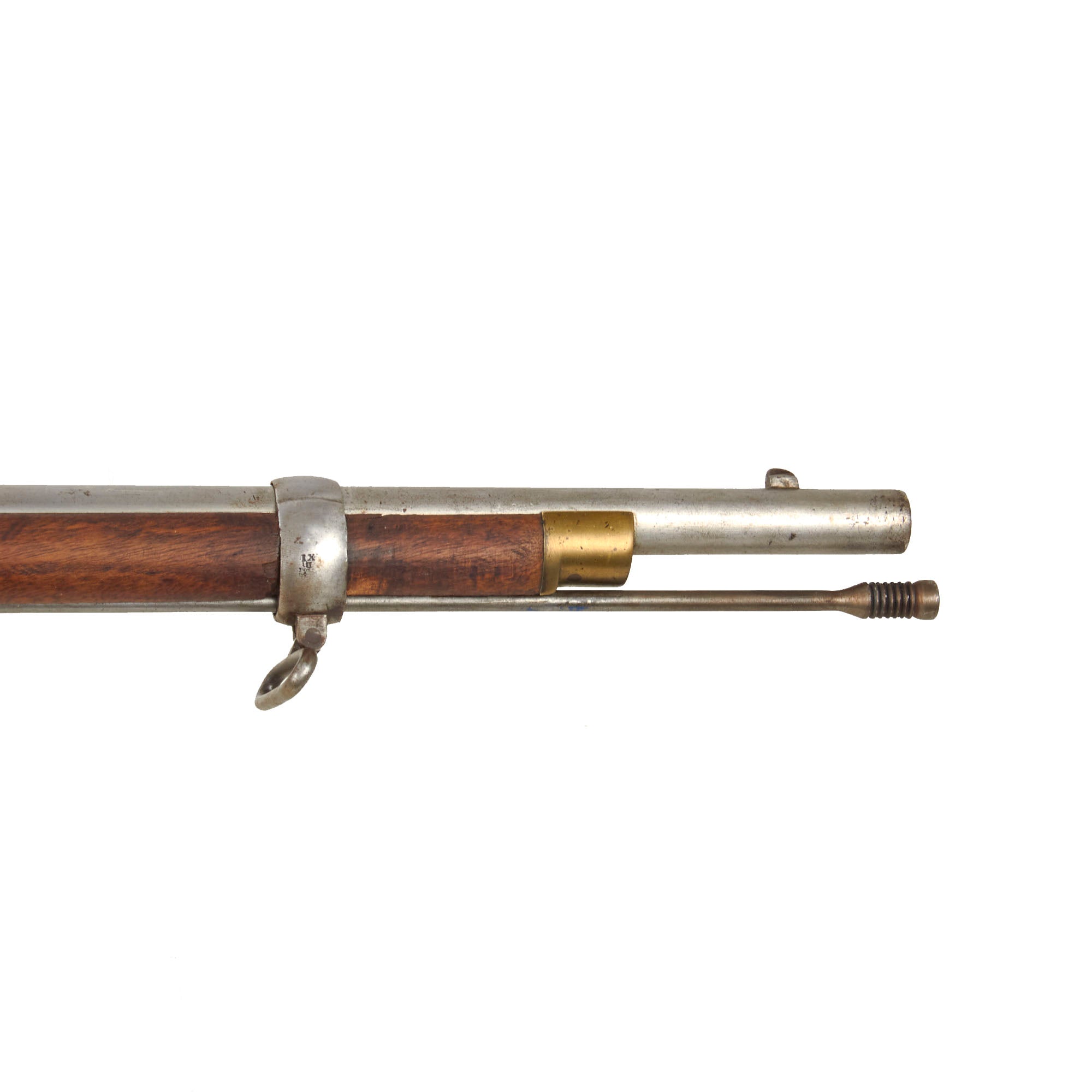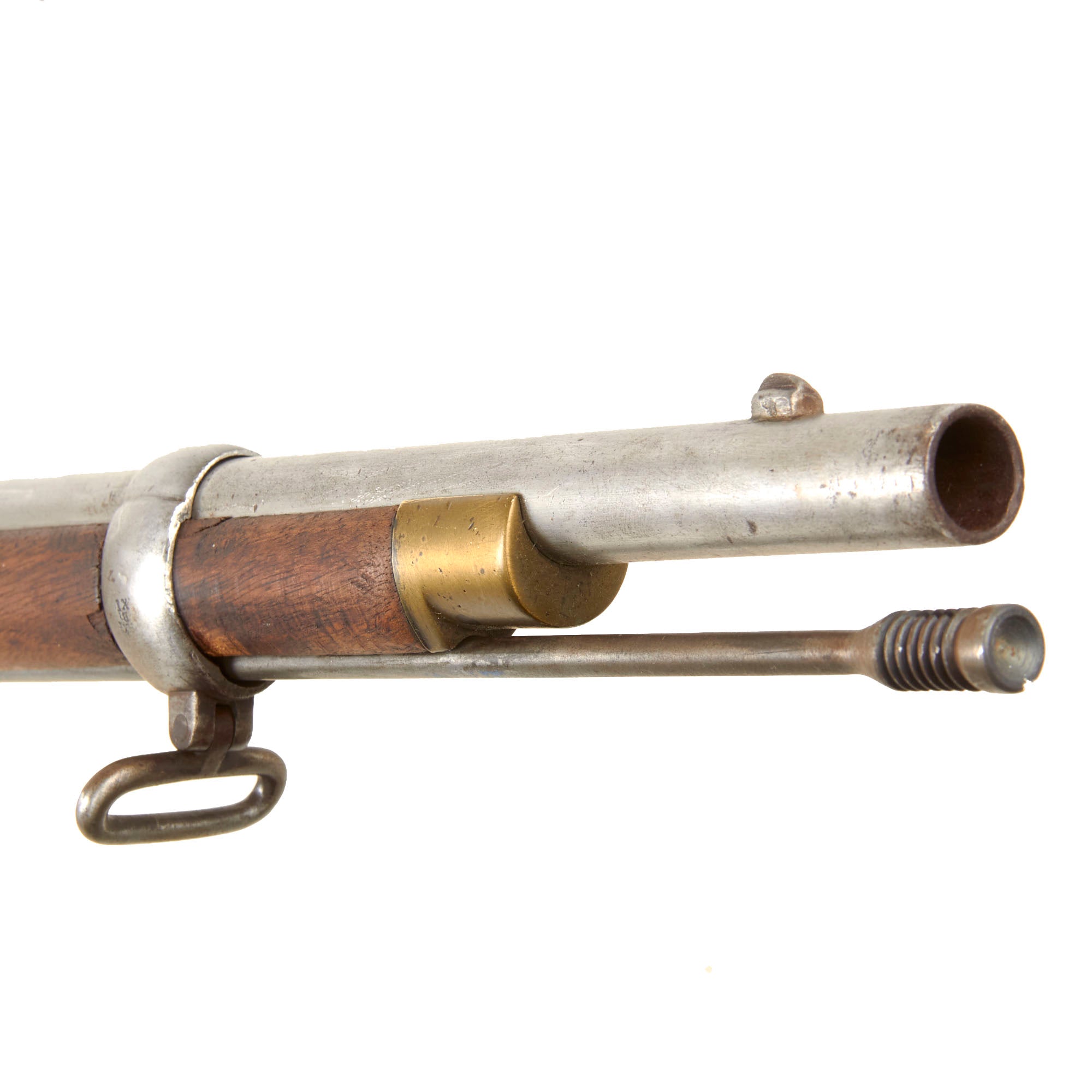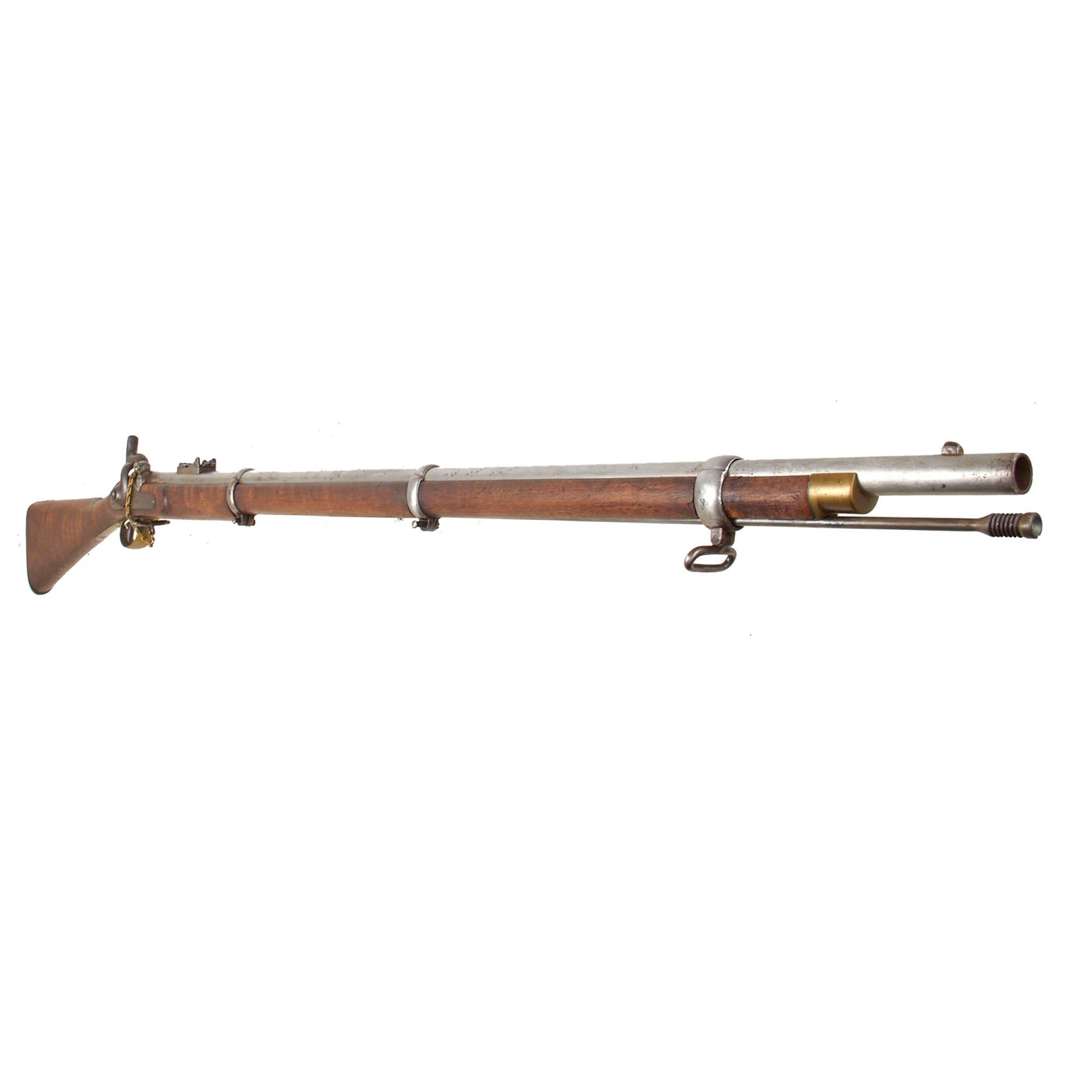 The gun is in very good condition, with a lovely figured stock and cleaned metalwork with a lovely polished patina. It definitely shows signs of use and wear consistent with service but was cleaned to put it in its best light. The rear sight is intact with the sight cap still present, though the slider is missing, and the rifle still has both sling swivels, while the ramrod is a more recent replacement. We checked the bore, and it still shows strong three groove rifling, though there is overall past fouling and oxidation, now removed. The cap nipple cone shows wear from oxidation and powder burn, and is protected by a lead protector, which is most likely aftermarket.