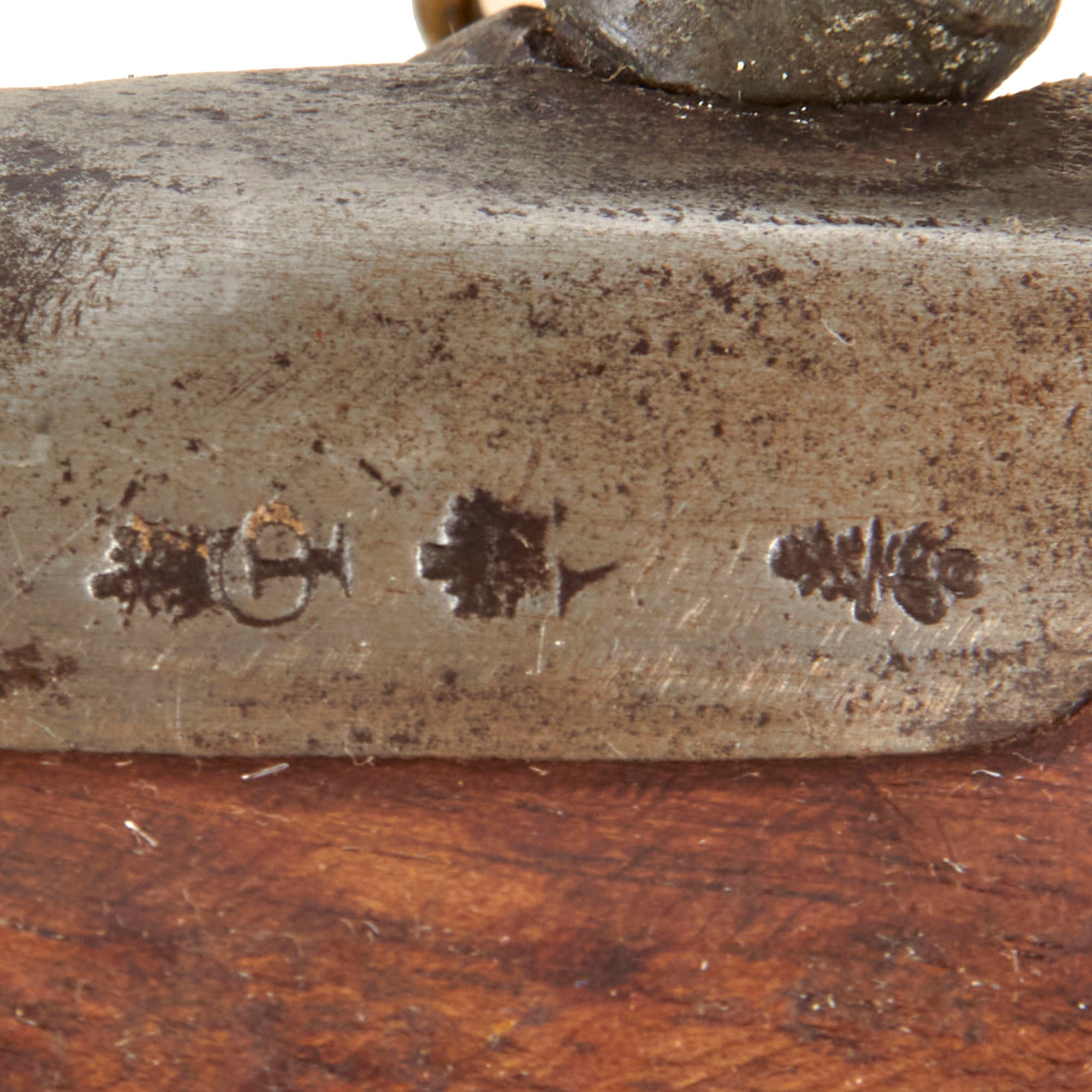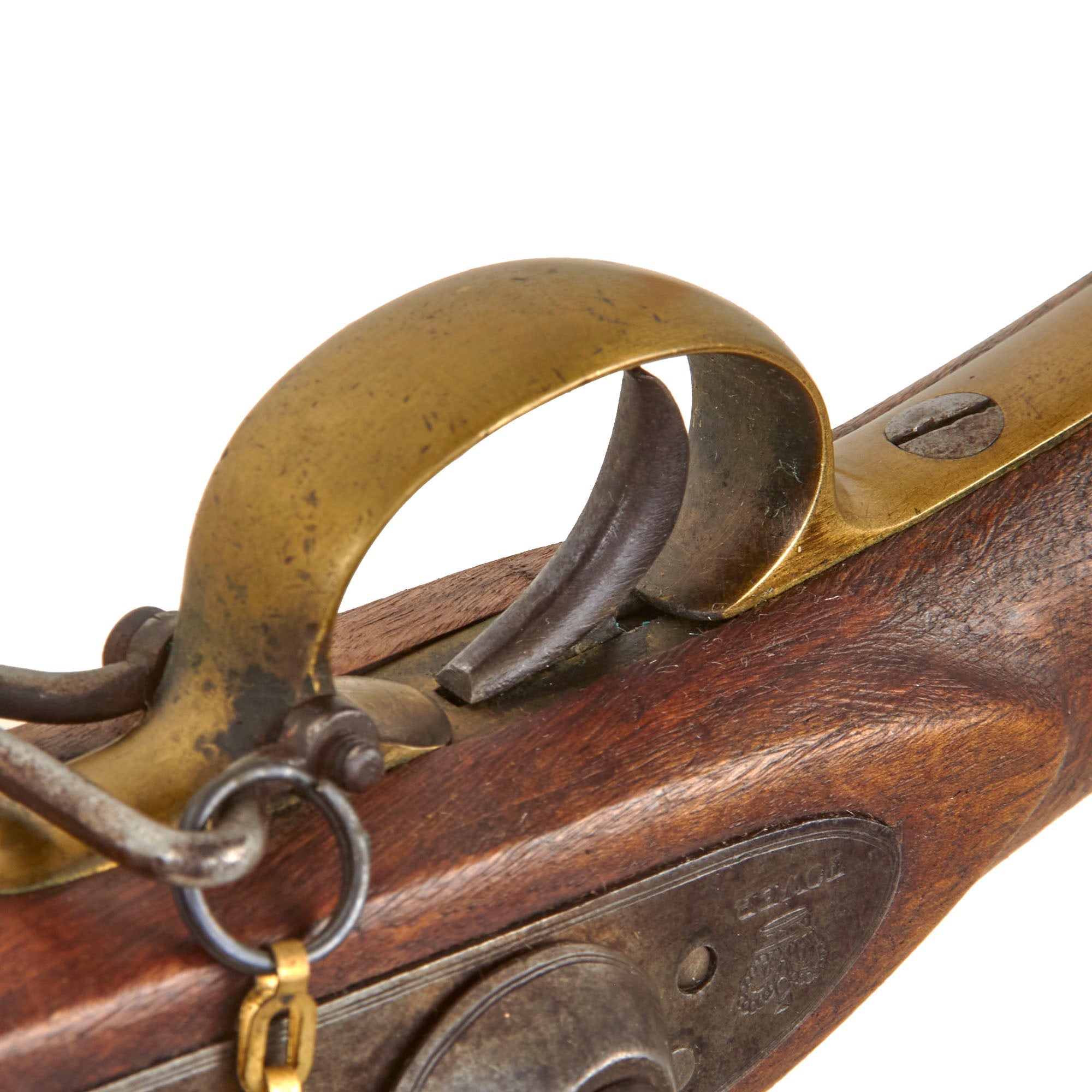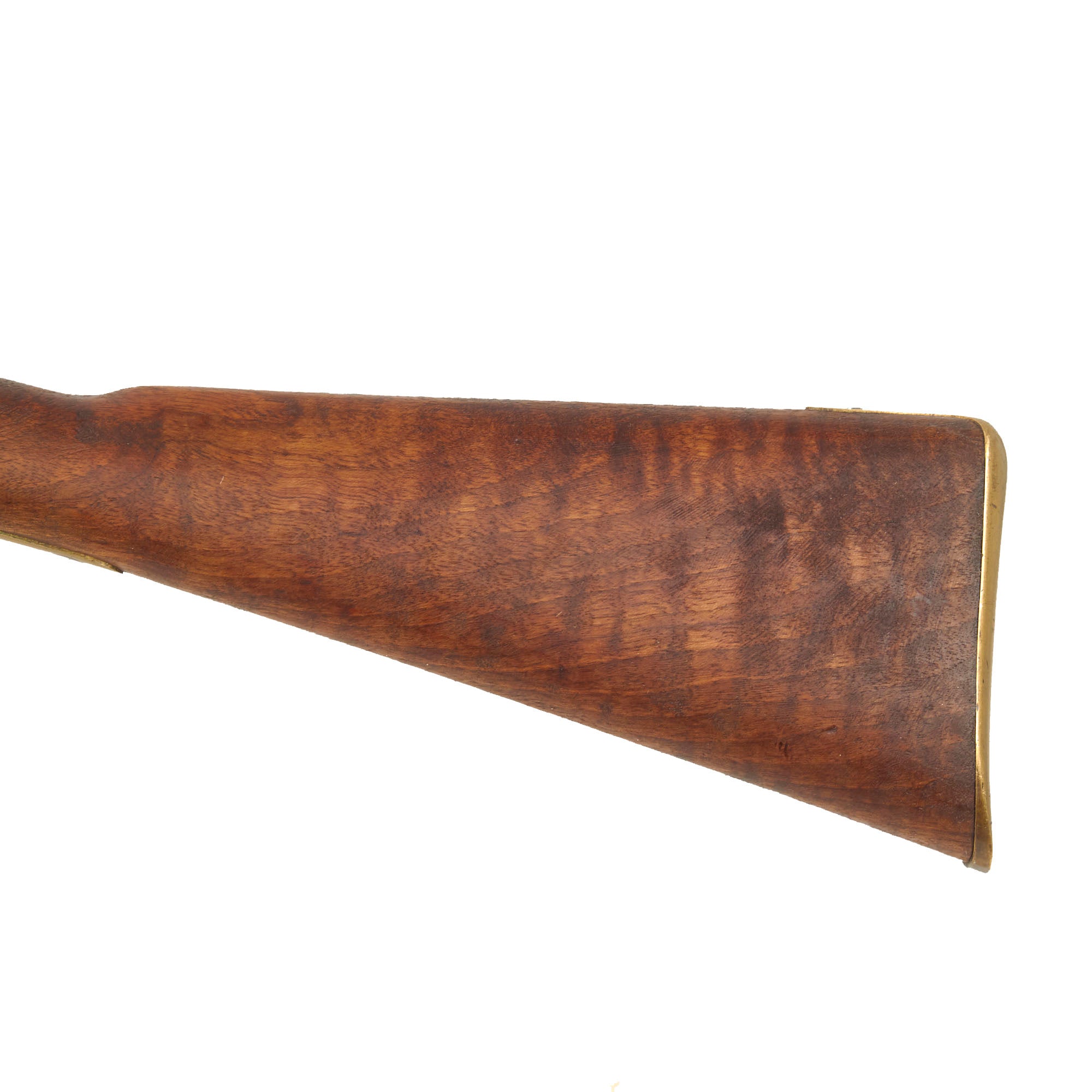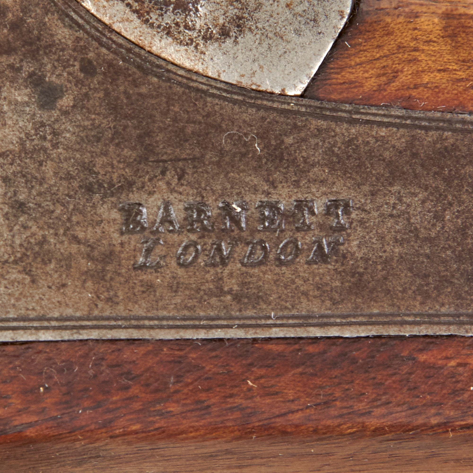 The lock plate is marked by maker BARNETT / LONDON, with a "CROWN" on the tail over TOWER. Thomas Barnett started work in London in 1750 until 1800 when the firm became Barnett & Son. In 1835 the firm was named "John Barnett & Sons" and from 1875 until 1900 "Edward Barnett & Sons" An English gun making dynasty that enjoyed many government contracts as well as from the East India Company and the Hudson's Bay Company. The barrel bears the correct British Proof Markings of the CROWN / GP (Gunmaker’s Proof) and CROWN / V (Viewed) markings from the London Gun company, though they are faded from cleaning. We did not see any bore measurement marking, but there are some vise marks on the barrel, indicating it may have had the breech plug pulled at some point.