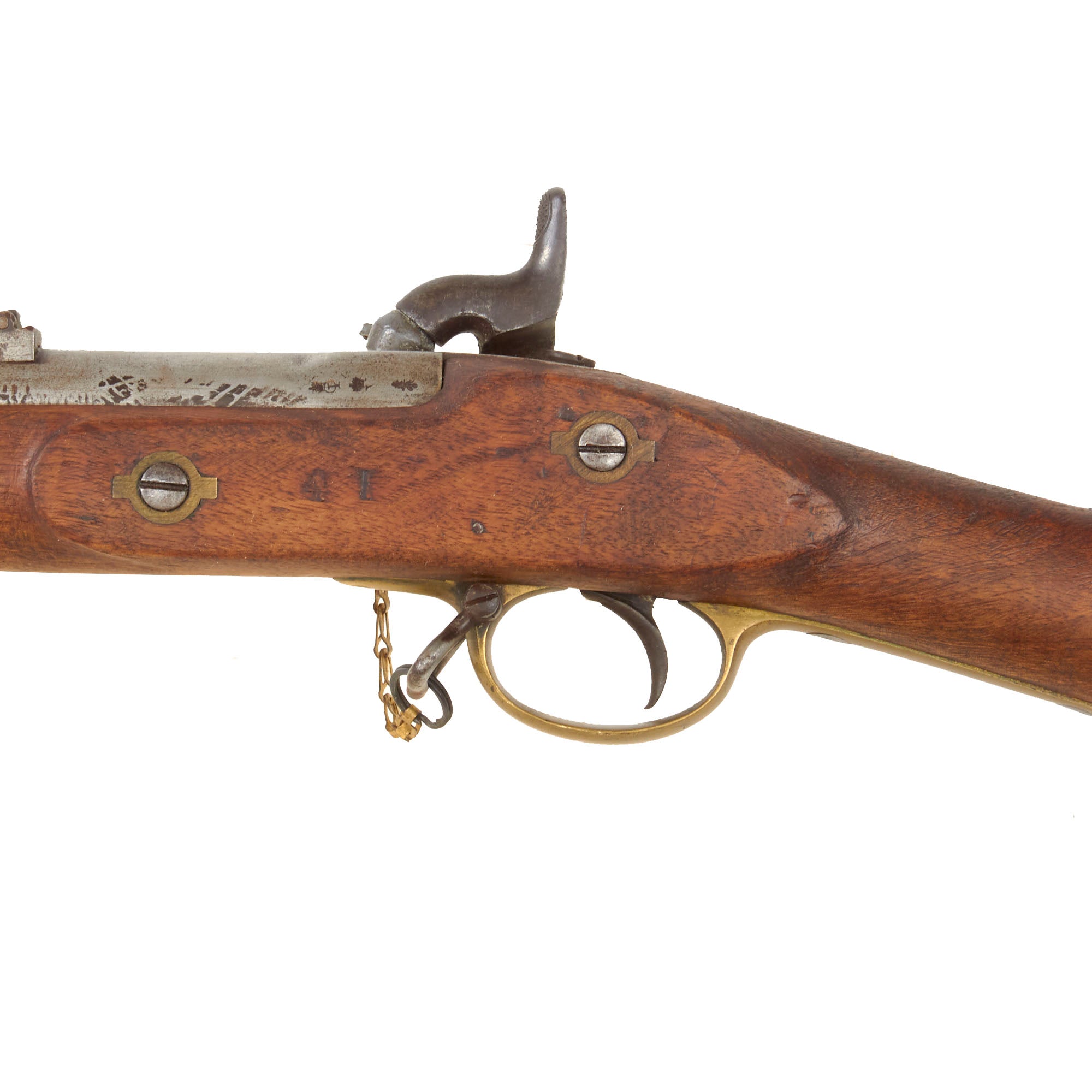 While the lock plate is marked with a Crown, there is no V.R. marking or other military proofs, indicating that the rifle was made for the commercial market. We have seen several examples by Barnett previously that were used for early breech loading designs such as the Robert's breech loader, so they seem to have mostly been kept domestically. However, it is always possible that some were purchased and exported to the United States, who were embroiled in its most terrible Civil War. We did not see any state or import markings, just some numbers stamped into the side of the stock (41) and the tang of the butt plate (61).