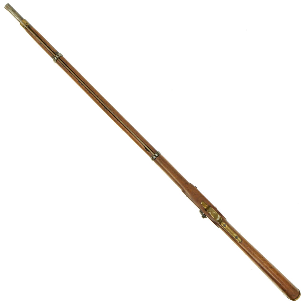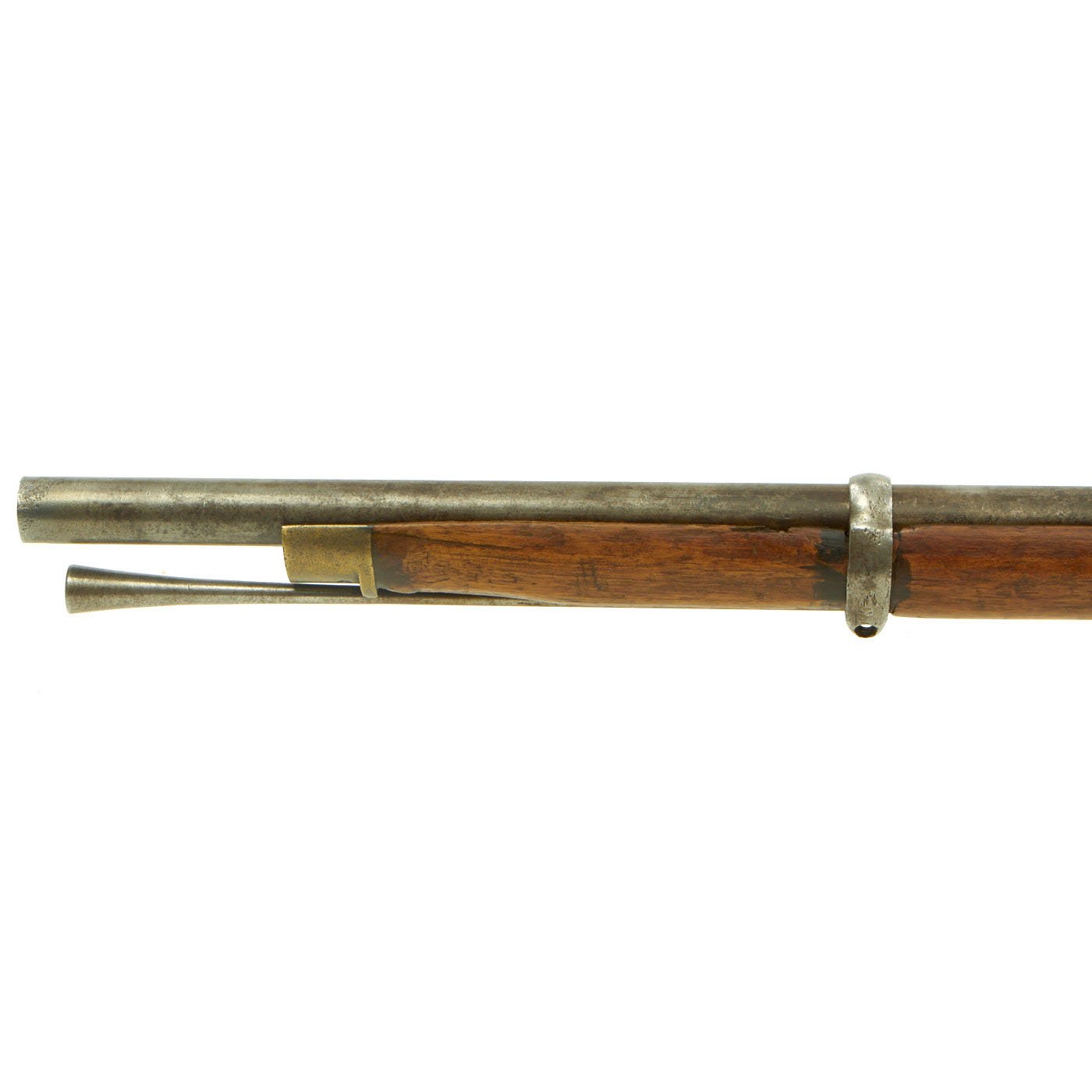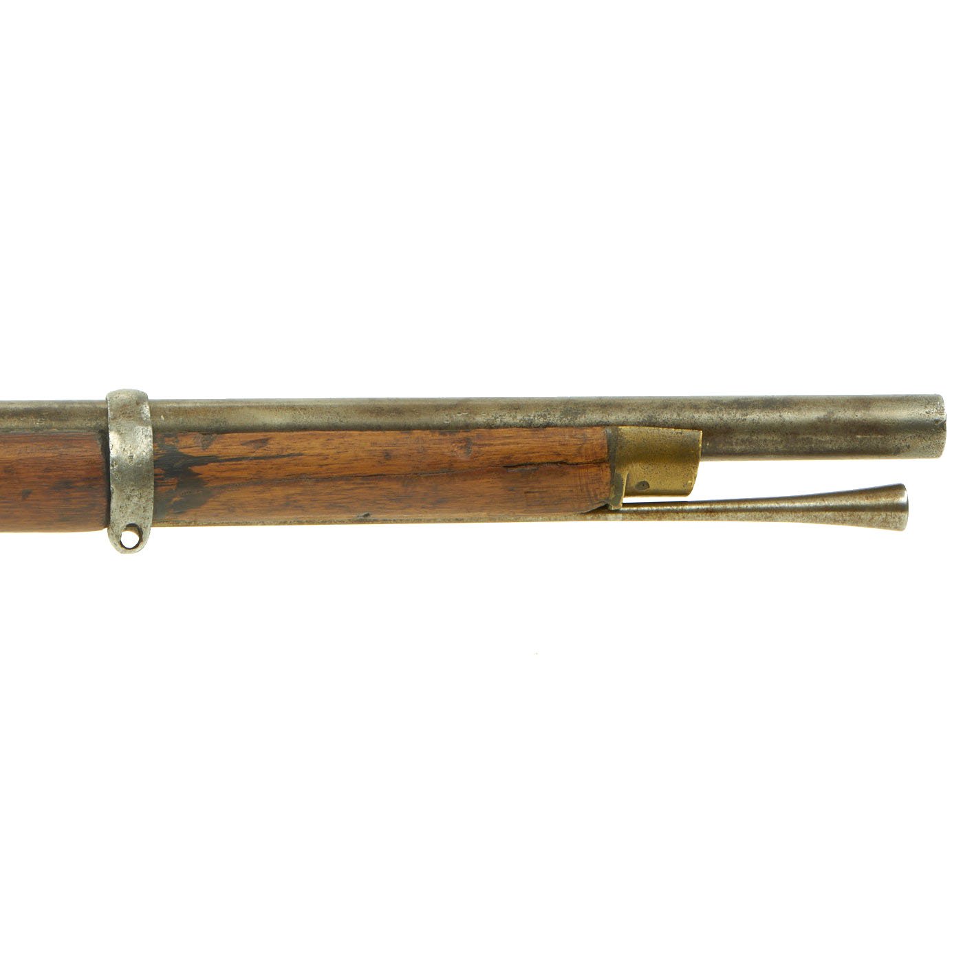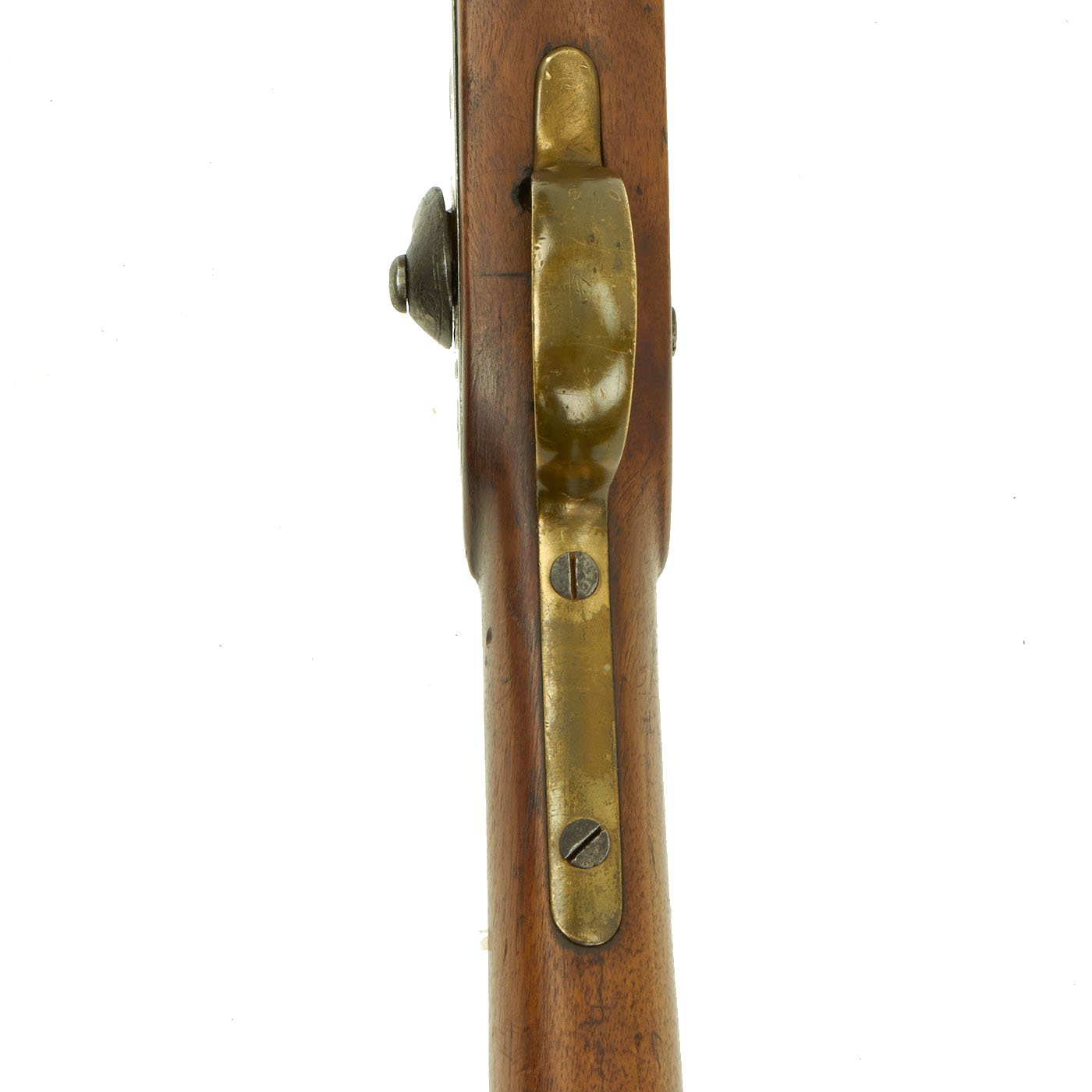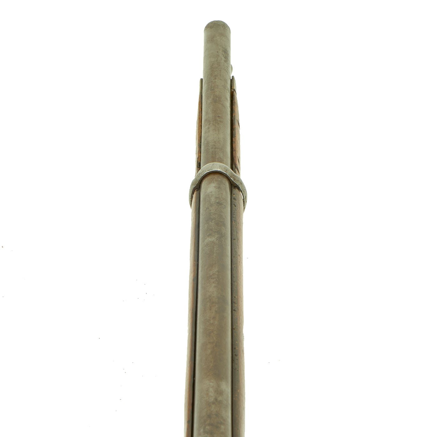 The gun is in good condition, with a nice stock and metalwork with a lovely oxidized patina. It does show signs of past pitting and powder burn, especially near the cap bolster. Both sling swivels are now removed, and the upper barrel band does not look to have ever had one, so it may be a replacement. The cleaning rod has been replaced with an earlier pattern type cut off at the end, most likely from a Springfield Musket. The bore is clear, but there is little trace of the original rifling left, probably due to wear. The lock is functional, however it will fire at both half and full cock, so the tumbler is worn.