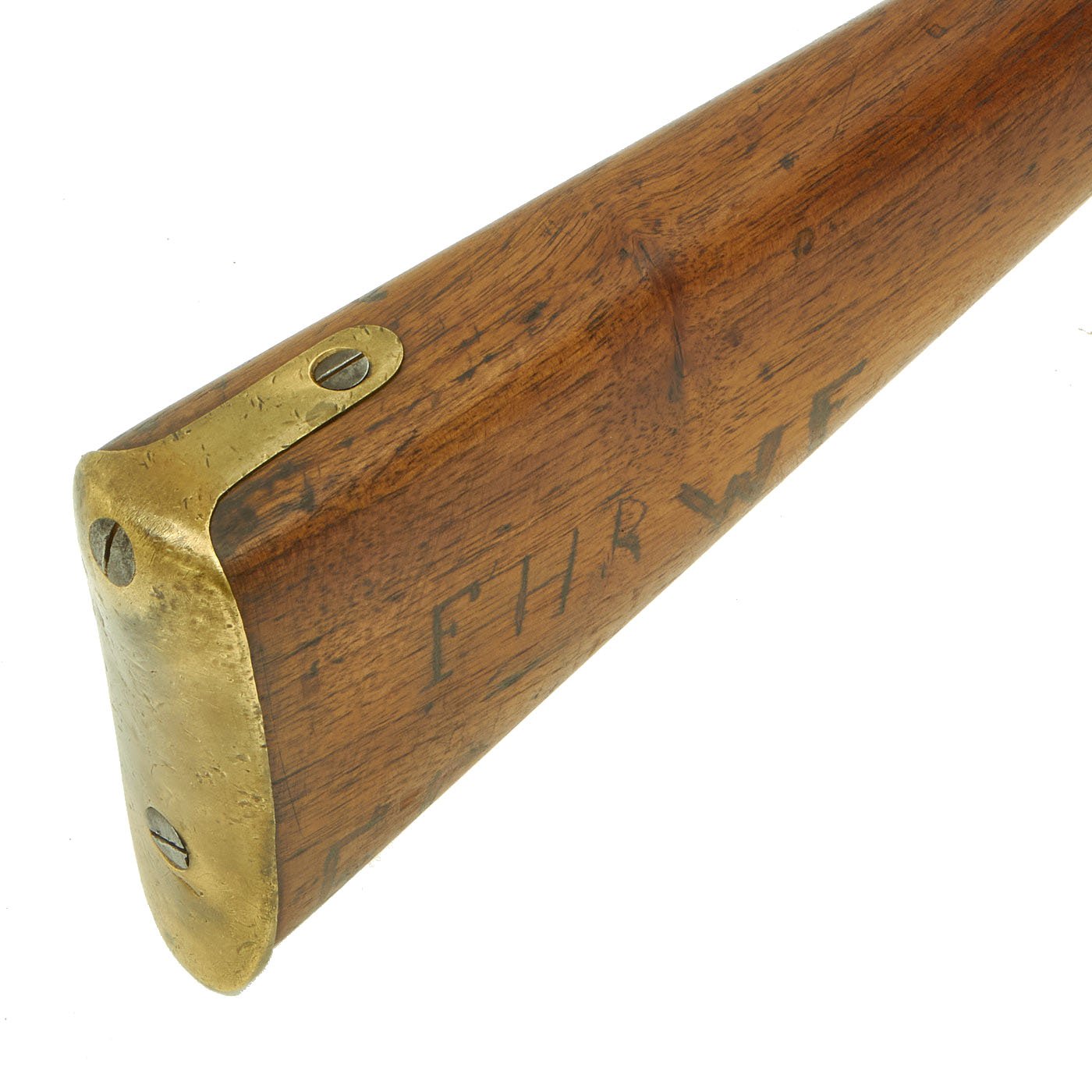 This example also has some wonderful personalization markings dug into the right butt stock, which were later covered with filler during servicing. They are however still visible, and there are three sets of initials: G F, F H R, and W F. It was very common for Confederate soldiers to personalize their weapons in this way. Possibly they were initials of the soldiers who carried this weapon into battle. There are additional scratched in markings on both sides of the butt stock, which we cannot quite make out.