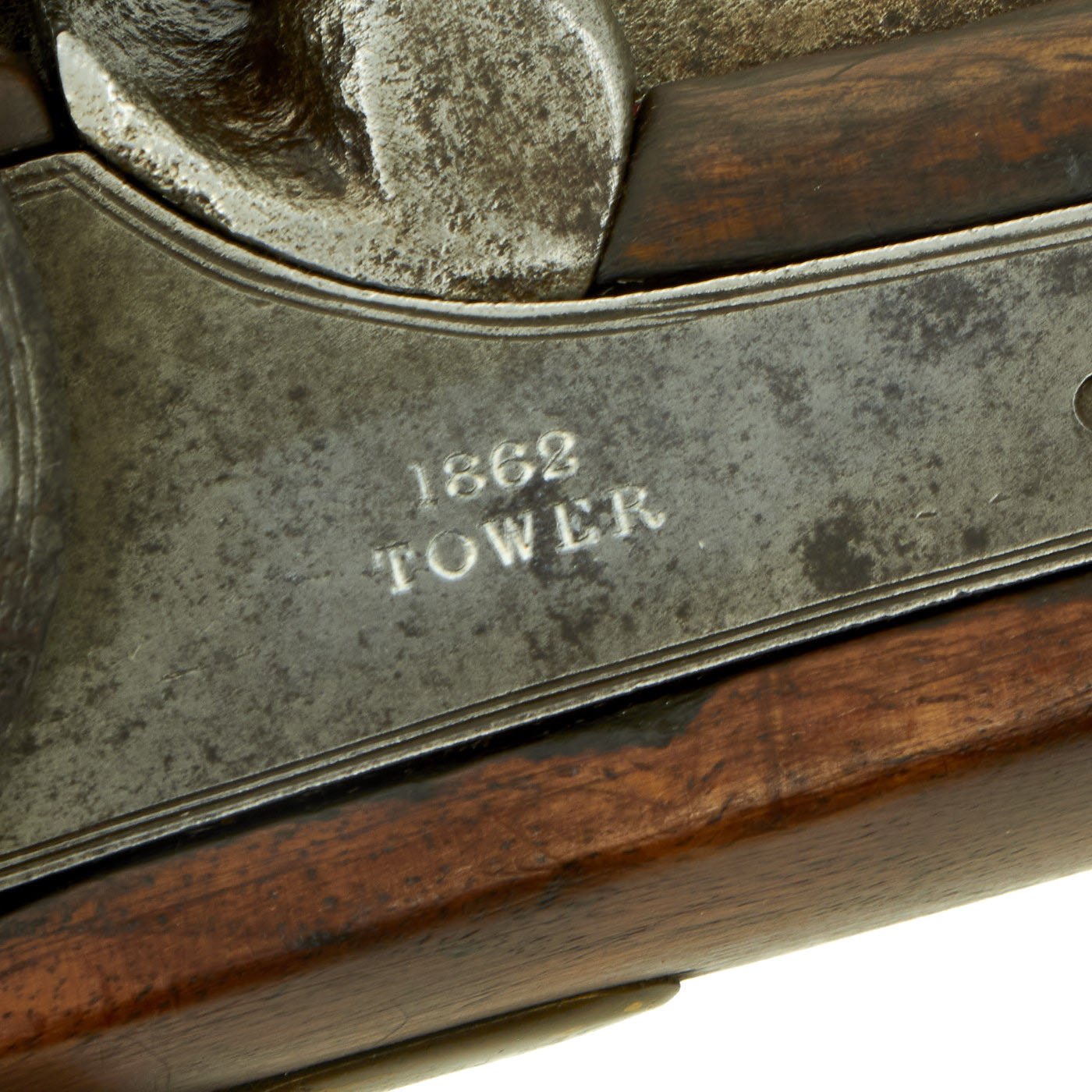 The lock is marked 1862 / TOWER below the cap bolster, and it is marked with a QUEEN'S CROWN to the rear of the hammer. However, there is no "V.R." under the crown. This indicates that this weapon was not intended for a British Military contract but was aimed at the Overseas market, most specifically the United States, who were embroiled in its most terrible Civil War.
