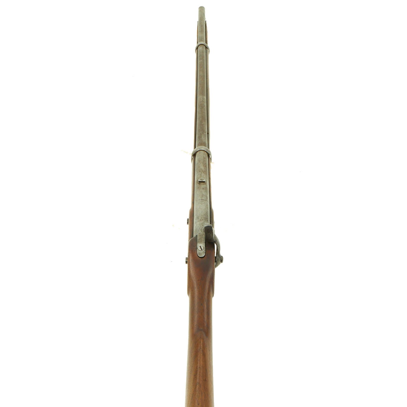 The original rear sight was removed long ago, though the location of the base can still be seen on the upper surface of the barrel, and a simple V notch sight has been added in its place. We suspect that this rifle saw use after the war, possibly as a hunting or fowling gun. The front band is missing the screw, and the stock is partly cracked at that point, with some wood filler used under the band to stabilize the break.