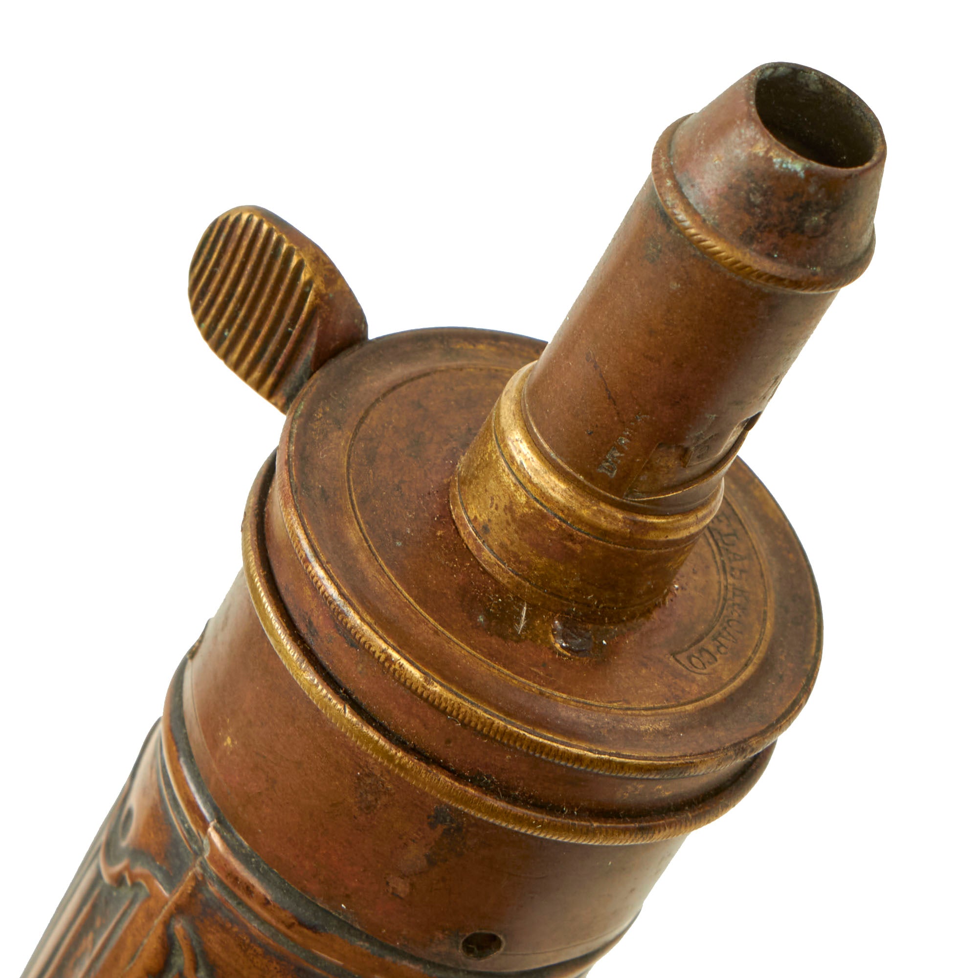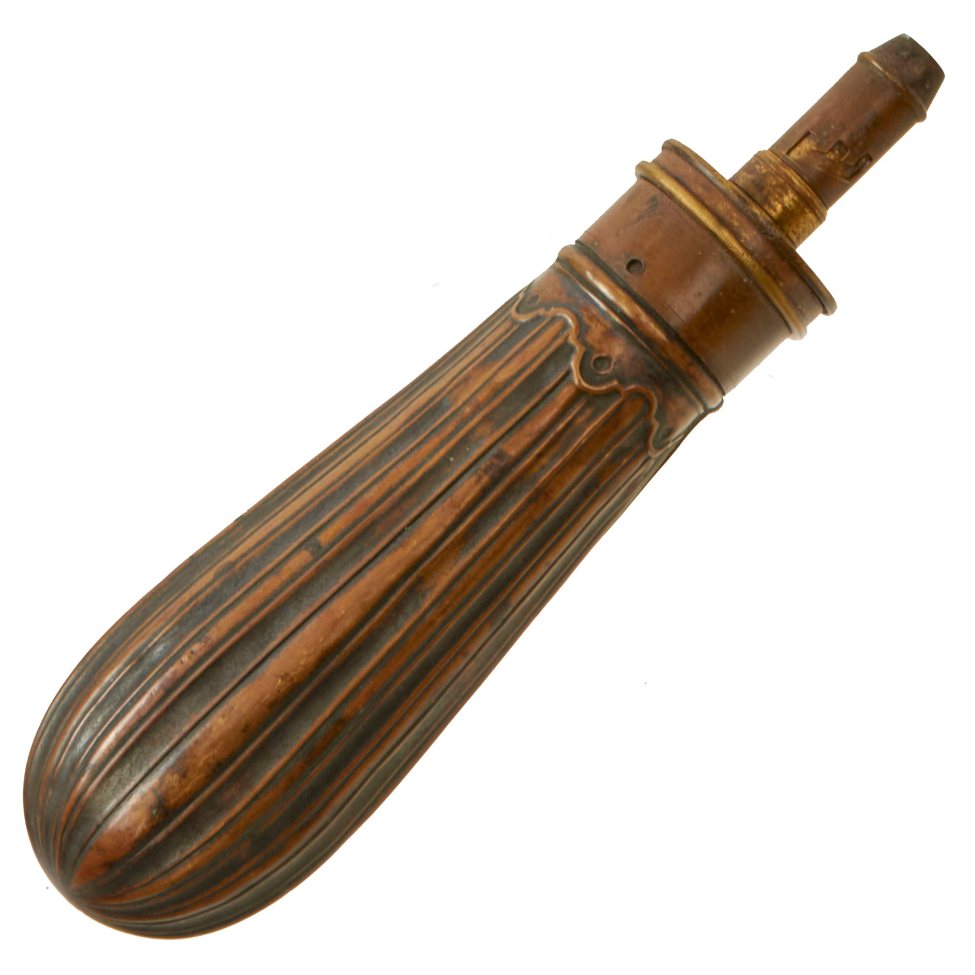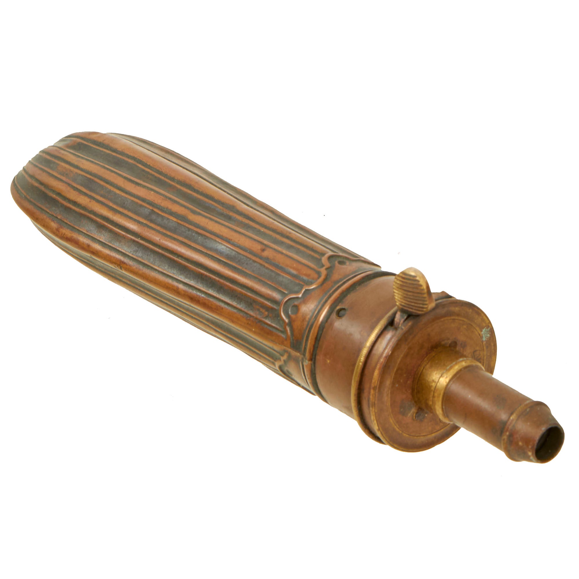 Original Item. Only One Available. This is a stellar embossed copper powder flask manufactured by the American Flask & Cap Company, which was a short-lived manufacturing company that only produced flasks from 1857 until its dissolution in 1865. This example has a very nice fluted design and is a smaller piece.