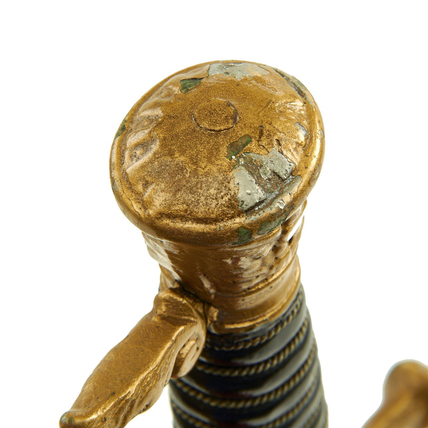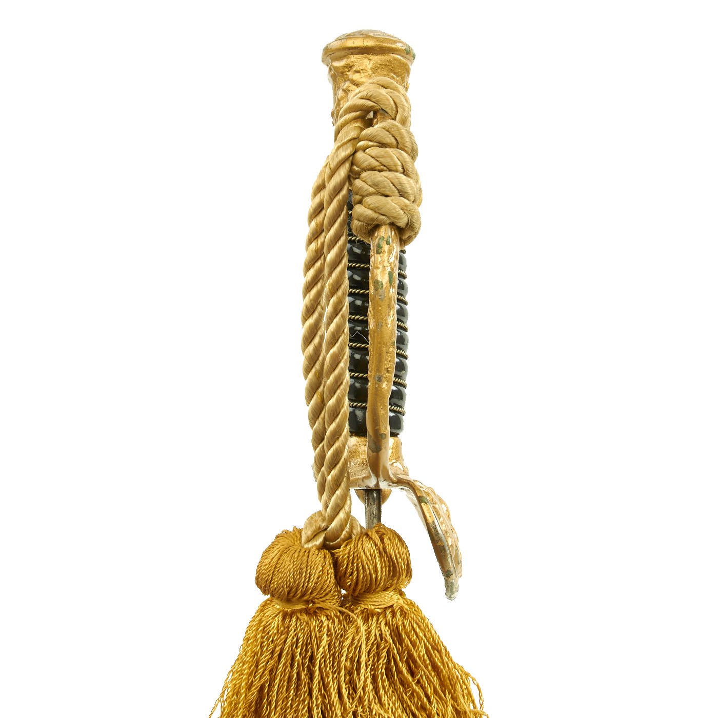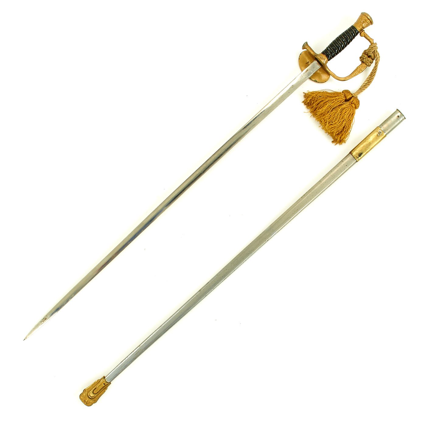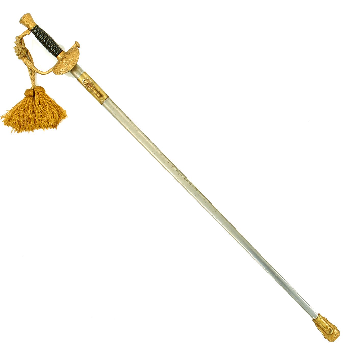 The sword measures 35 1/4" overall, and the hilt and "shell" Guard are bronze/brass and the grip is wire wrapped black composition material, which may have been painted over. The wiring is twisted, and in really good shape. It does look like at some point a previous owner painted the entire hilt with gold paint to improve the appearance, covering the original metal. The guard has a lovely sword knot installed, though this may be a more recent addition from when the hilt was painted.