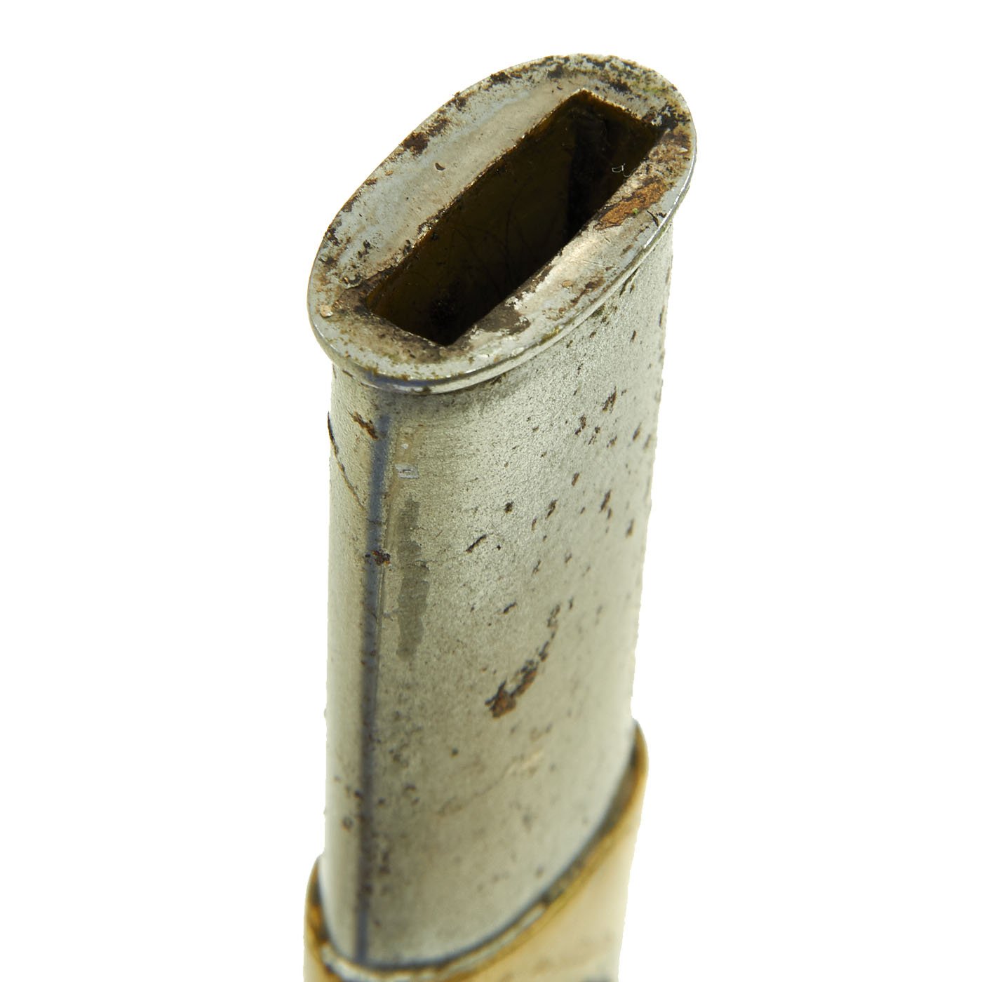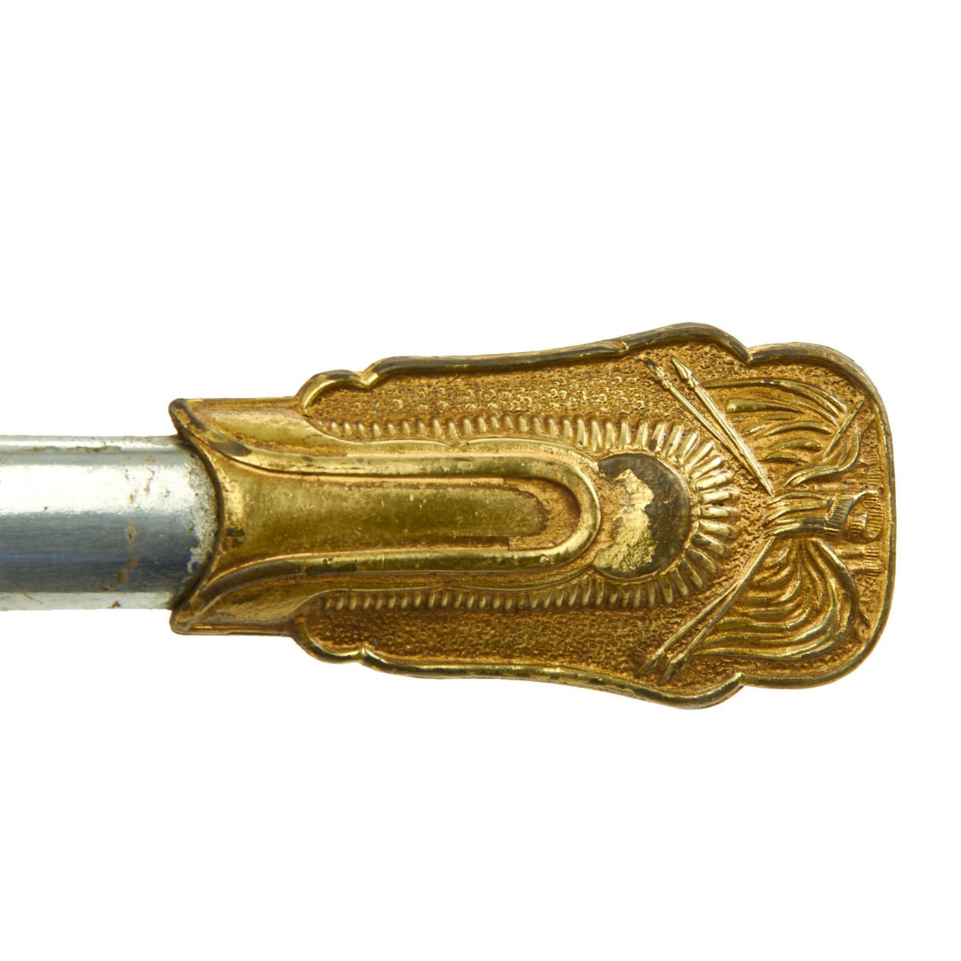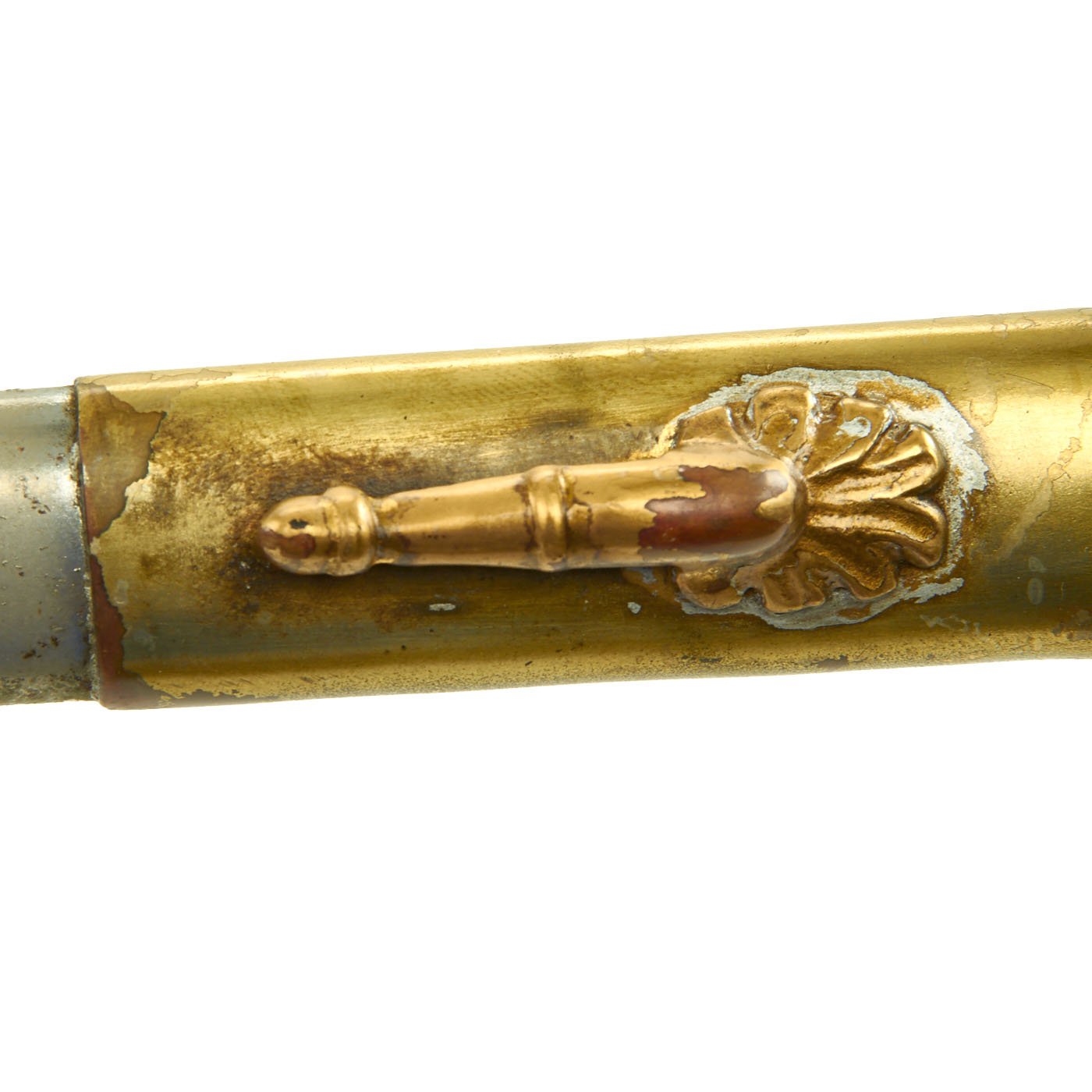 It comes in its original decorated brass mounted steel scabbard, which has a very nice plated finish and a lovely patina. Scabbard is straight, with no real dents that we can see. The retaining screw for the end fitting is missing, so it could potentially fall off.