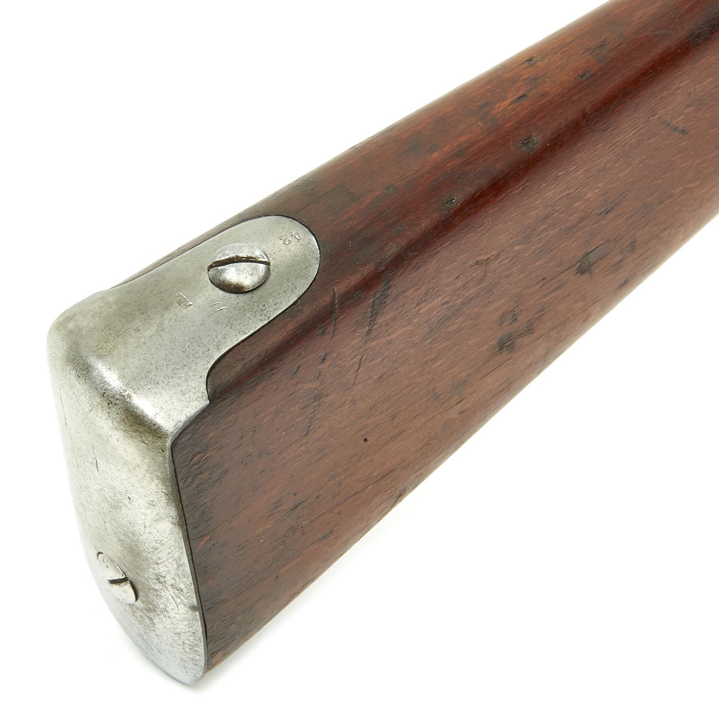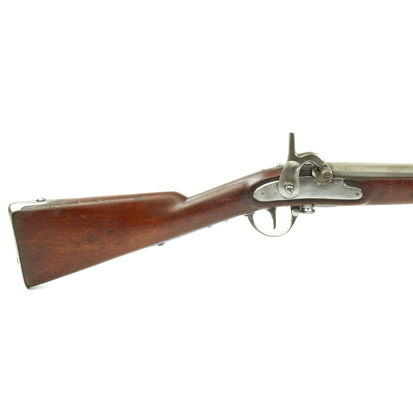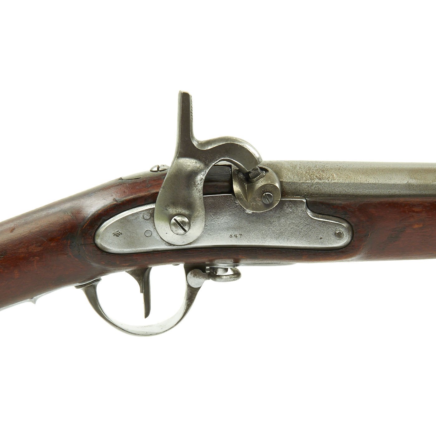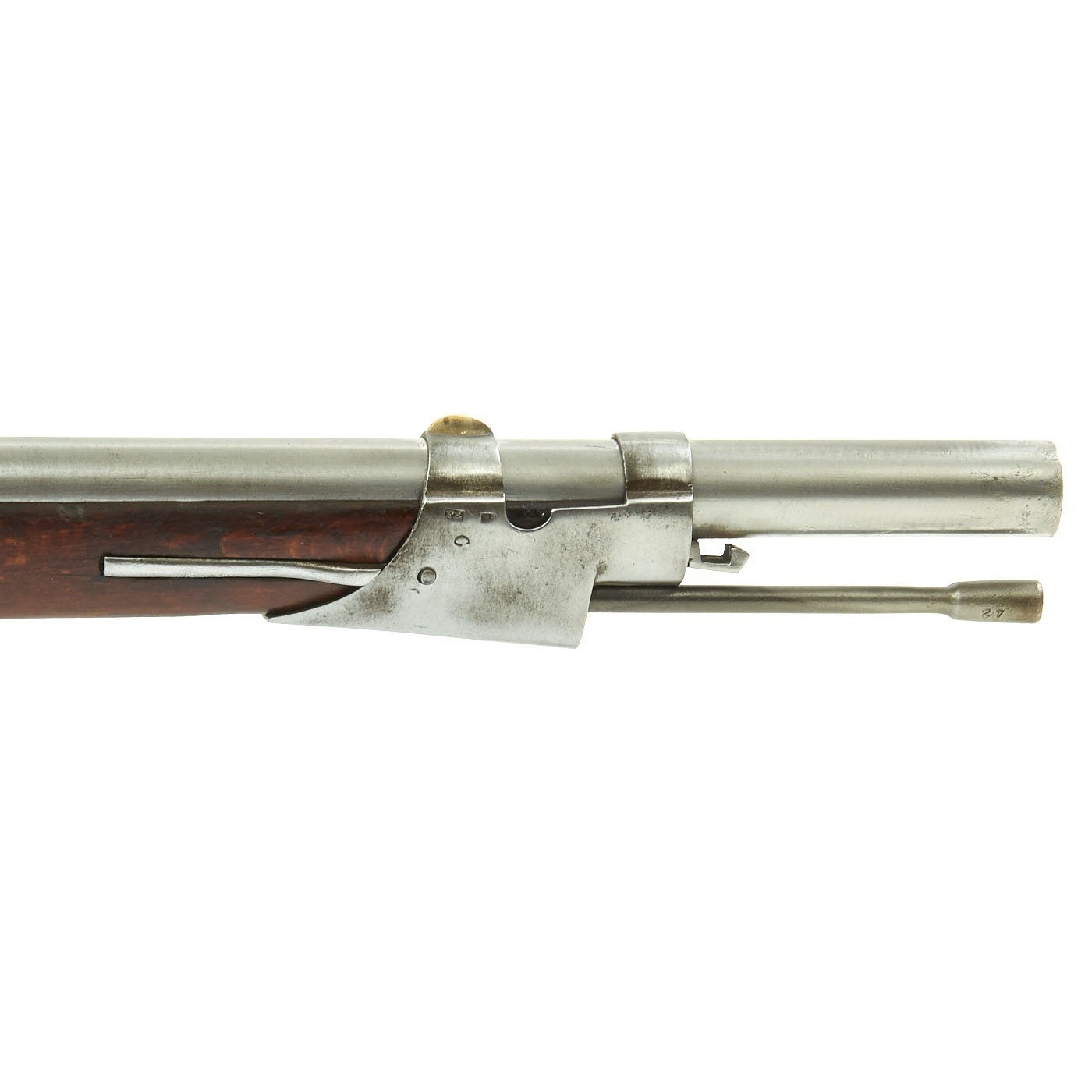 The musket measures just shy of 58" in overall length, the .71 caliber barrel measuring 42". The wood stock is quality walnut and the mounts are all iron. The long lock plate has a cutout for a flintlock pan, indicating this was originally manufactured as a flintlock. The later models did not have this cutout. There is a clear 847 on the lock plate, the standard Austrian designation for year 1847. There is also the Austro-Hungarian Empire's Eagle marked on the lock plate tail. The barrel and most fittings of the gun are also marked with the number 42, most likely a matching number.