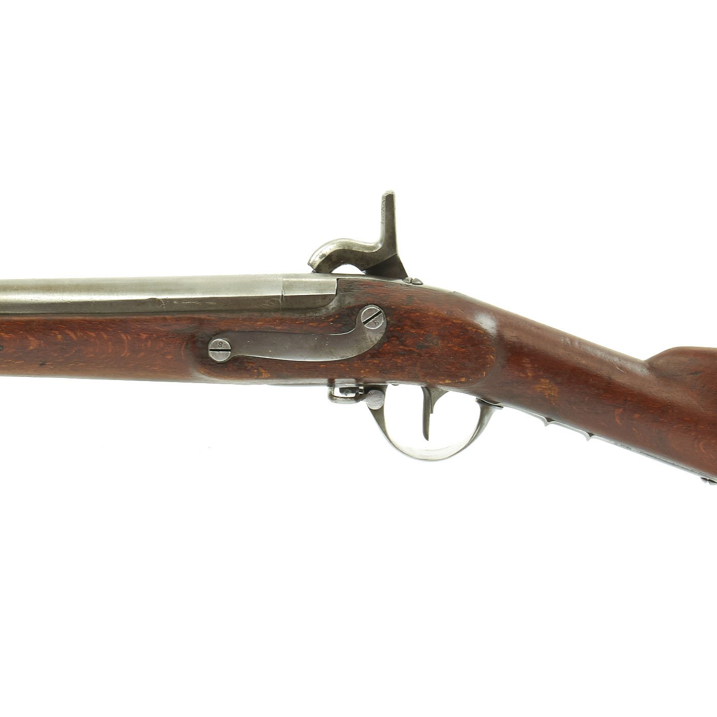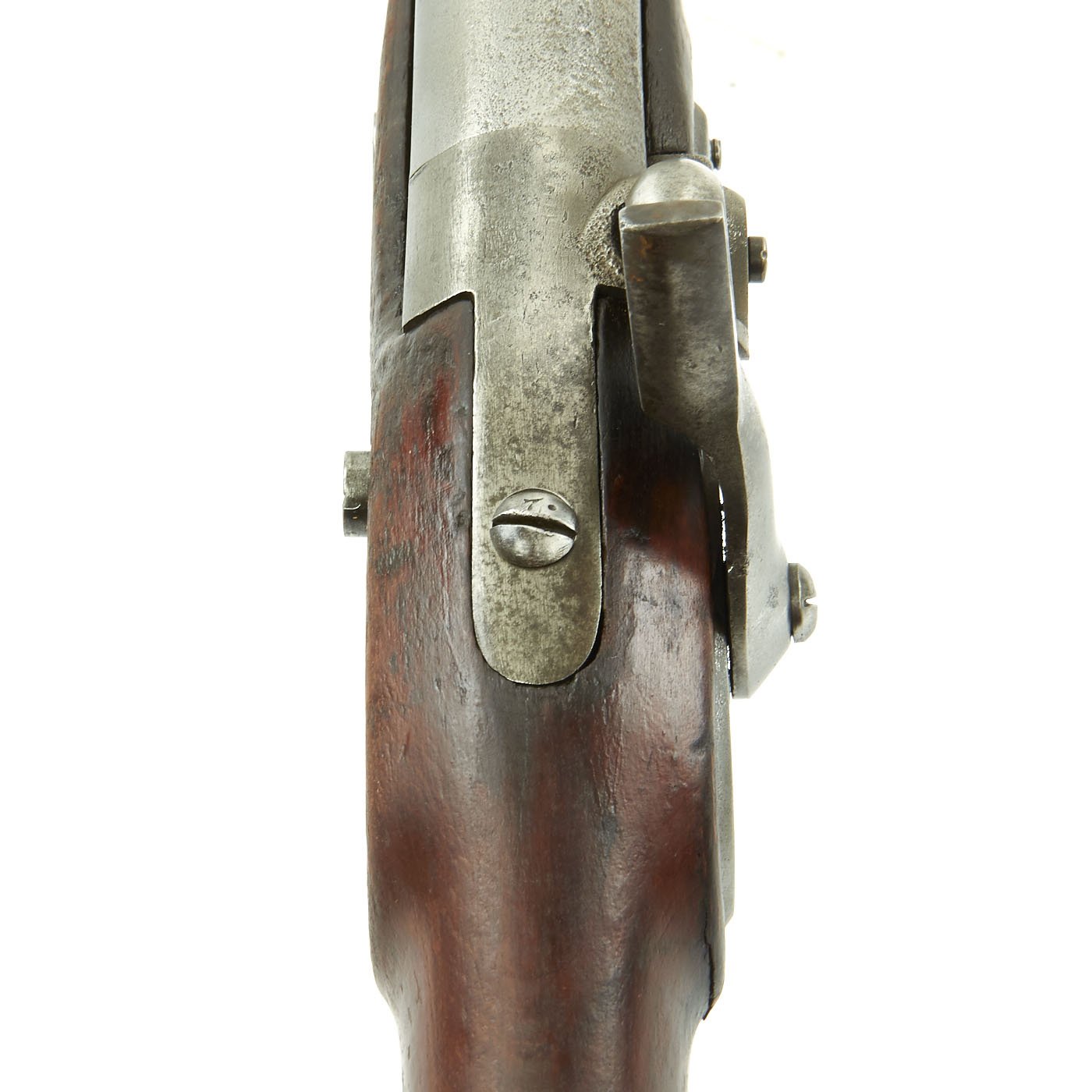 The musket is in very good condition, and looks great. It still has both original sling swivels and the stock looks great, with no major structural issues. The lock functions correctly, holding at half cock, and firing at full. There is powder burn around the breech area, but much less on the newly installed percussion breech plug, so this musket definitely saw service in flintlock and percussion.