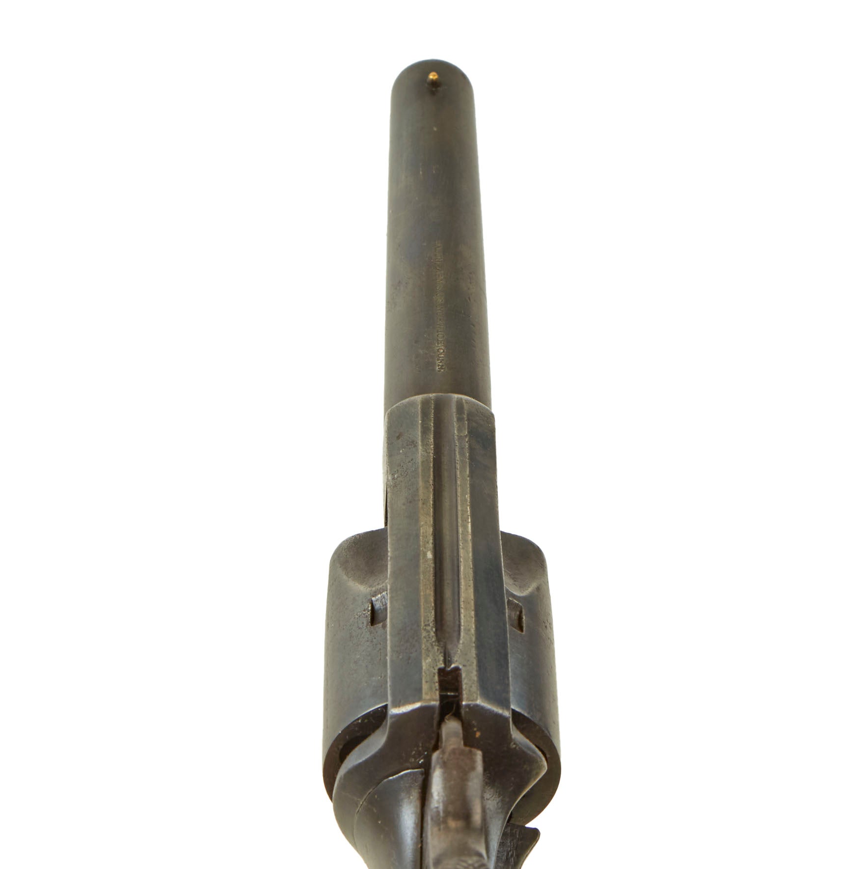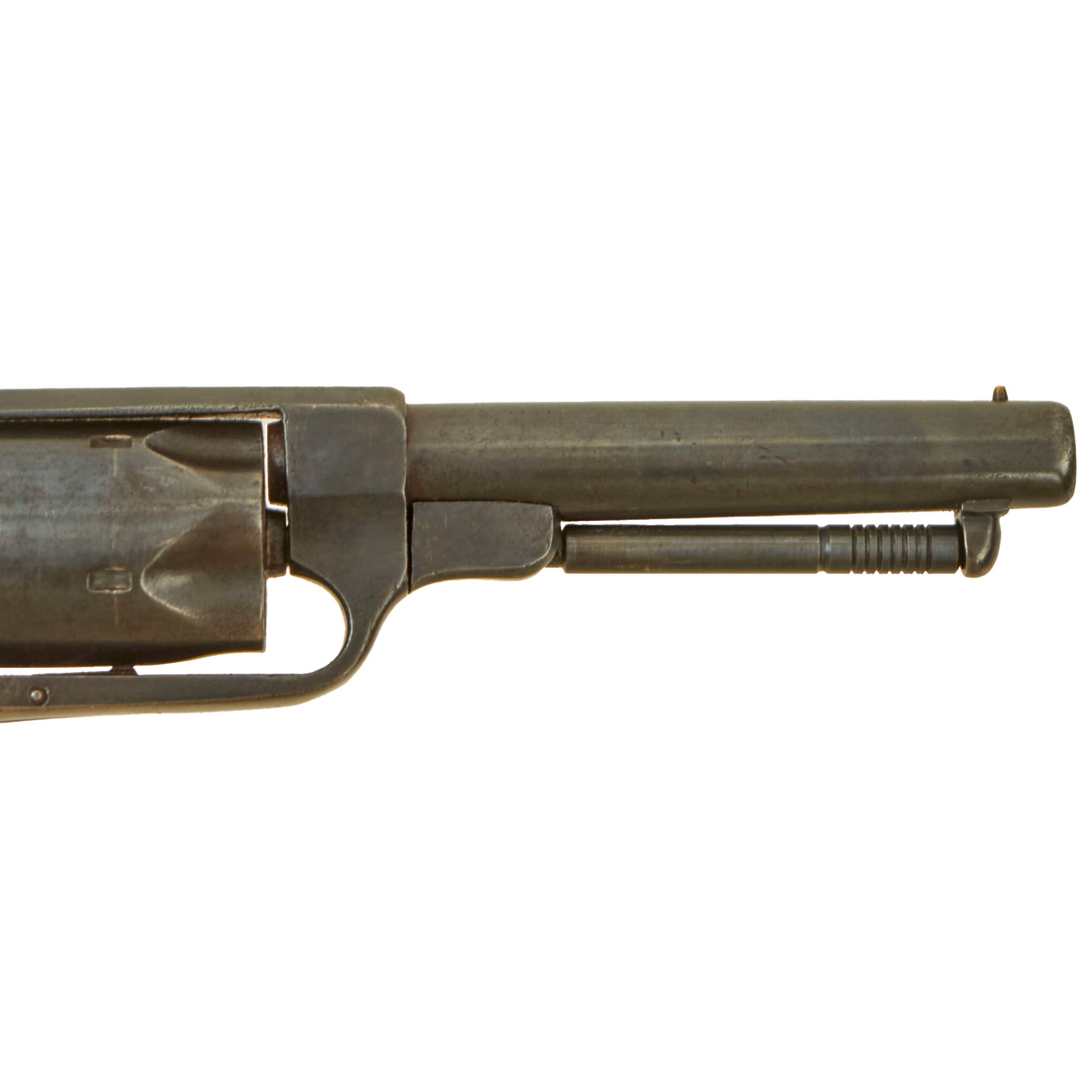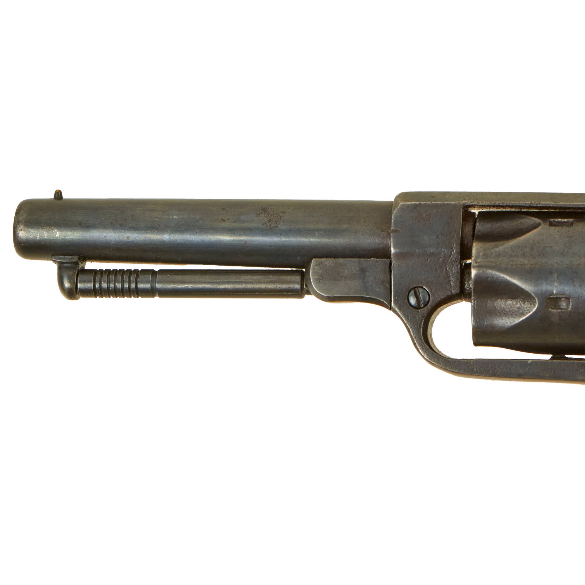 Condition is very good, still displaying much of the original blued finish on the barrel and cylinder, while the frame and grip area shows some wear to a gray patina from handling. The original Bacon address marking is still visible on top of the barrel, and we do not see any signs of refinishing: