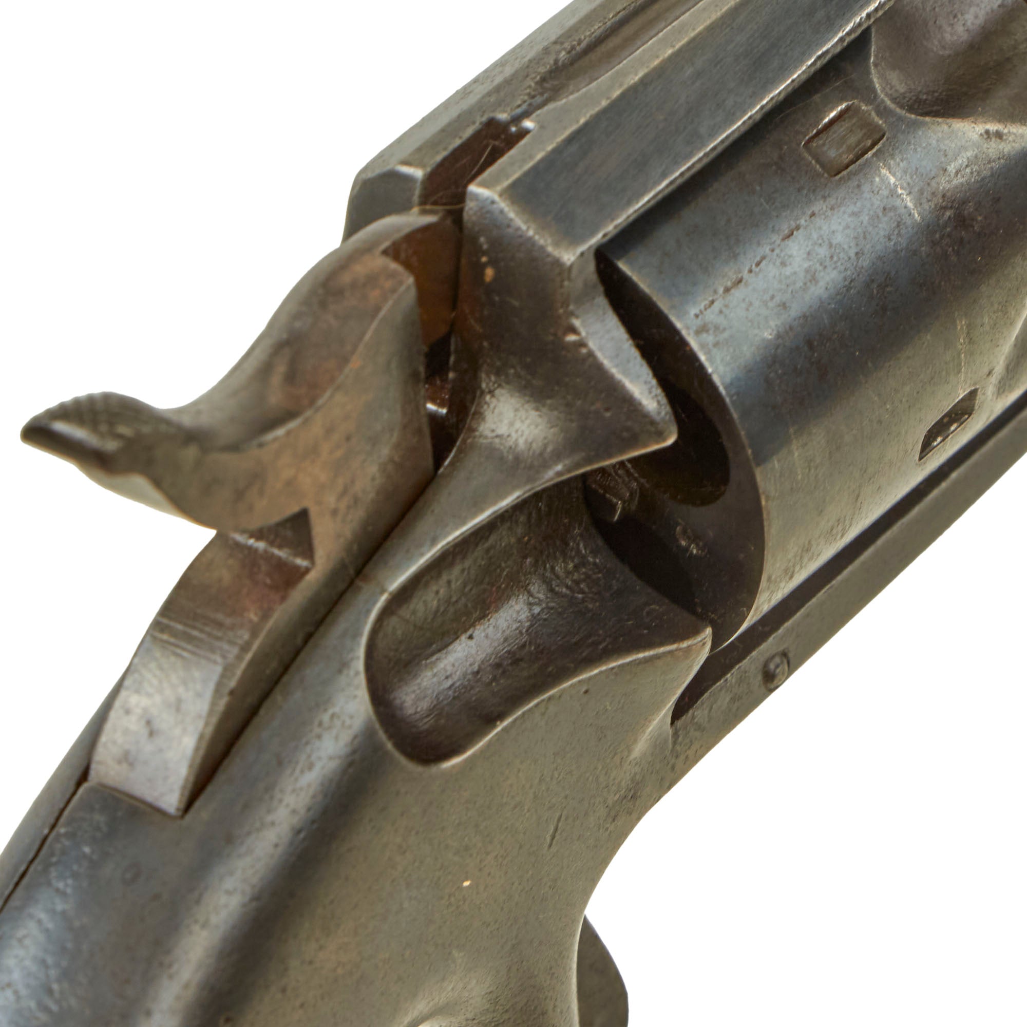 The serial number on this example is 356, found on the frame under the grips, the rear of the cylinder, the bottom of the barrel, the trigger, and on the cylinder arbor pin. There is no serial number marking on the grips, which looks to only have been used on later production examples, which makes this a very nice "ALL MATCHING" example, with no parts swapped out during its service life.