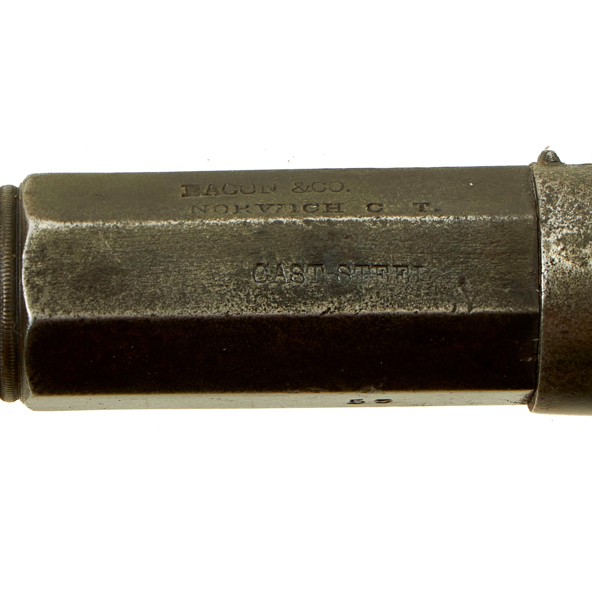 Thomas K. Bacon was a very ingenious gunmaker in the mid 19th century, though sadly he never never achieved the level of success that his designs warranted before his death in 1873. He associated with several different New England gunmaking firms, including Ethan Allen, Allen and Thurber, and three other companies which bore his name. He originally had been a "jobber" for Ethan Allen, also of Norwich, but when that company moved to Worcester, Bacon opened "Bacon & Company", which was a manufacturer of single-shot, underhammer, and pepperbox pistols. Unfortunately this venture did not turn out successfully, and after a failed attempt to raise capital, closed in 1857.