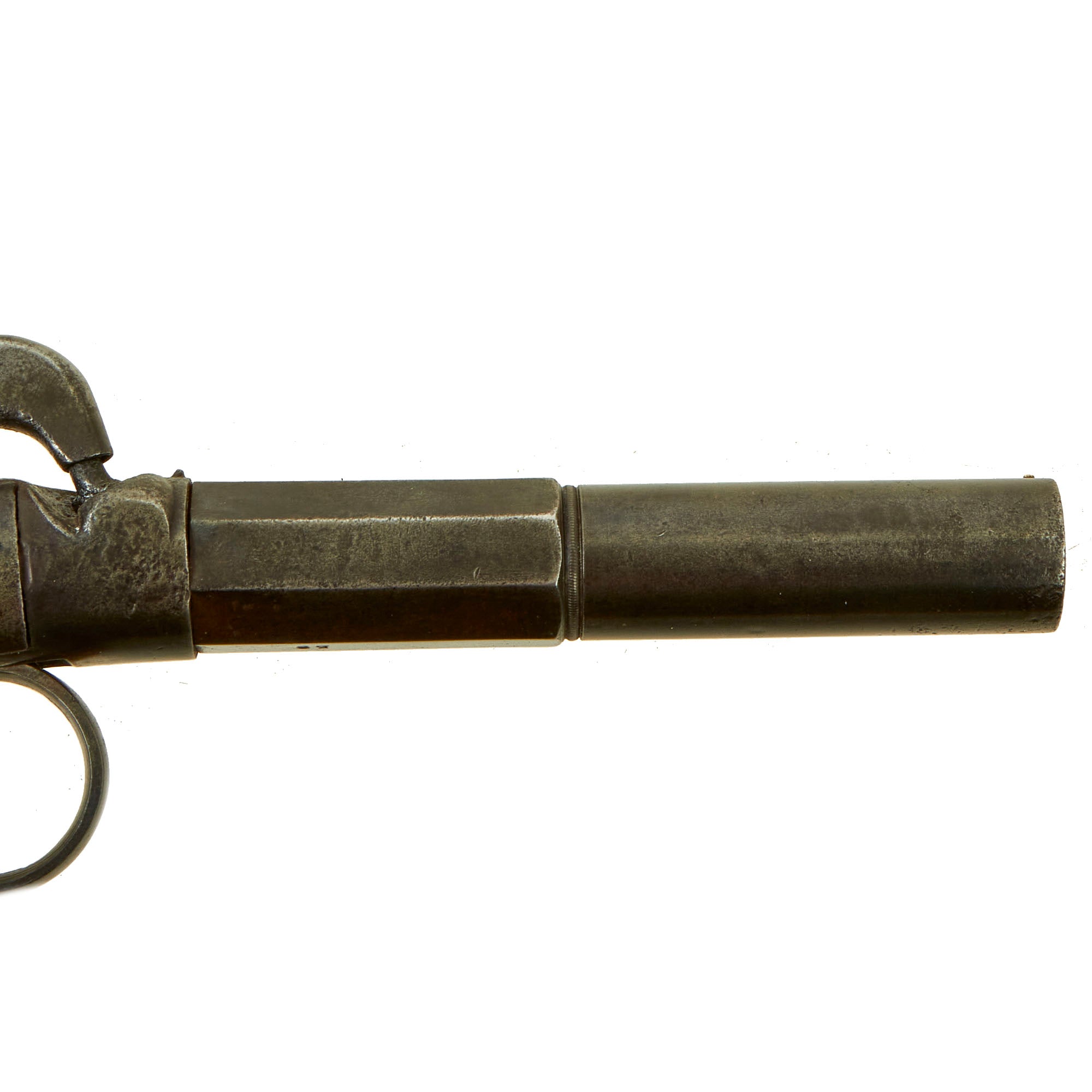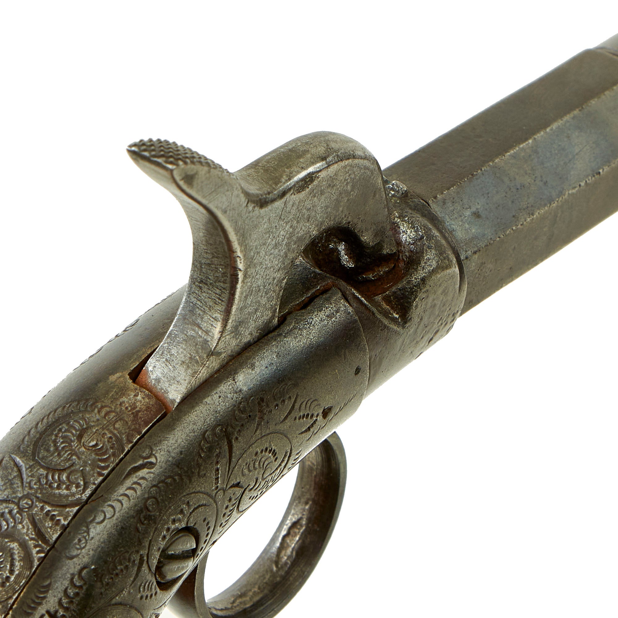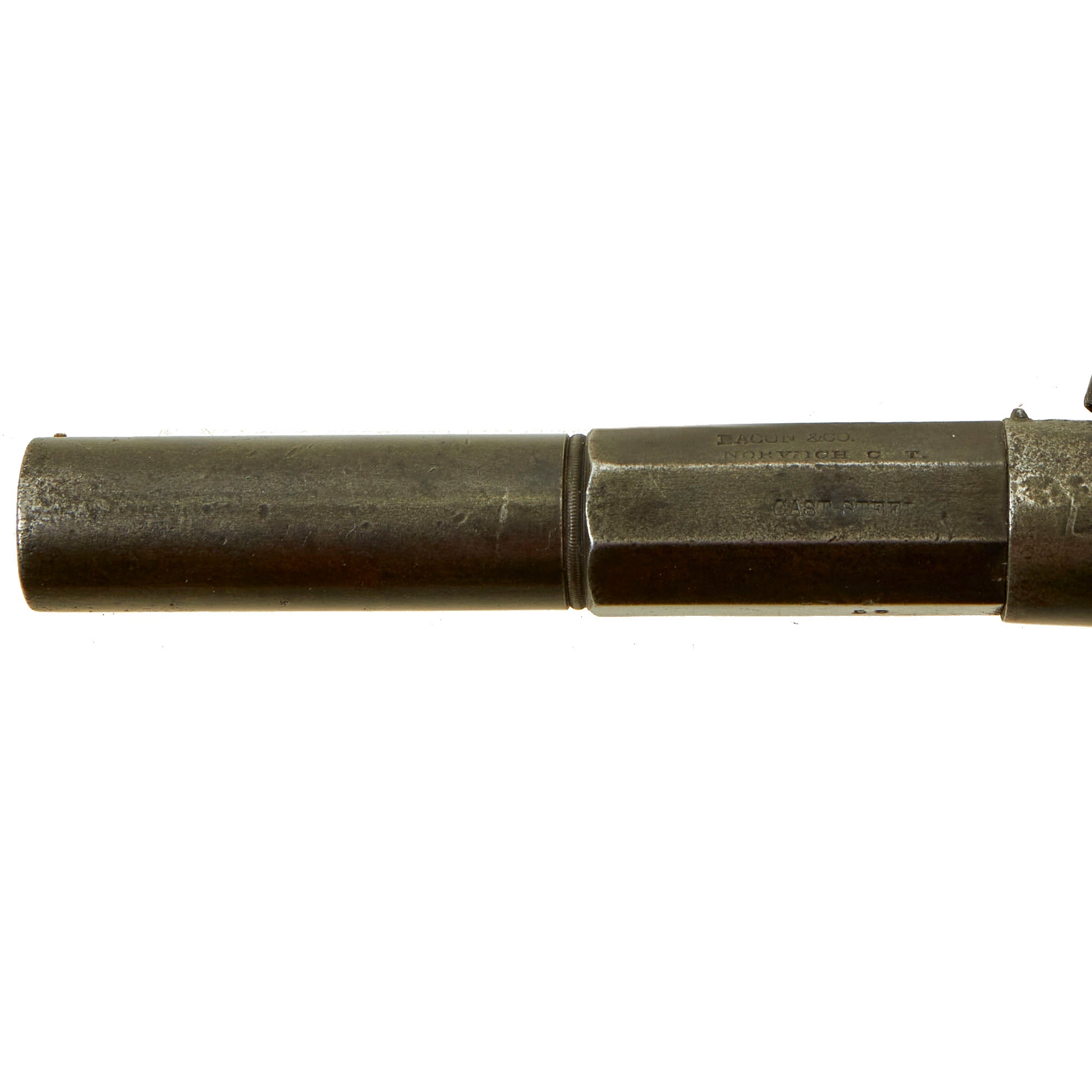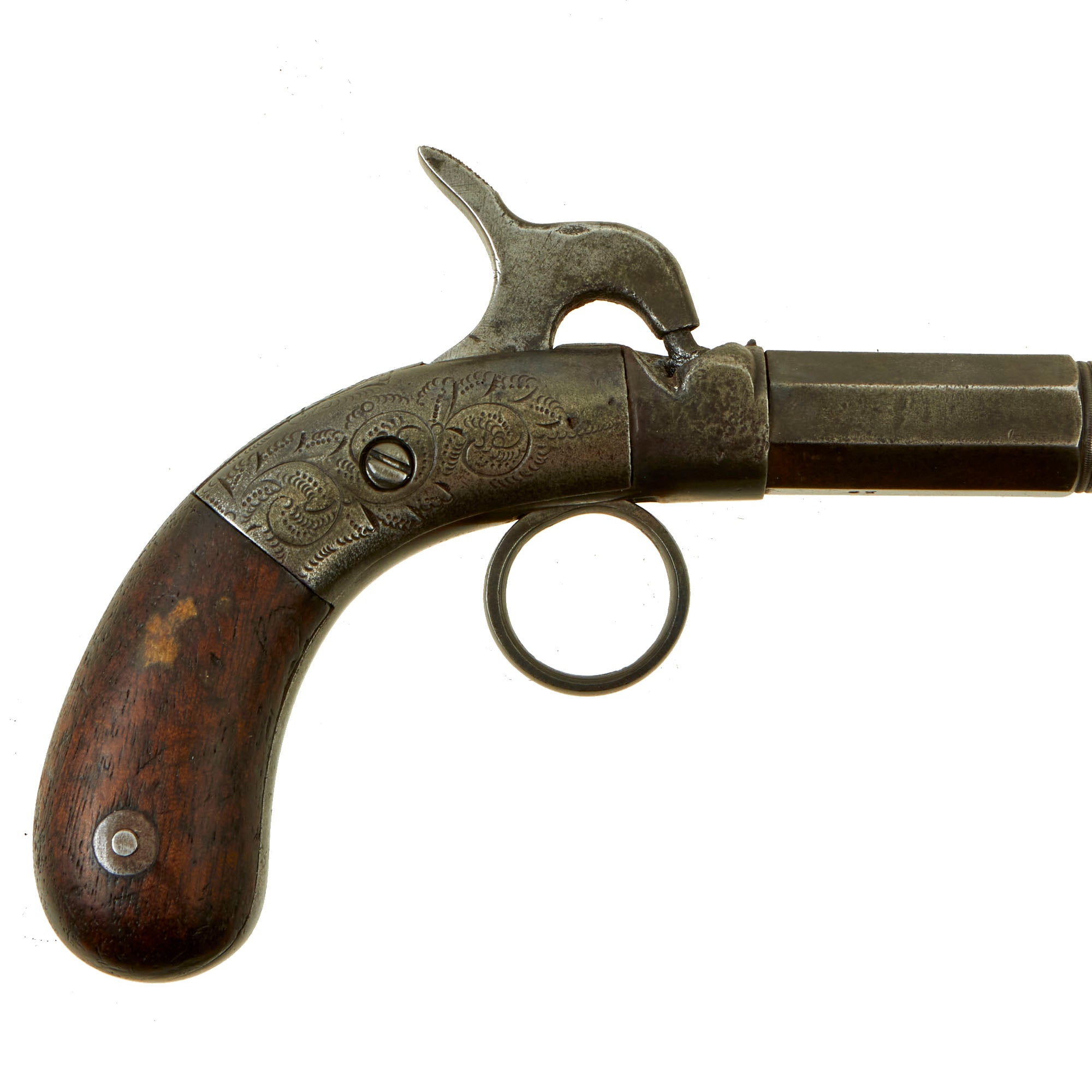 Original Item: Only One Available. Here is a very cute .34 caliber percussion "Boot Pistol", made by the Bacon Manufacturing Company. Thomas K. Bacon had been a gunsmith working with the Manhattan Firearms Manufacturing, and then left to found his own company Company and established the Bacon Manufacturing Company in Norwich, Connecticut. They quickly began manufacturing percussion revolvers, as well as some small single shot pistols, including "boot pistols". These seem to have been available in both standard and underhammer designs, and this is a very nice example of the former, with a lovely ring trigger.
