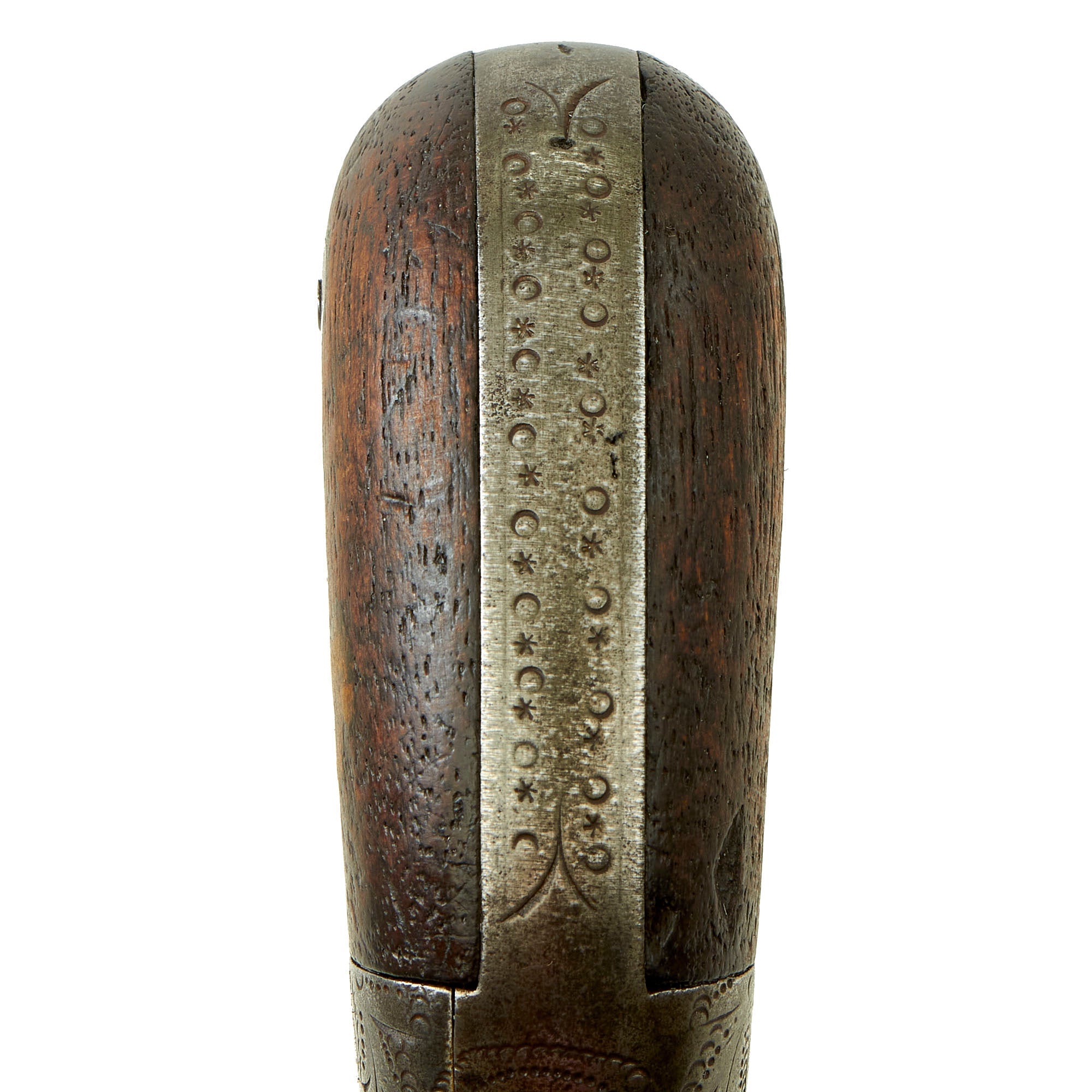 The pistol has some lovely engraving on both sides of the action, and also has a lovely "ring trigger", which would not get stuck on the inside of a boot, and also helps to hold the pistol more securely. The tumbler does not have any provision for the half cock position, and the lock functions well. The barrel still shows clear rifling, but also some wear and oxidation from use and powder fouling. Overall the finish shows a nice aged patina, with the engraving still well retained. The grips do show some wear, in line with the condition of the rest of the revolver.