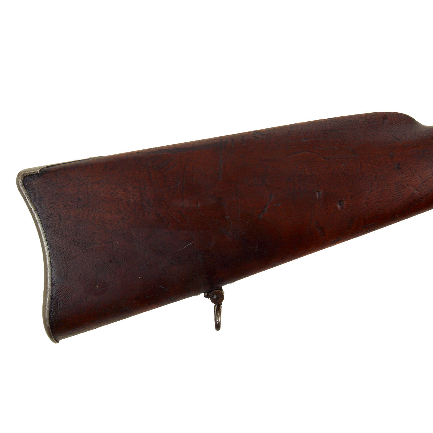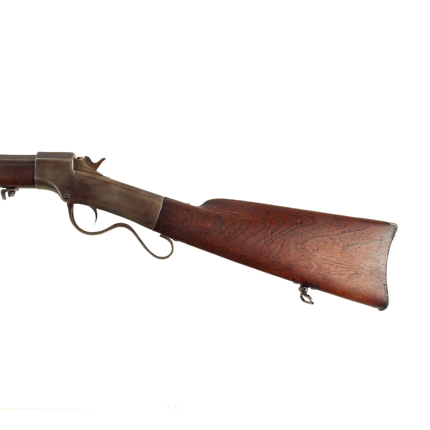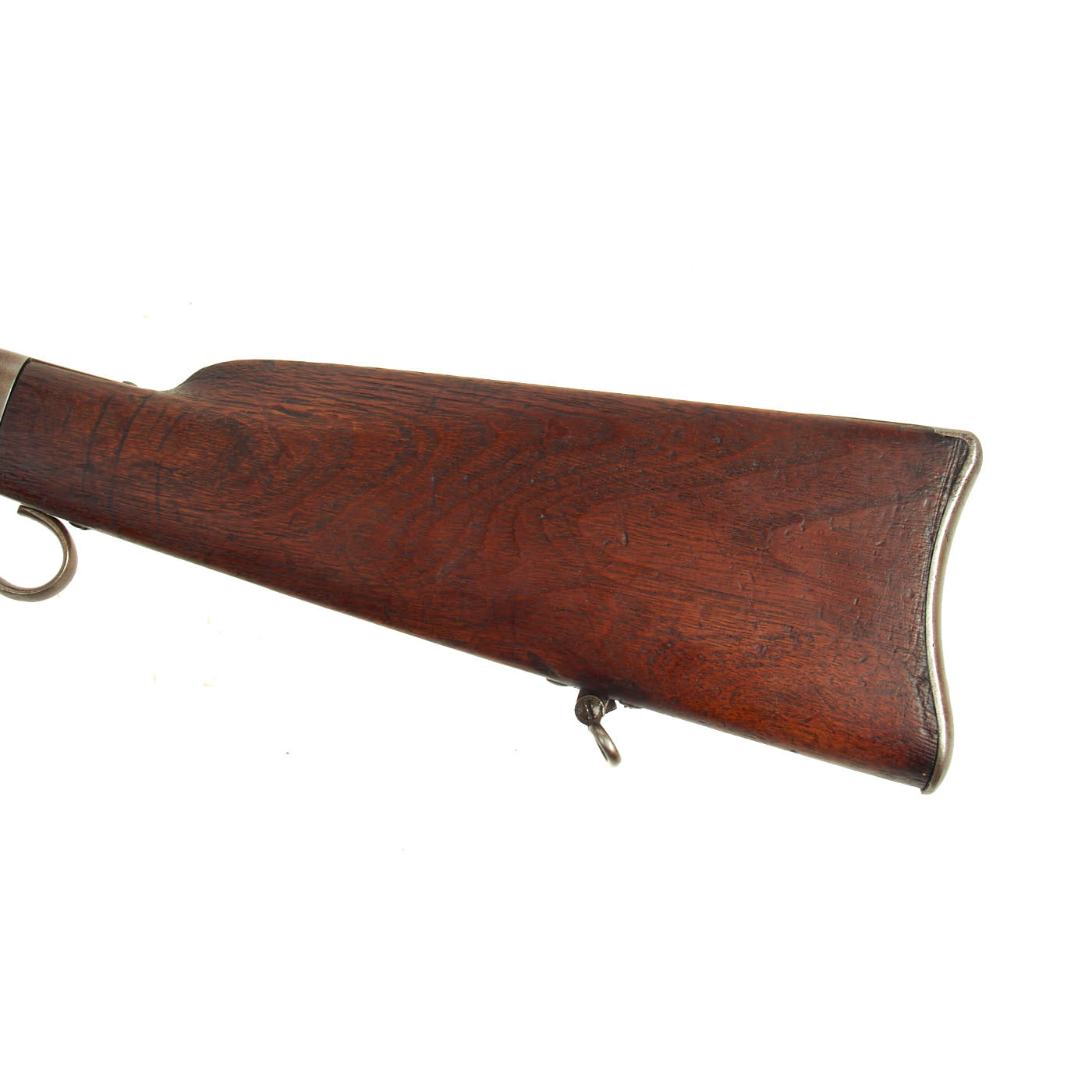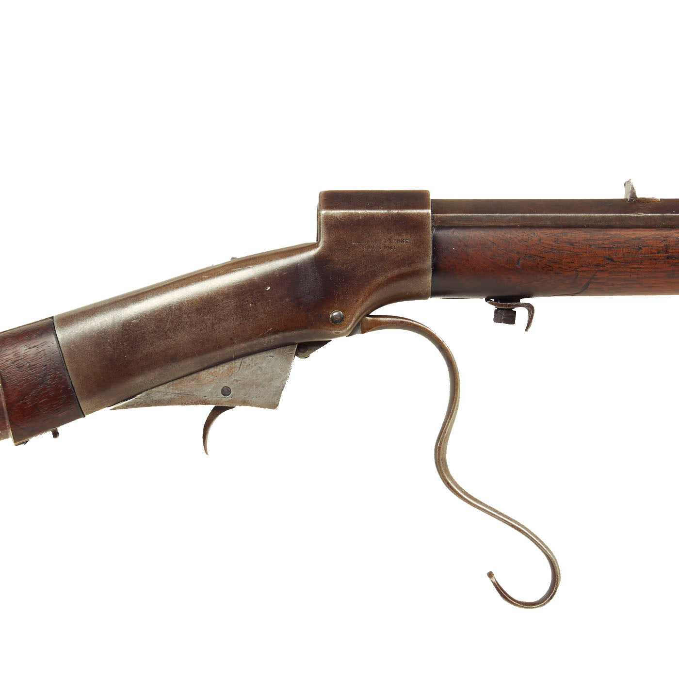 Original Item: One Only. The Ballard is a single-shot, breech loading firearm used late during the Civil War. The .44 caliber, percussion rifle was invented and patented by Charles H. Ballard of Worcester, Mass in November 1861. Produced by the Ball & Williams Company of Worcester between 1862 and 1865, this slightly longer rifle version measures 39” long overall. The butt stock is the same as the carbine, but the fore stock is rifle style, without any barrel band, instead secured directly to the barrel via screws. The octagonal barrel is 24 inches long, and has a sling swivel attached to the bottom, matching the butt stock.