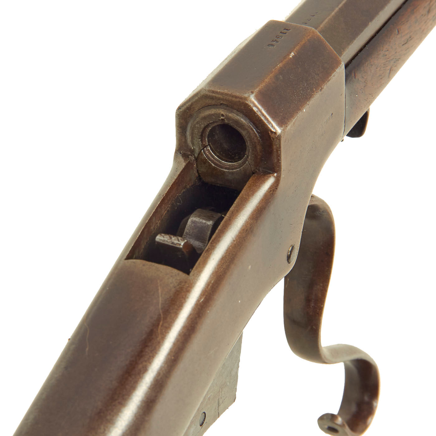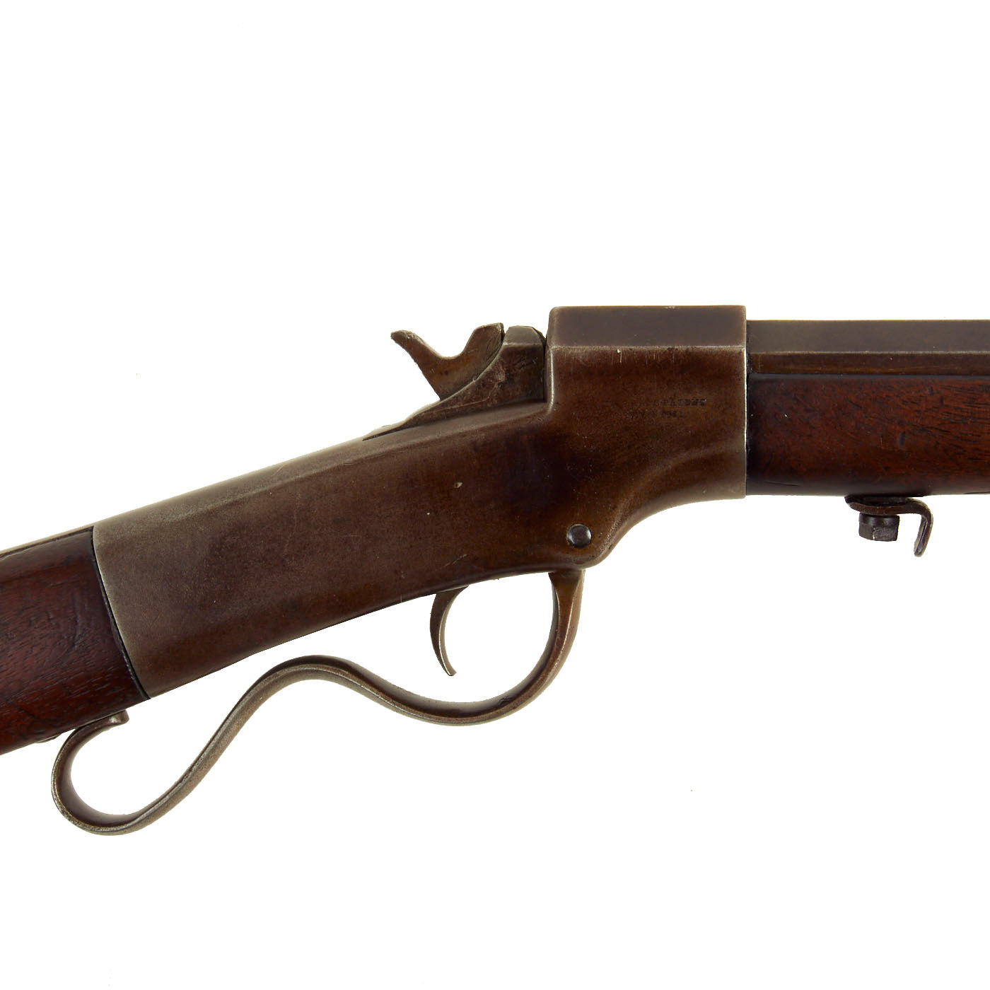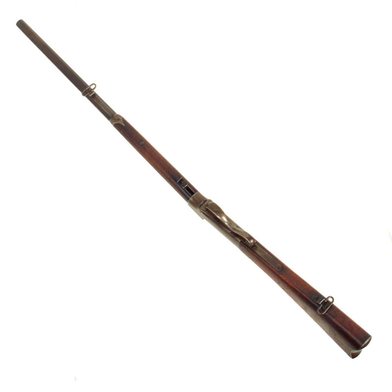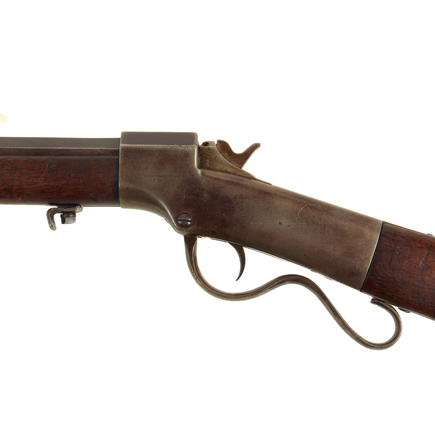 Original Item: One Only. The Ballard is a single-shot, breech loading firearm used late during the Civil War. The .44 caliber, percussion rifle was invented and patented by Charles H. Ballard of Worcester, Mass in November 1861. Produced by the Ball & Williams Company of Worcester between 1862 and 1865, this slightly longer rifle version measures 39” long overall. The butt stock is the same as the carbine, but the fore stock is rifle style, without any barrel band, instead secured directly to the barrel via screws. The octagonal barrel is 24 inches long, and has a sling swivel attached to the bottom, matching the butt stock.