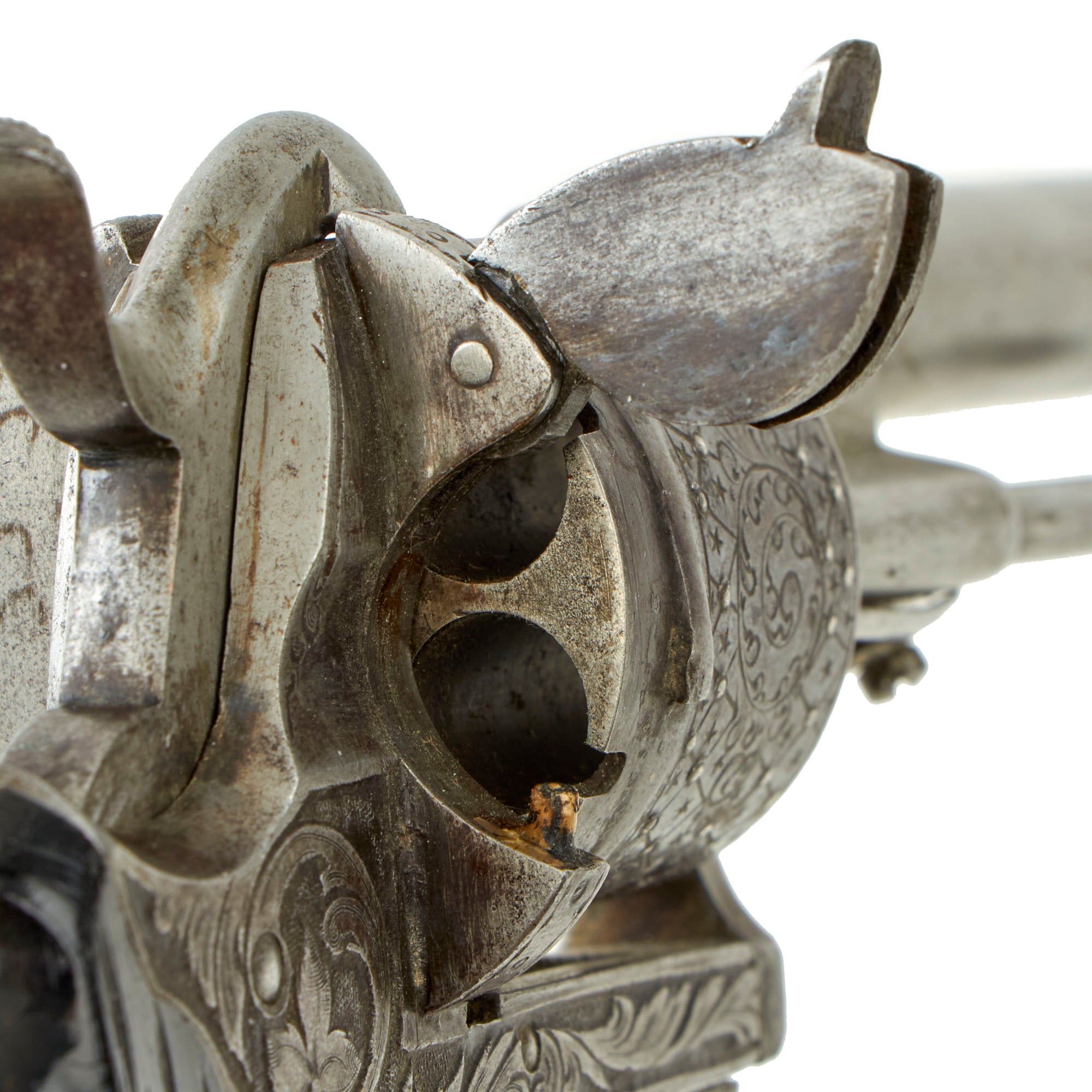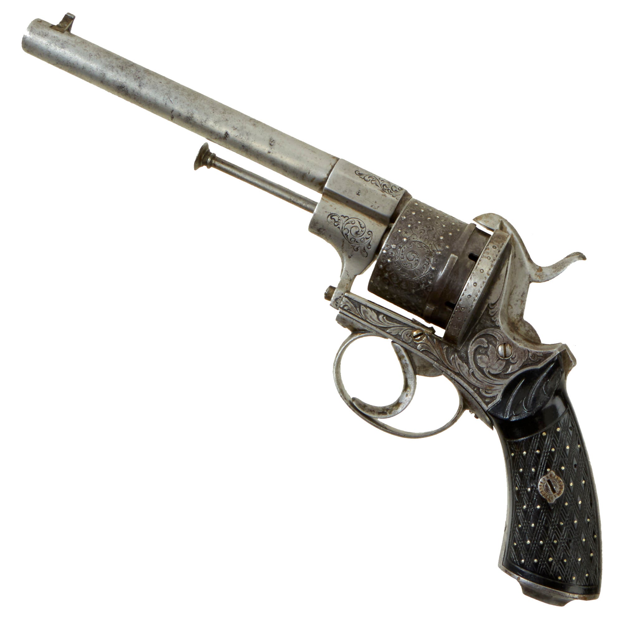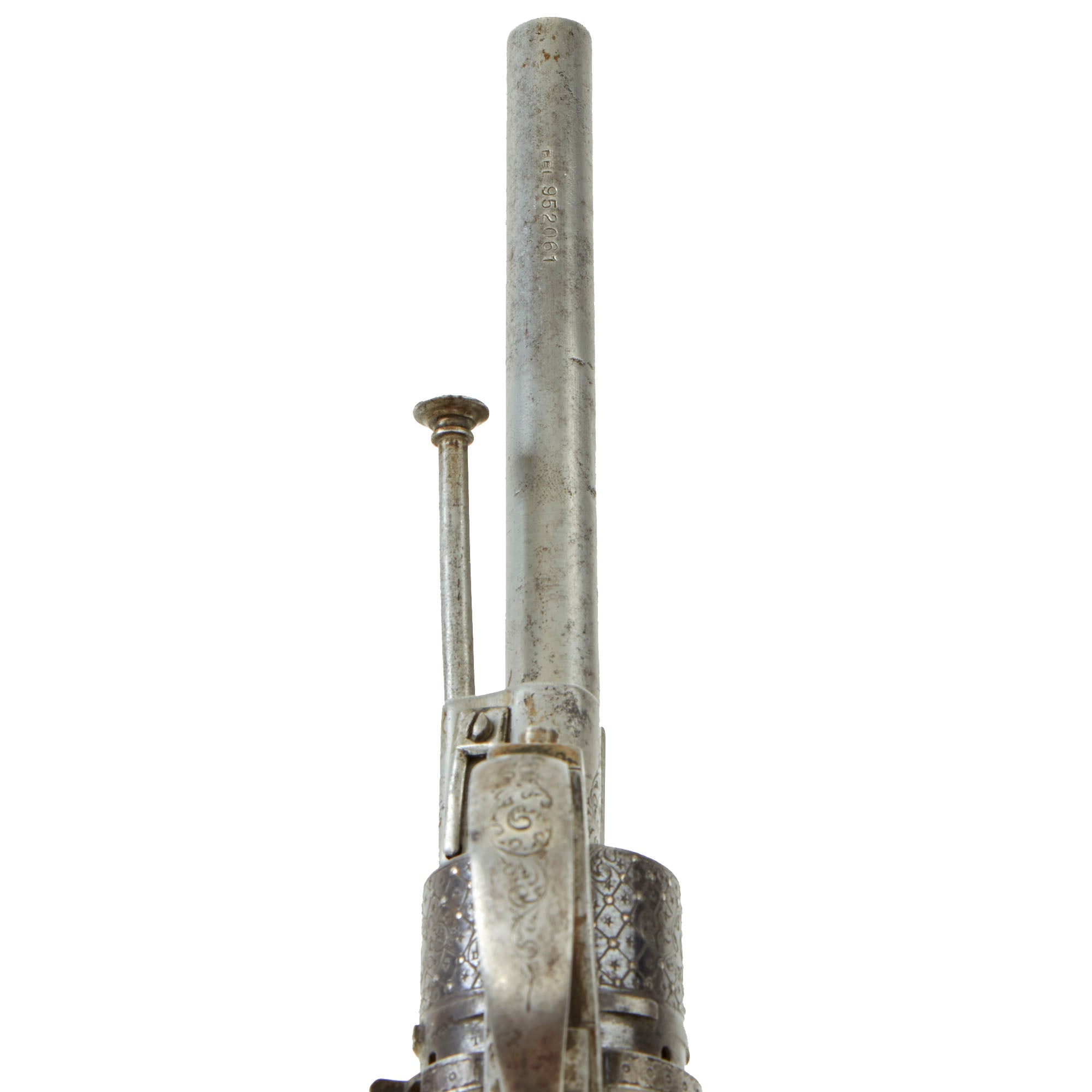 This example follows the standard French style, with a 6 inch long barrel, and overall length of 10 1/2 inches. It features a standard trigger guard and trigger, most likely intended for use in a holster, not a pocket. It is definitely an upmarket example, featuring an ornately floral embossed and engraved frame, with floral engraving on the barrel breech, trigger guard, and grip back strap. The cylinder is even more done up, with criscross engraving intertwined with floral designs, and small silver studs at the intersections of the lines. The cylinder was originally blued, while the rest of the gun looks to have been bright steel, and the finish is actually relatively intact. There is also what looks to be a relatively recent import or collection marking stamped into the bottom of the barrel: BEL 952061.