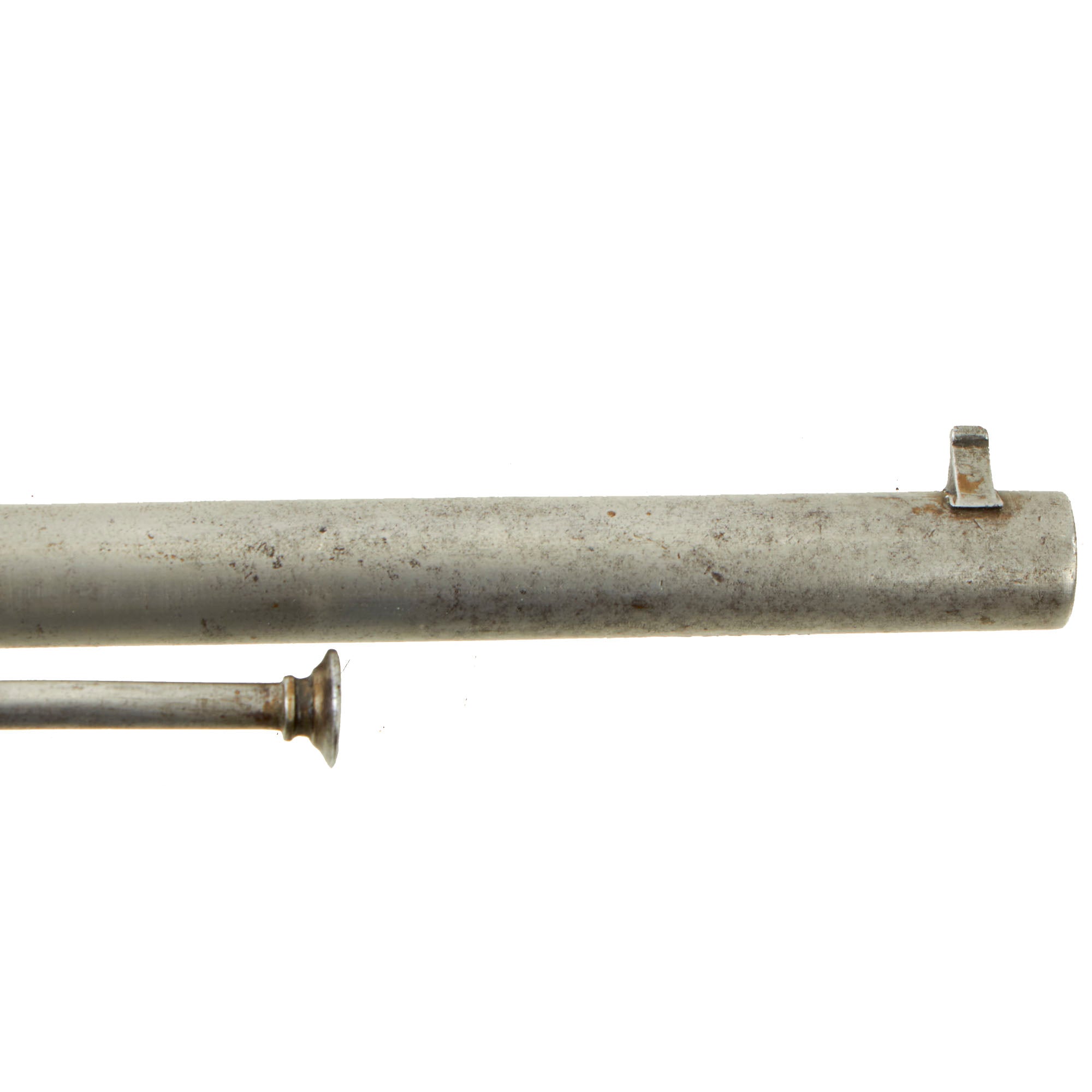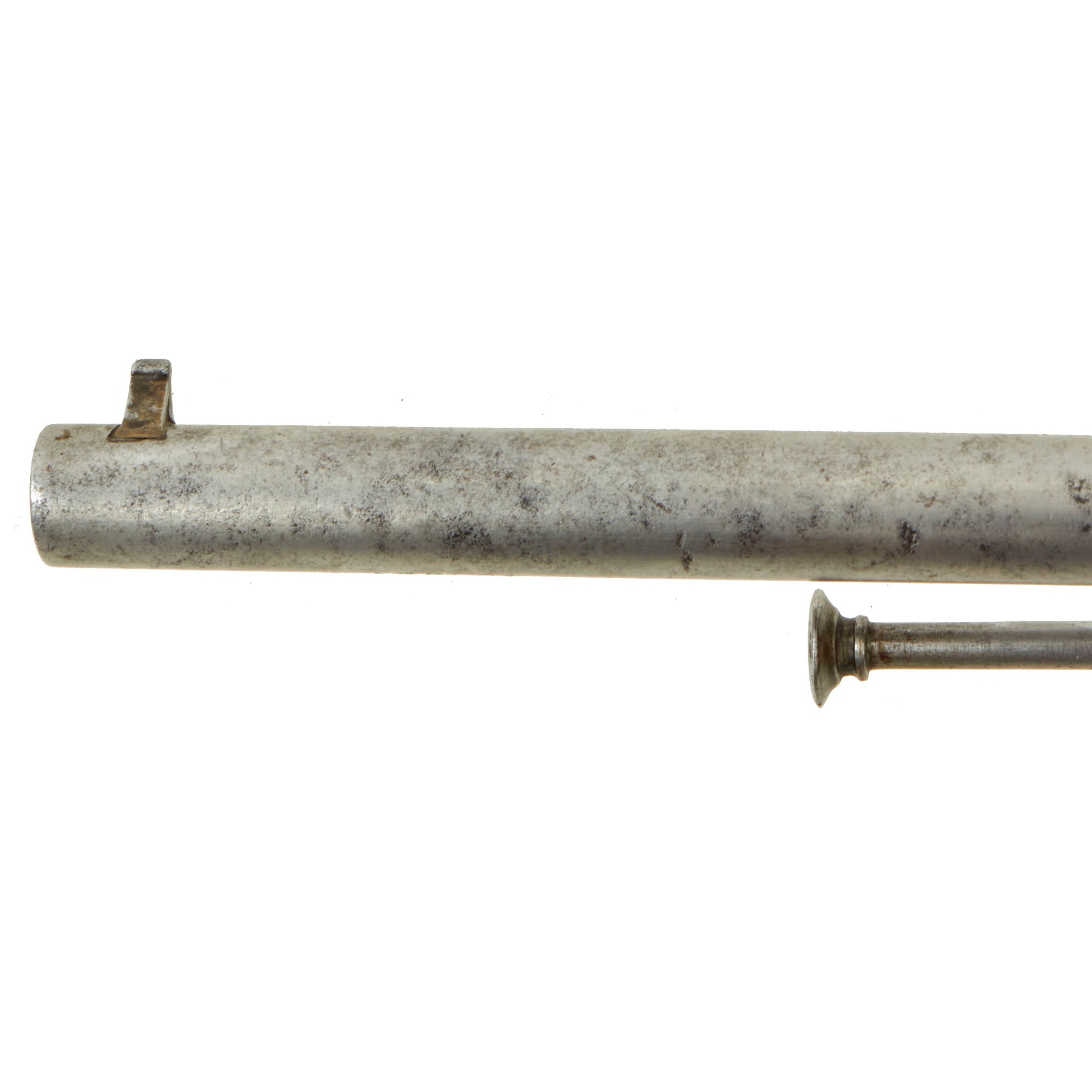 Functionally, the revolver cycles well and functions in both double and single action. We did not notice any finicky behavior, and the indexing and cylinder lockup are strong in single action. The bore is in excellent condition, with crisp lands and grooves and a partly bright finish. It does not look to have seen heavy use during its service life. The ejector is present and functional, though it can pull out the front as the retaining spring is worn. The loading gate is still present, though the lock is missing, and a brass pin has been put in place to keep it closed.