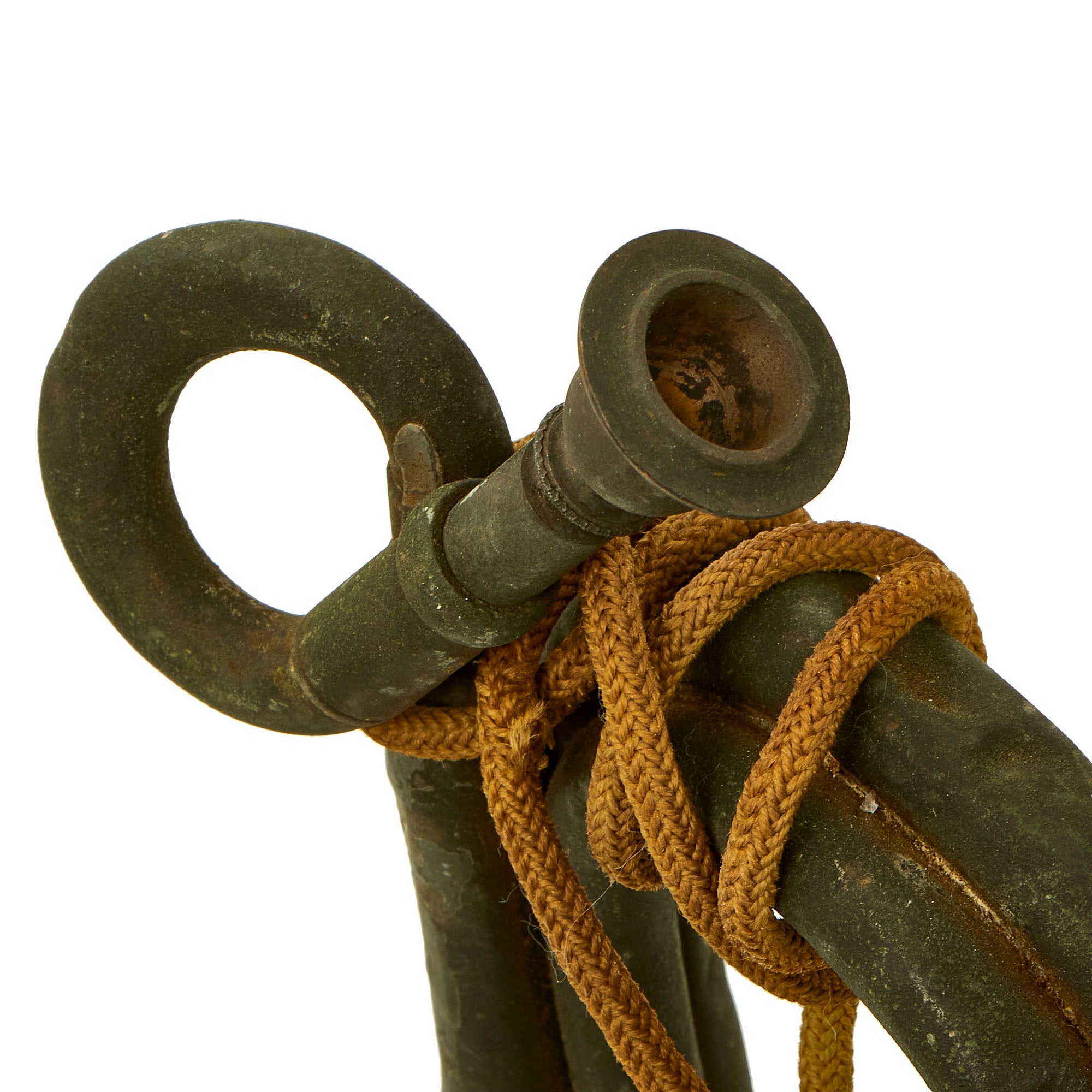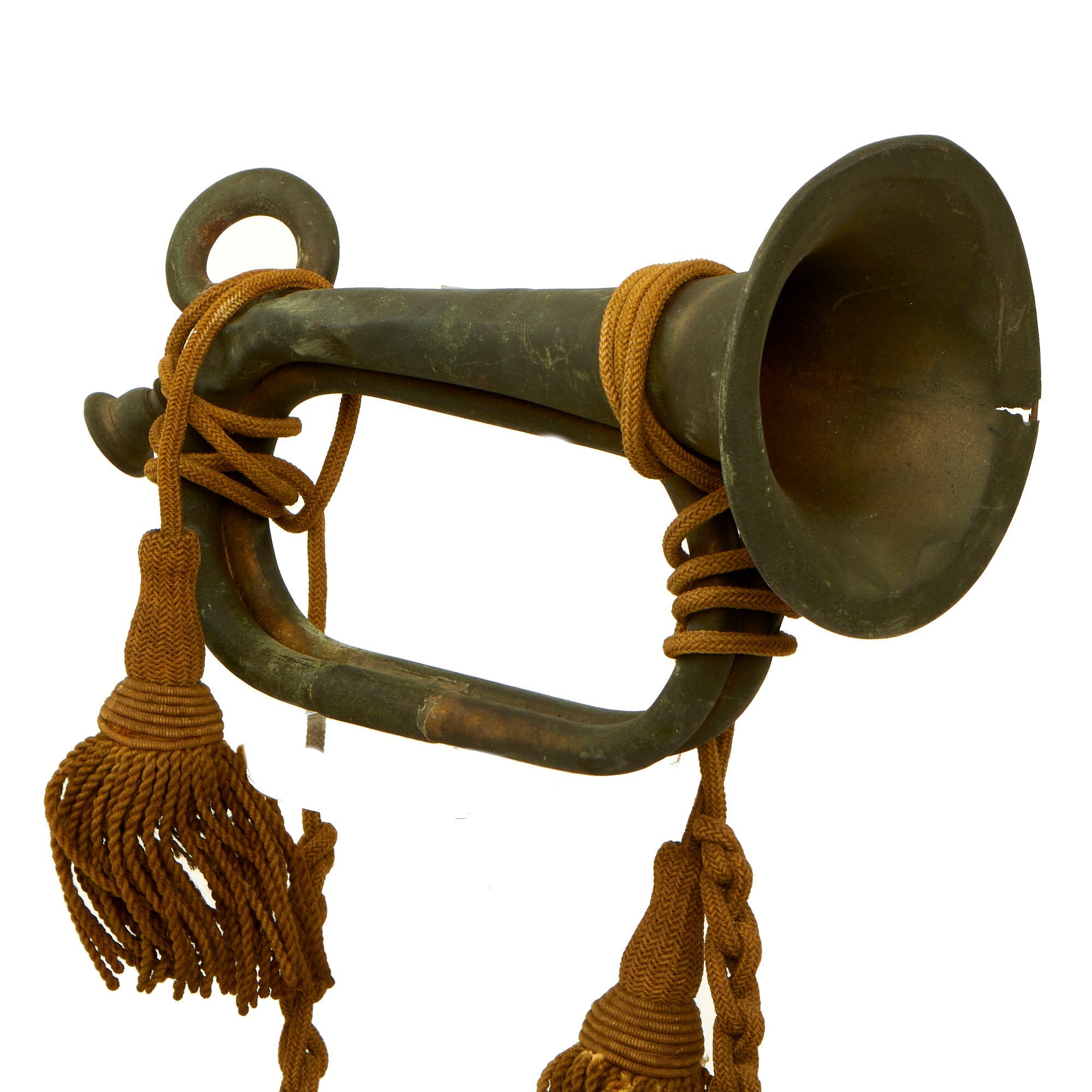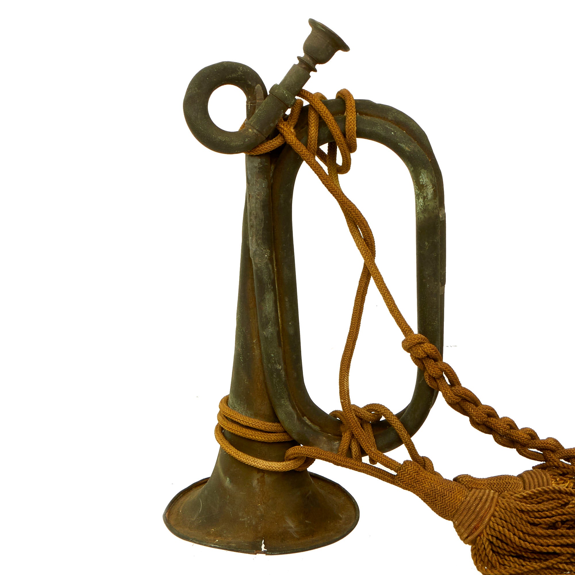 Original Item: Only One Available. This is a lovely well-patinated example of a U.S. Civil war era brass bugle, complete with the correct style braided shoulder cord and tassels. It pitched in the key of C with a short crook for converting it to Bb, and uses a different mouthpiece for each key, which is why there are two. It is definitely somewhat primitive in construction, and uses relatively thin brass. It does not conform to the standard quartermaster issued examples, which were usually single loop examples. With a double loop design with the mouth pipe on the left side, it is definitely from most other examples we have seen from the period, which would have it on the right side.