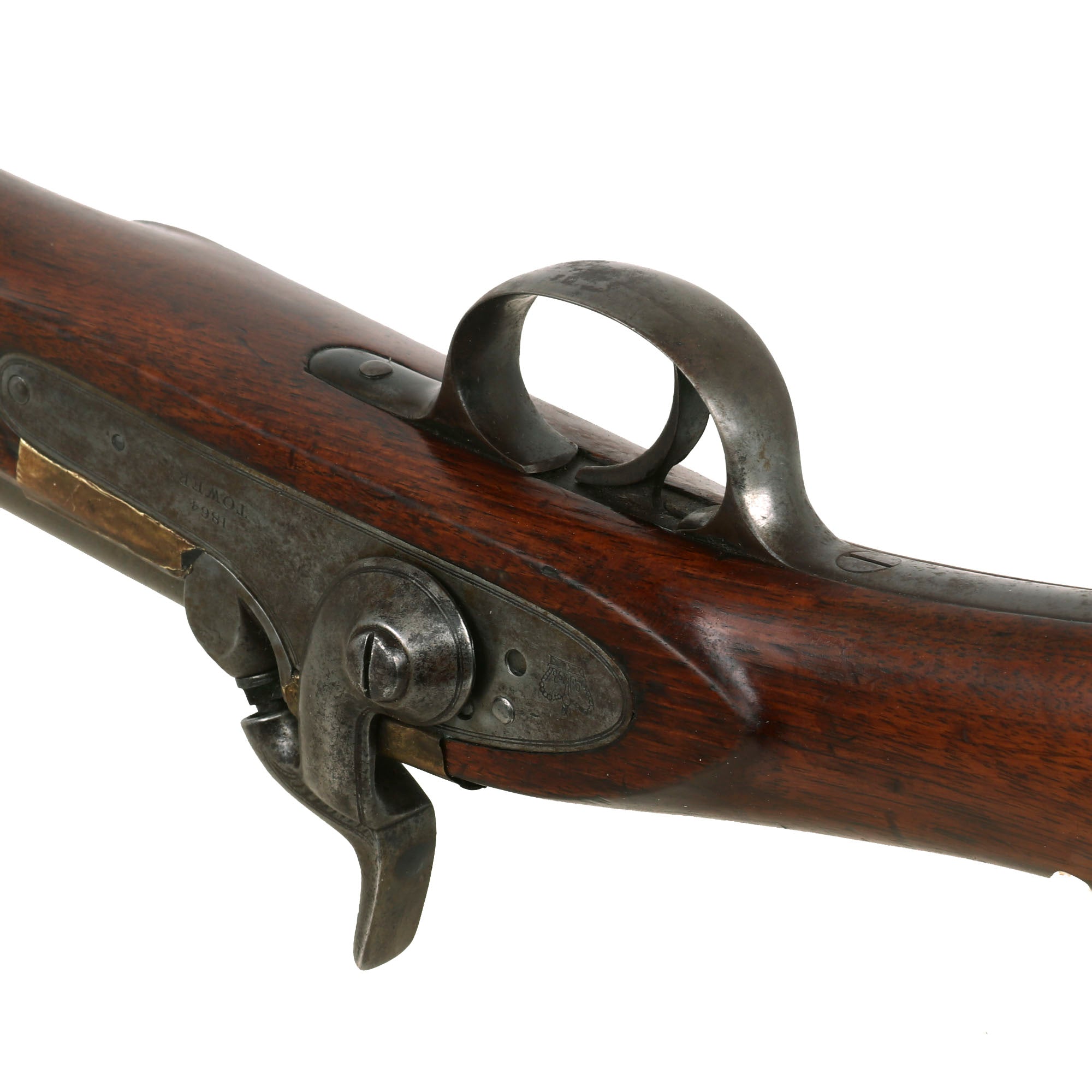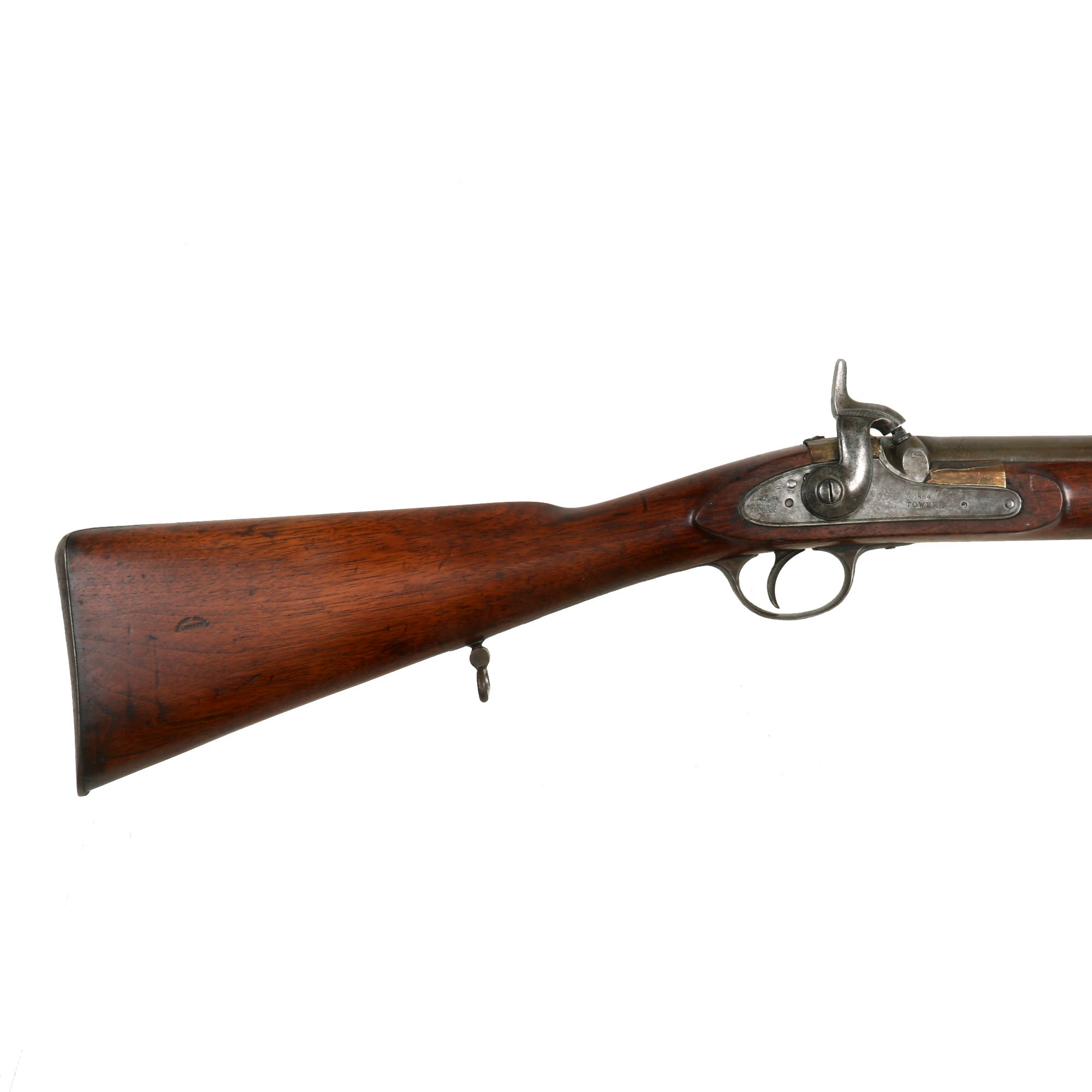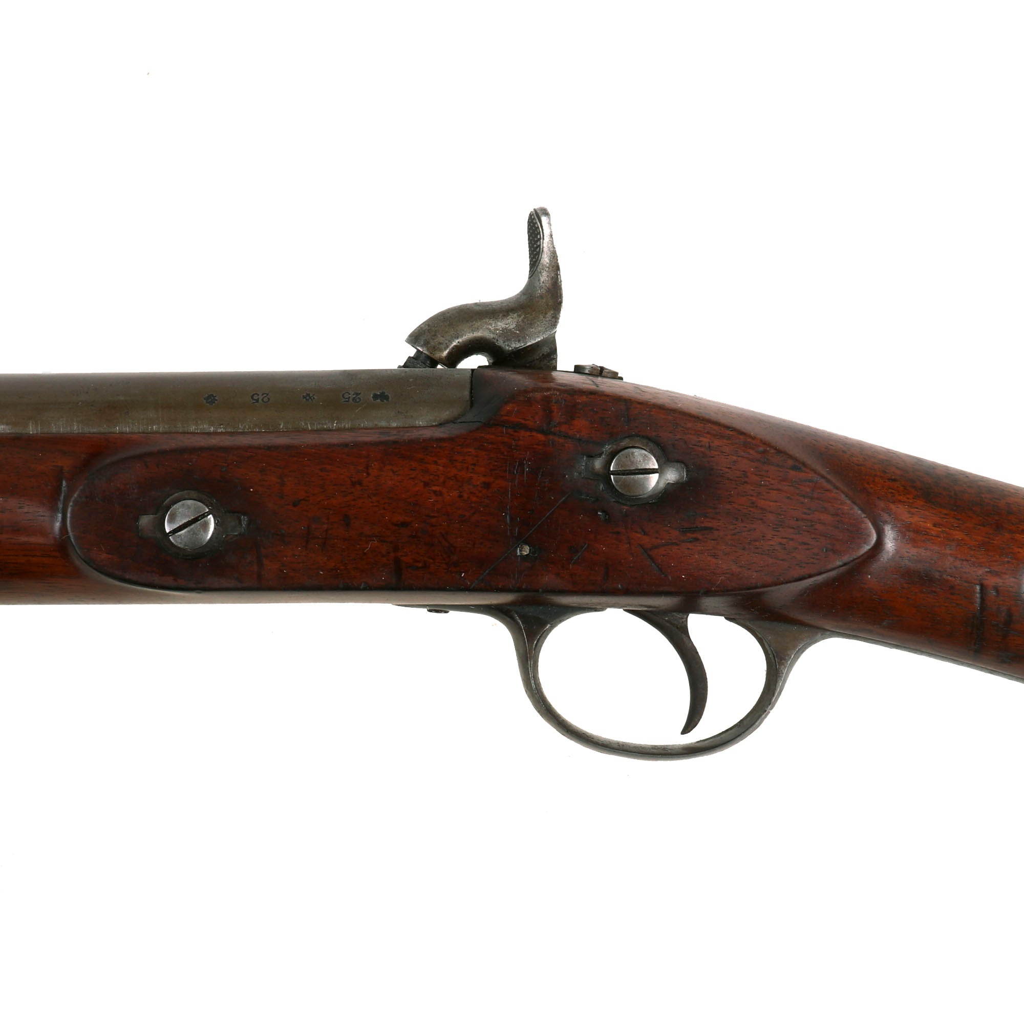 Original Item: Only One Available. Offered here is a nice example of the 2nd Model Pattern 1860 Enfield Short Rifle Musket, as produced in England with iron butt plate, trigger guard and nose cap. The "two band" short rifle was first introduced in 1856, and was updated in 1860 with 5 groove "fast twist" rifling, and again in 1861 with the recessed screw "Baddeley" bands, as with the 4th Model of the Long rifle. With the 5 groove rifling and standard non-recessed screw retained bands, this is definitely the Pattern of 1860, however unlike almost all produced, it was not updated with the Snider breech loading system.
