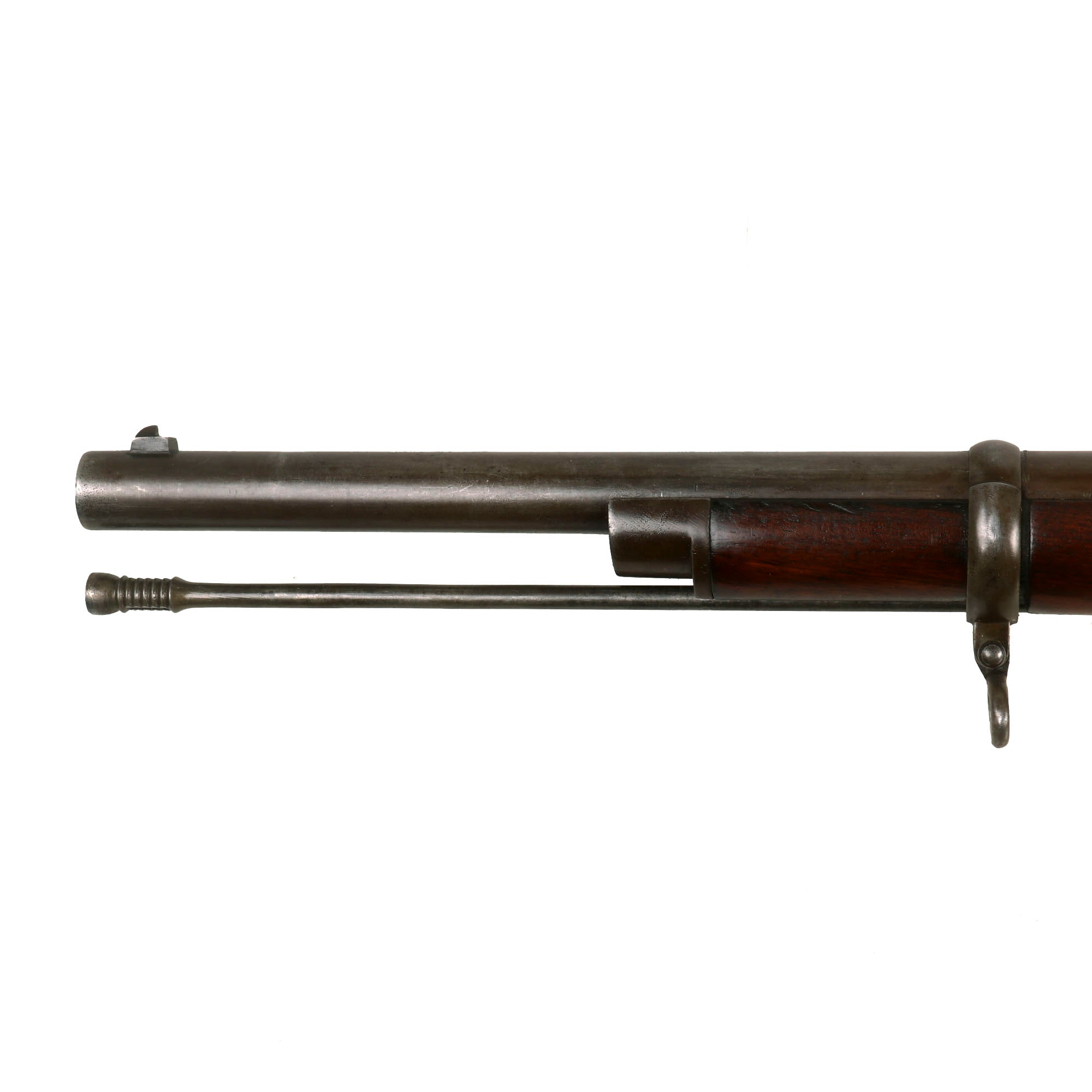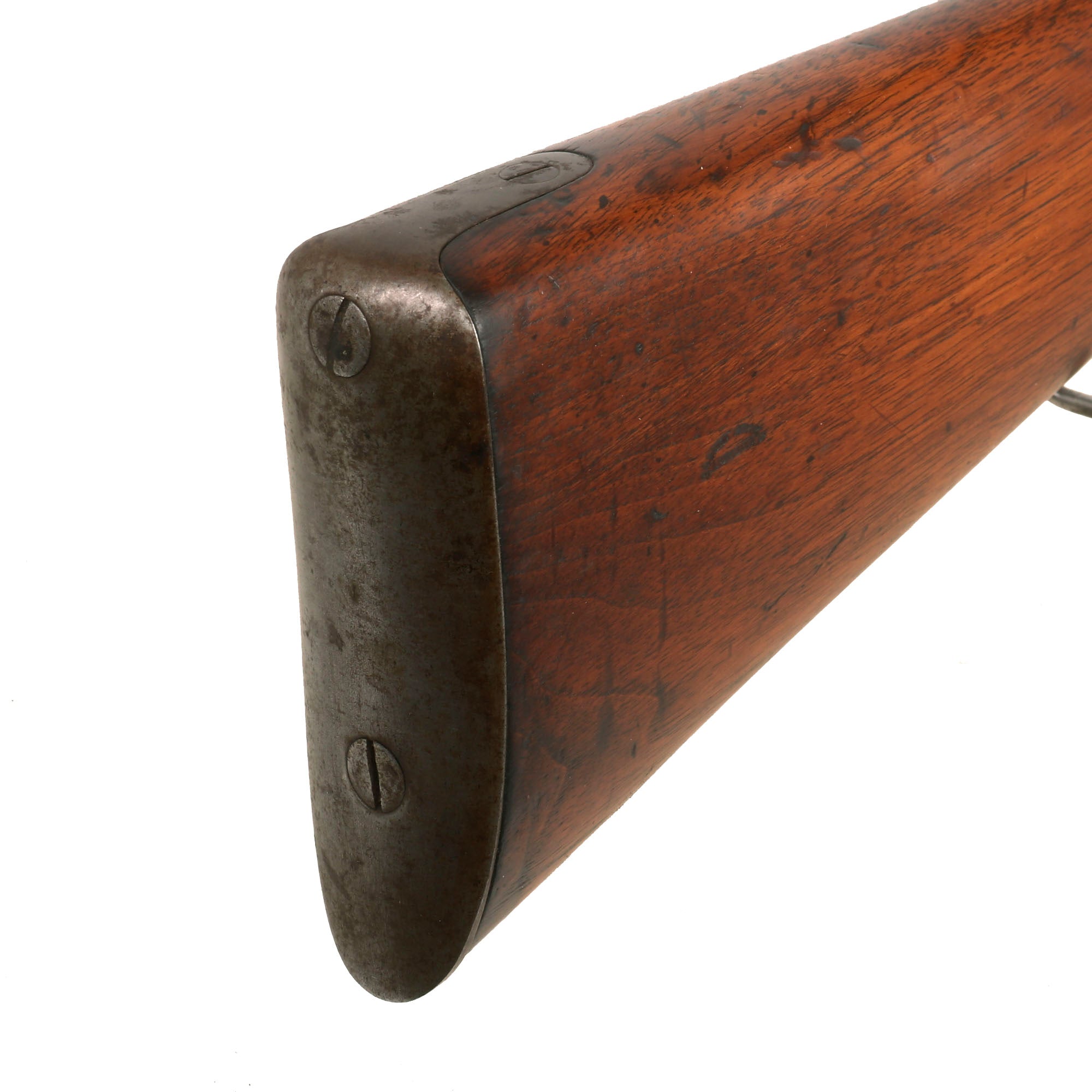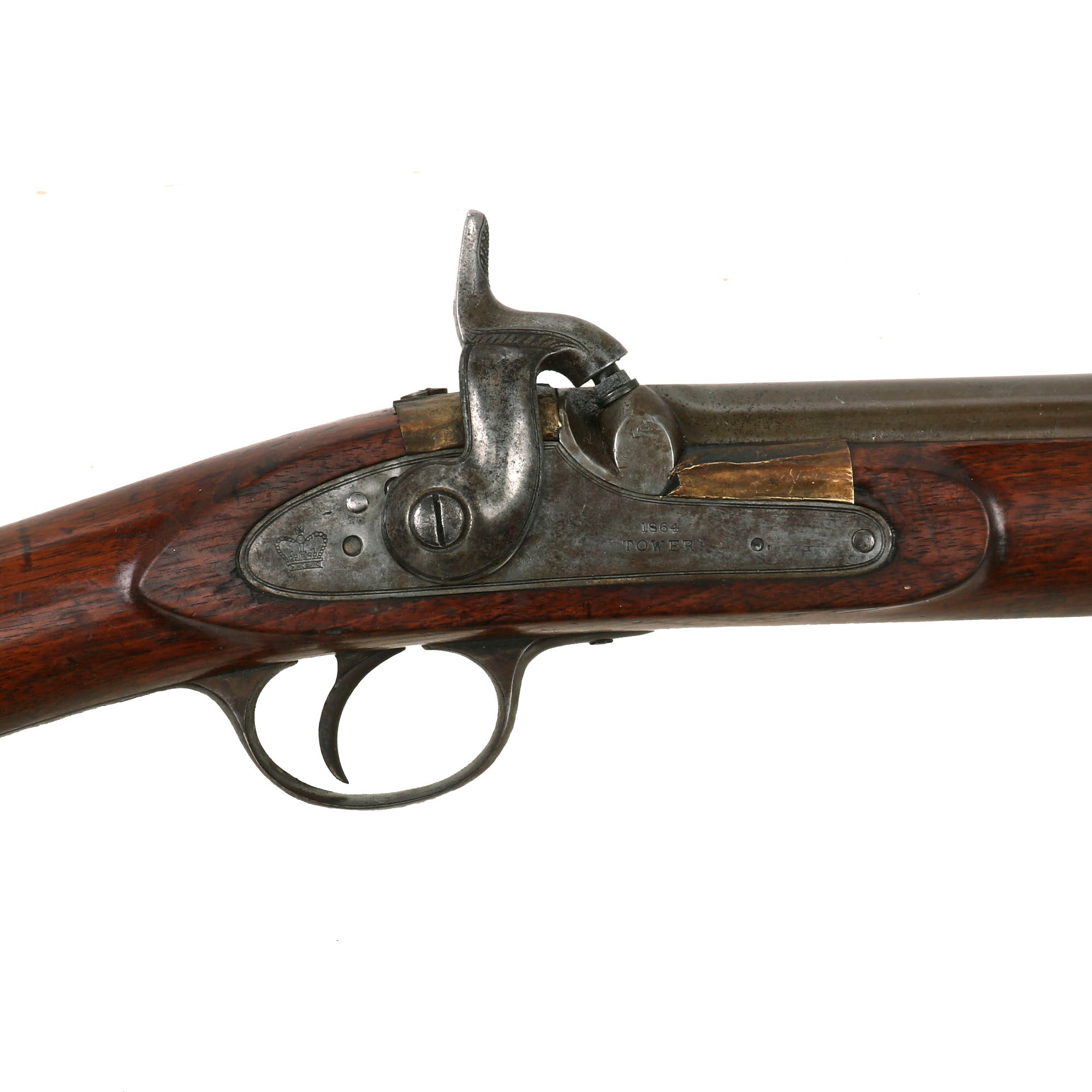 Original Item: Only One Available. Offered here is a nice example of the 2nd Model Pattern 1860 Enfield Short Rifle Musket, as produced in England with iron butt plate, trigger guard and nose cap. The "two band" short rifle was first introduced in 1856, and was updated in 1860 with 5 groove "fast twist" rifling, and again in 1861 with the recessed screw "Baddeley" bands, as with the 4th Model of the Long rifle. With the 5 groove rifling and standard non-recessed screw retained bands, this is definitely the Pattern of 1860, however unlike almost all produced, it was not updated with the Snider breech loading system.