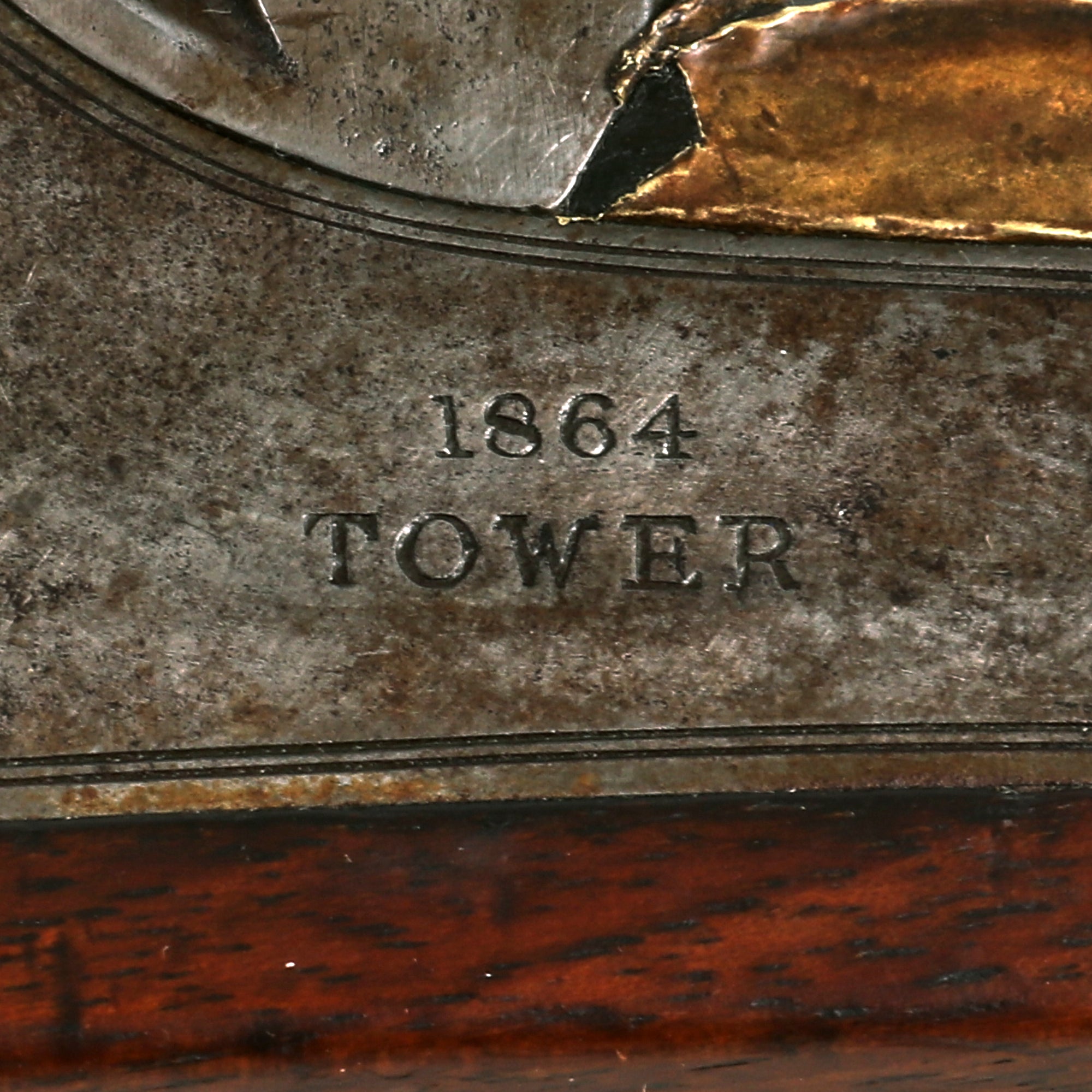 The lock is marked 1864 / TOWER below the cap bolster, and it is marked with a QUEEN'S CROWN to the rear of the hammer. However, there is no "V.R." under the crown. This indicates that this weapon was not intended for a British Military contract but was aimed at the Overseas market, most specifically the United States, who were embroiled in its most terrible Civil War.