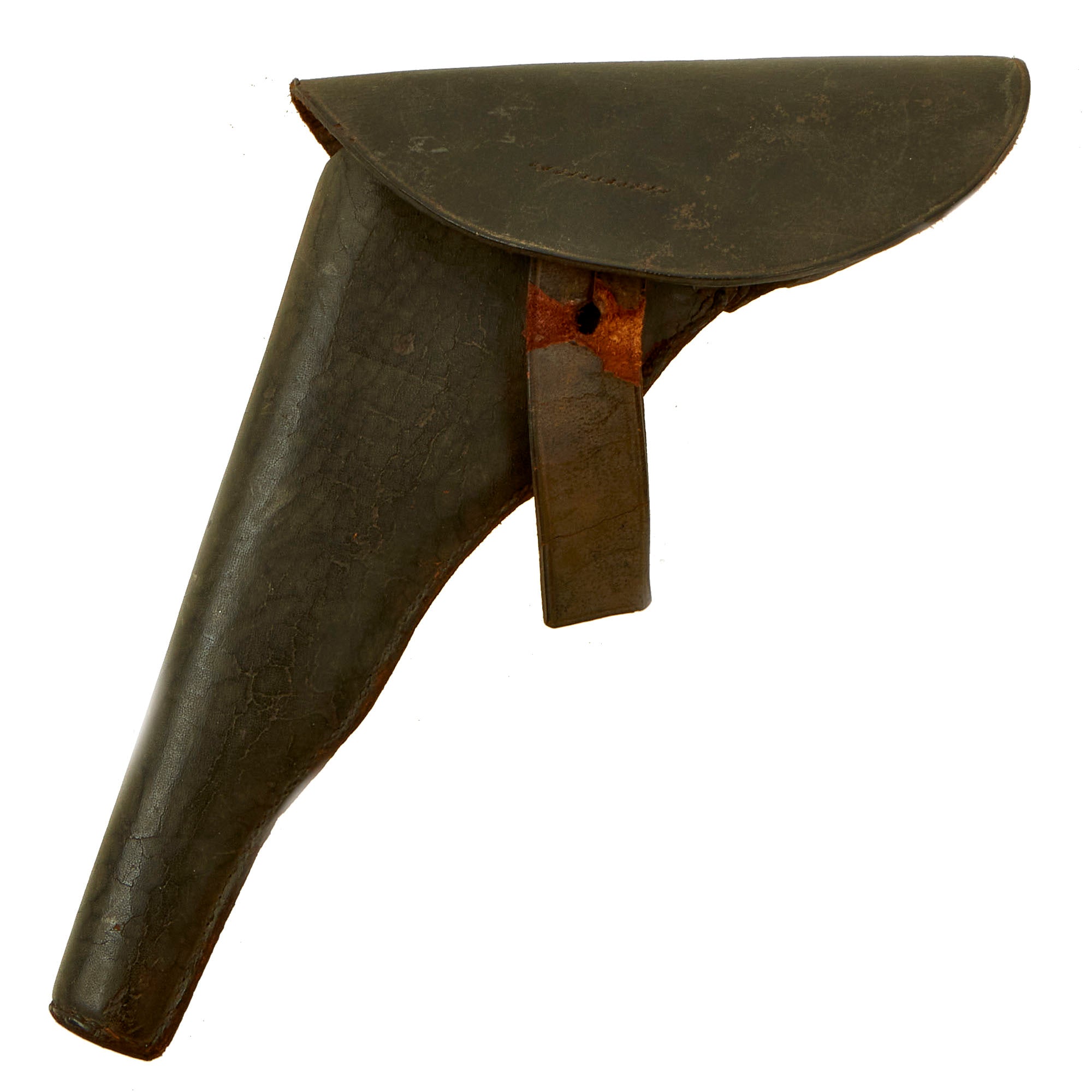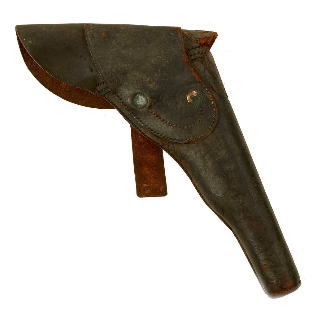 This is a very nice example of a U.S. Civil war black leather flap holster, designed to fit the small percussion revolvers of the day. The holster is made from top grade leather with all of its original stitching still intact and tight. It was designed to be worn "Butt Forward" on the right hip for use with the left hand, the right hand being reserved for the Officer's Sword.