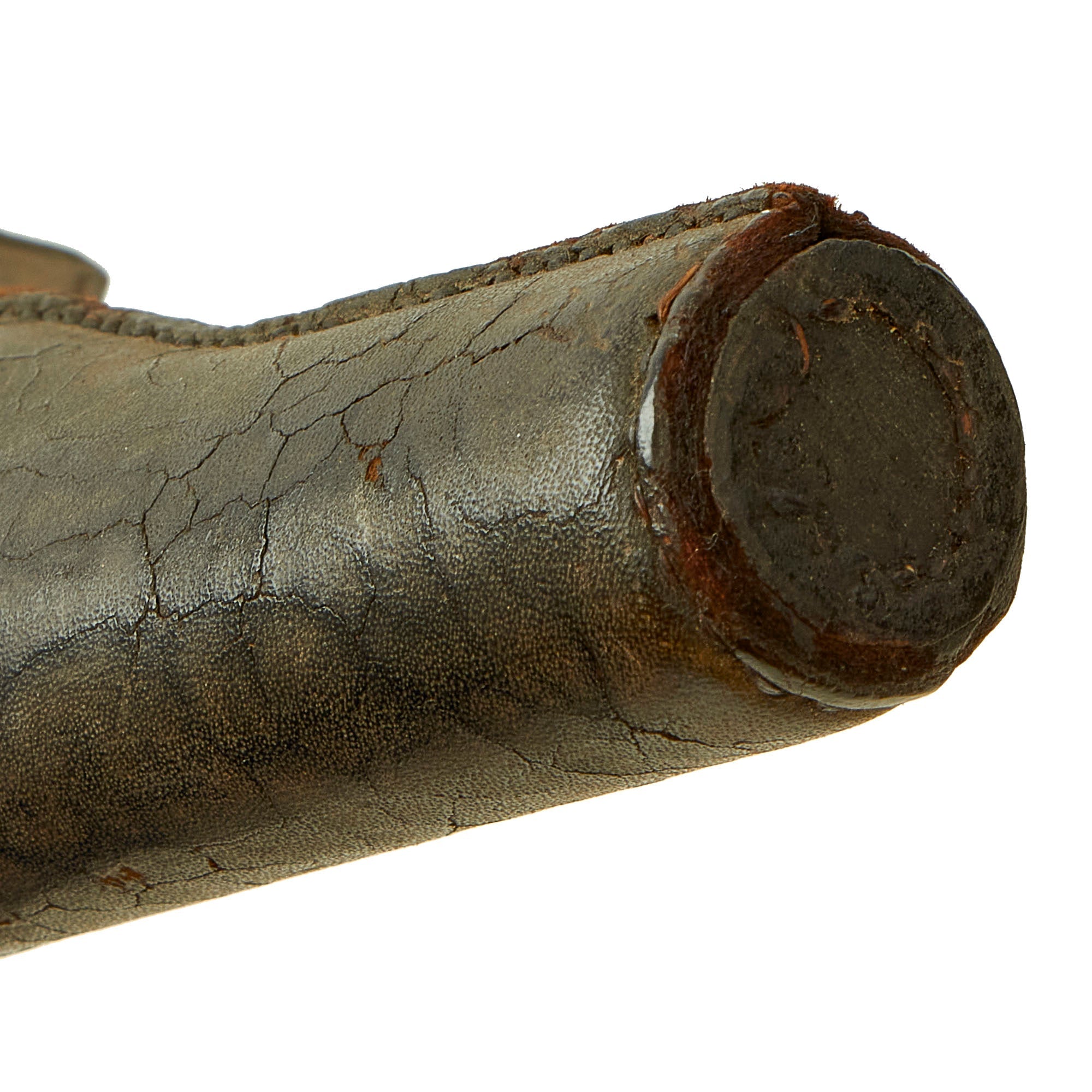 The flap has a securing strap which hooks onto the brass stud on the front of the holster. A true Civil War Military style holster of this 1860 period is very hard to find in remarkably good, somewhat used condition. It does have some cracking in the finish, and there is a repaired tear on the closure flap, but the typical Civil War holsters we see are usually far worse. This still has a very nice shape, without the typical crushing usually seen on these. It would be the perfect accessory for any suitable Civil War percussion revolver.