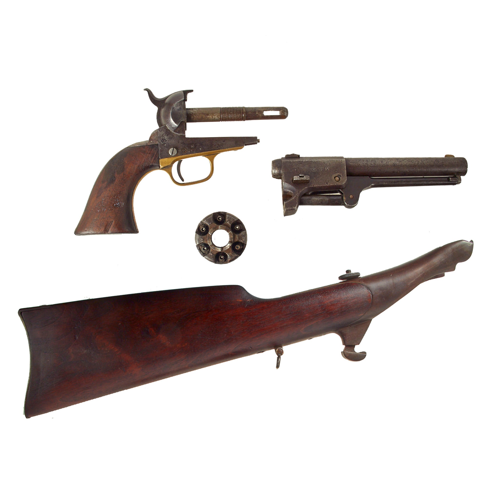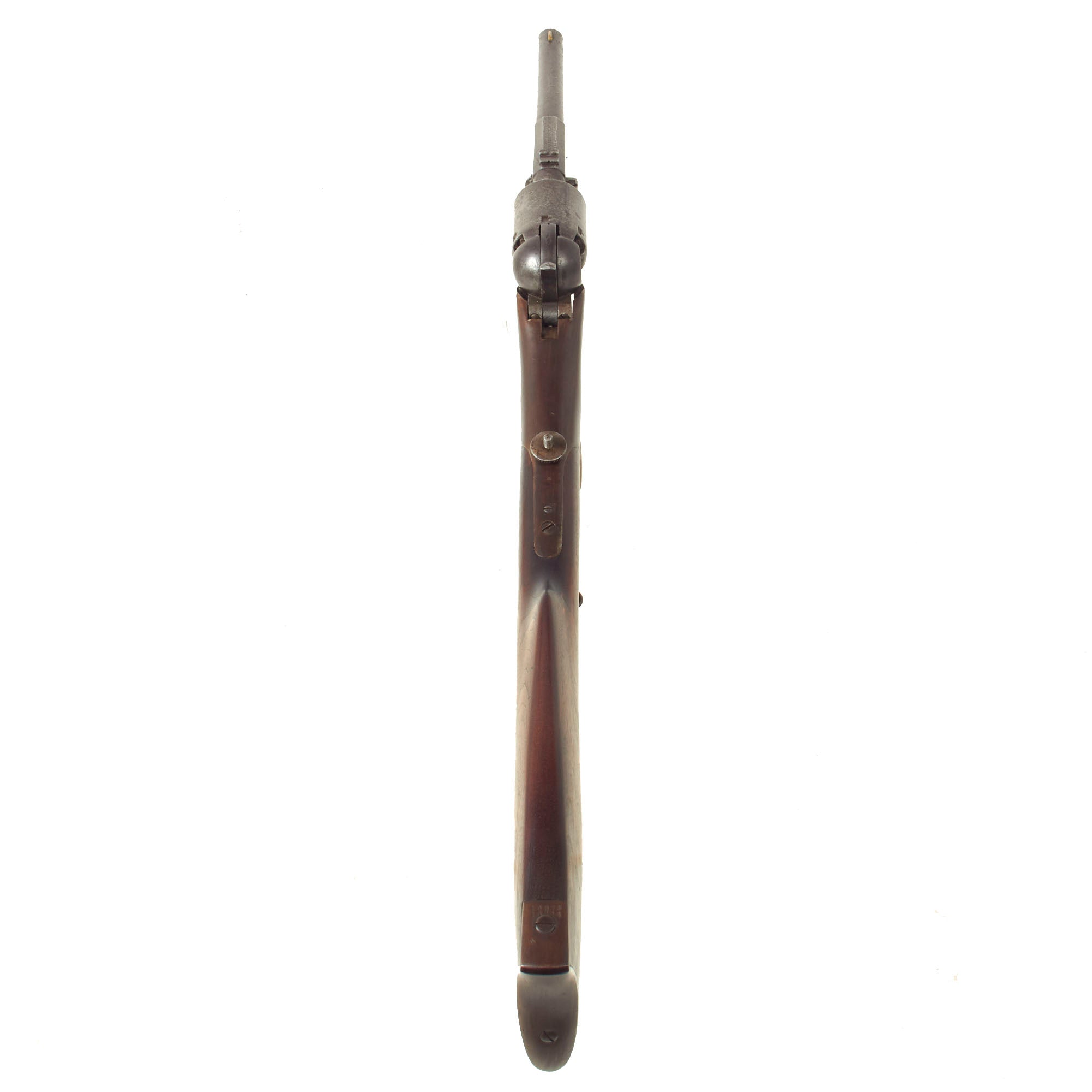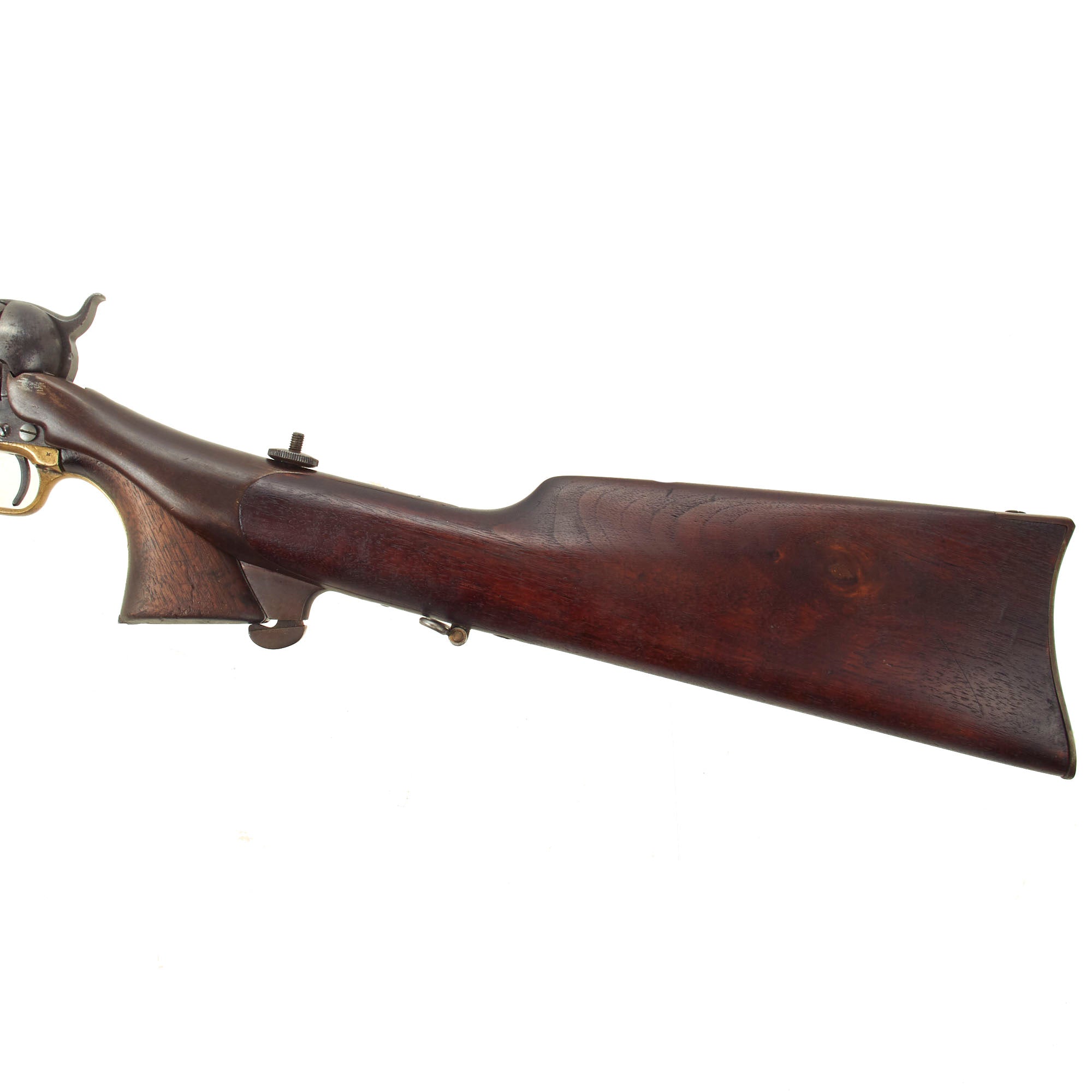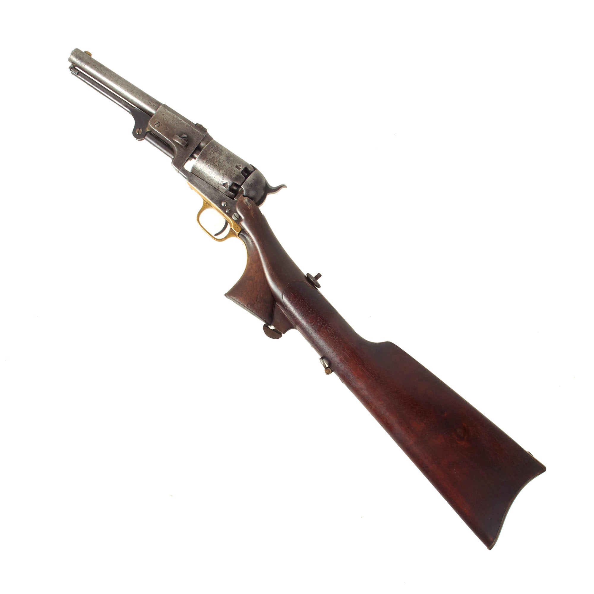 Of the roughly 10,000 Colt Dragoons purchased by the government, a small number of them (946 guns to be exact) were built in a "carbine" configuration. These pistols featured a detachable butt stock which could be added to the pistol when mounted and allow the revolver to be used in the roll of a cavalry carbine. When dismounted, or when fighting in close quarters, the pistol could be used with the stock detached as a traditional revolver. The idea was first tested with the adoption of the M1855 "Pistol Carbine" - a large single shot cavalry pistol that featured a detachable butt stock. Field reports of the M1855 Pistol Carbine were a bit lack luster - the weapon was too large and unwieldy to be used effective as a cavalry pistol, and too short to provide much accuracy when used as a carbine with the stock attached. The Board of Ordnance thought that a weapon that could provide a larger volume of fire could be used to make up for the single shot M1855 pistol-carbines shortcomings and ordered a number of Colt's revolvers to be fitted with detachable butt stocks to test this theory.
