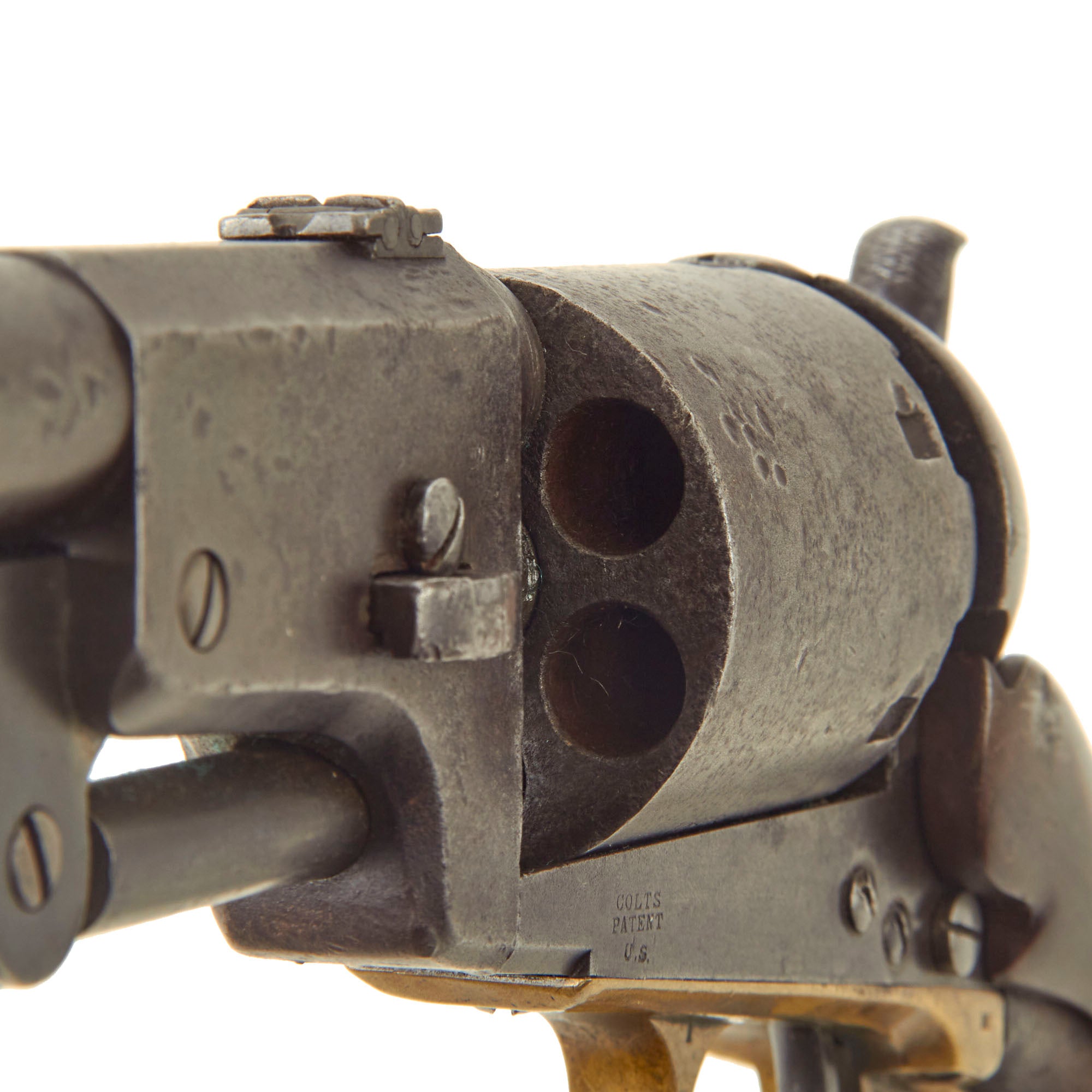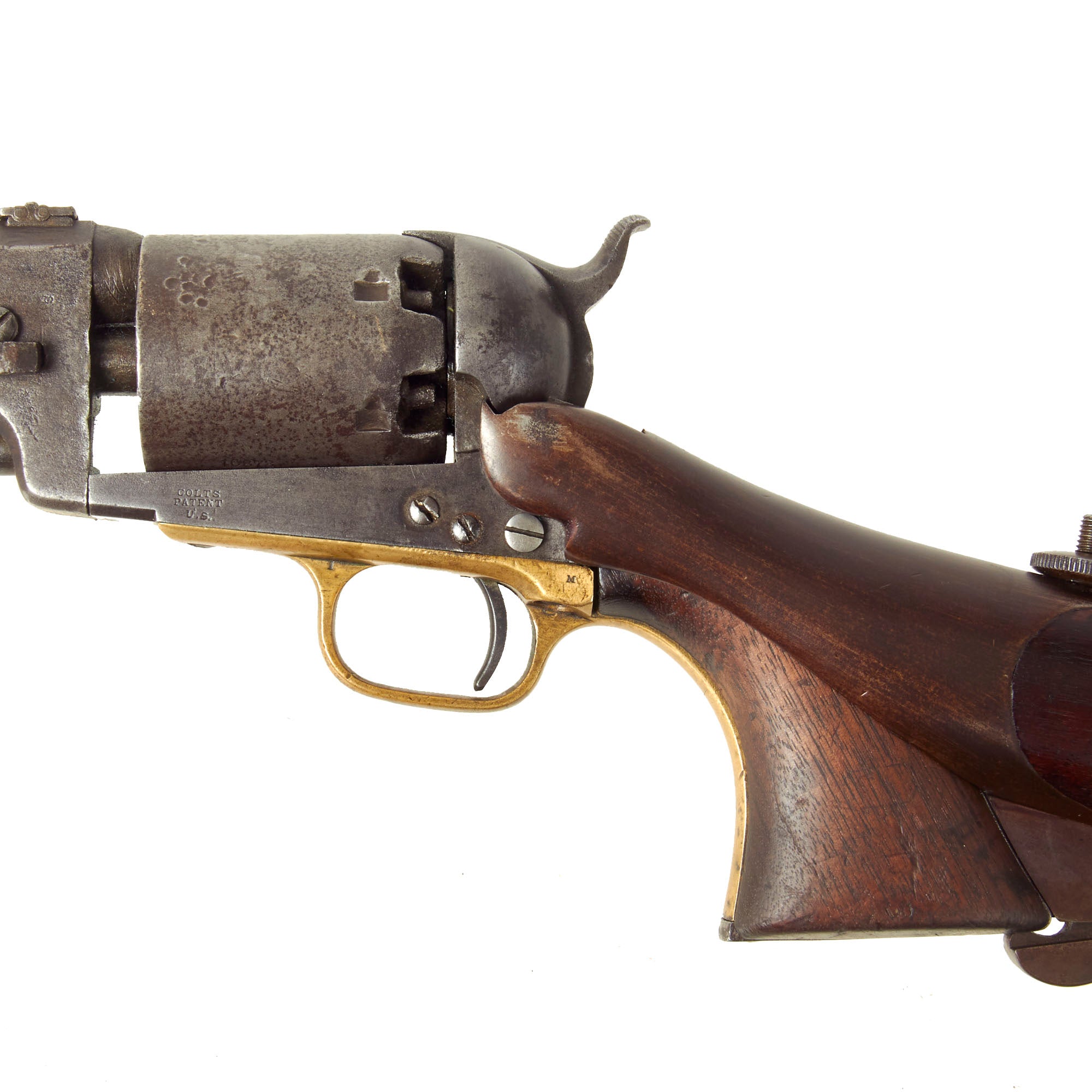 Colt produced the first 1848 Dragoon pistols with detachable butt stocks in 1858. The guns are largely identical to the standard production line of M1848 pistols, except for the addition of a "fourth screw" added to the frame and a relief cut made to either side of the recoil shield. These modifications allowed for the addition of a large butt stock to be secured to the stock without interfering with the user's ability to cock and fire the pistol. Additionally, in order to better equip the revolvers for their carbine roles, Colt added a dovetailed leaf sight to barrel for shooting at longer ranges. The finished pistol carbines were shipped in pairs, as they were to be carried in a pair of US cavalry pommel holsters. Because the butt stocks had to be hand fit to the pistols, the serial numbers of each pair of pistols were stamped into the yokes and butt plates of the shoulder stocks. Colt supplied only 946 Dragoon revolvers cut for shoulder stocks over the course of the gun's production run, with the very last carbine configured pistol delivered in 1861. This has made original examples extremely rare and sought after.