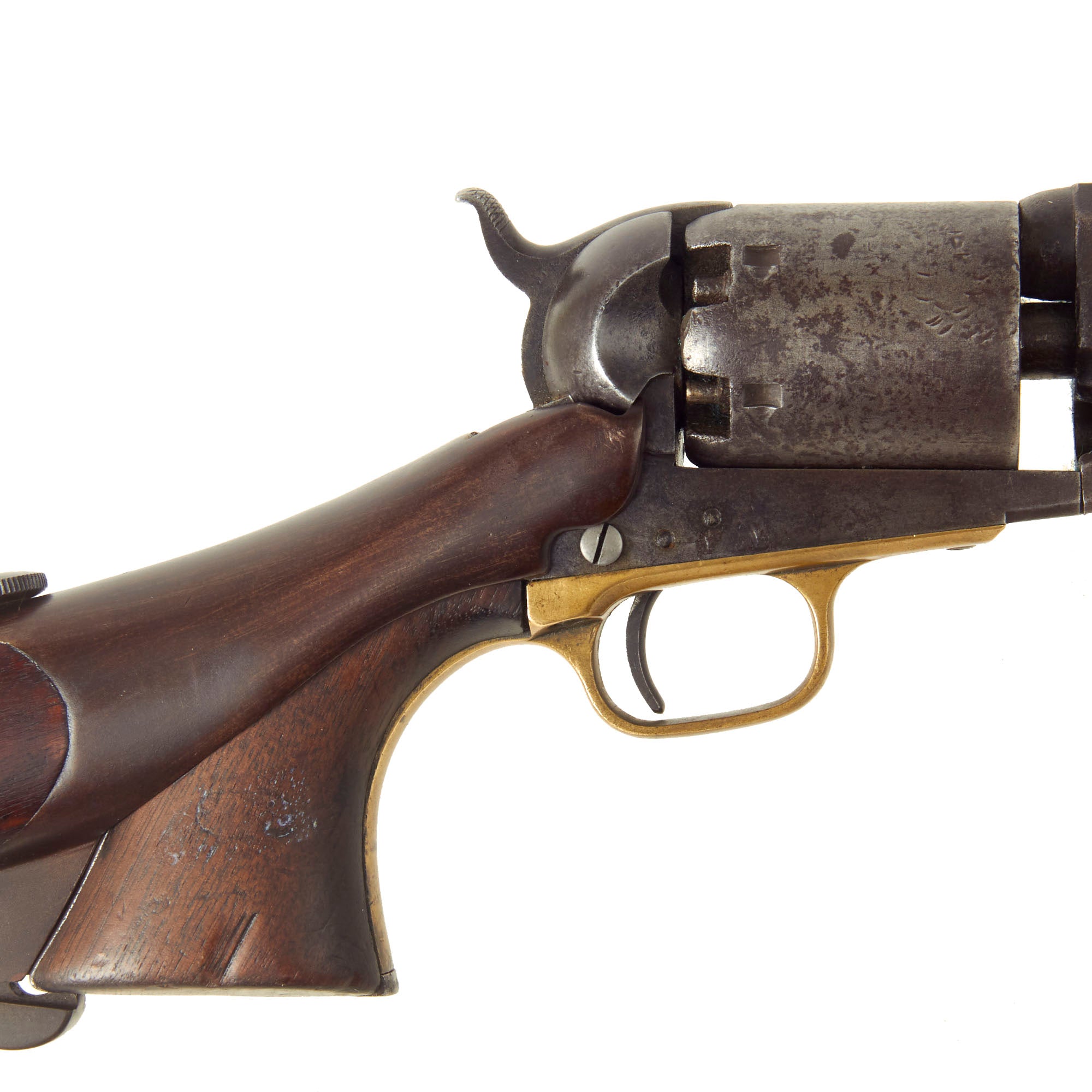 This is a fantastic Colt Model 1848 "Dragoon" revolver, in the correct .44 caliber percussion, with a 6 shot round cylinder and 7 1/2" barrel. It is a truly massive design, very conservatively designed for accuracy and sturdiness. This example is in very good service used condition and fully functional, with a lovely worn gray patina overall. It was fitted at the factory with a 3 leaf long range rear sight on top of the barrel, and comes complete with its original shoulder stock. All Colt "Dragoon" models are rare, but examples with the original matched butt stock are extremely scarce, and this is the first example of a Colt Dragoon of any type that we have had the pleasure of offering.