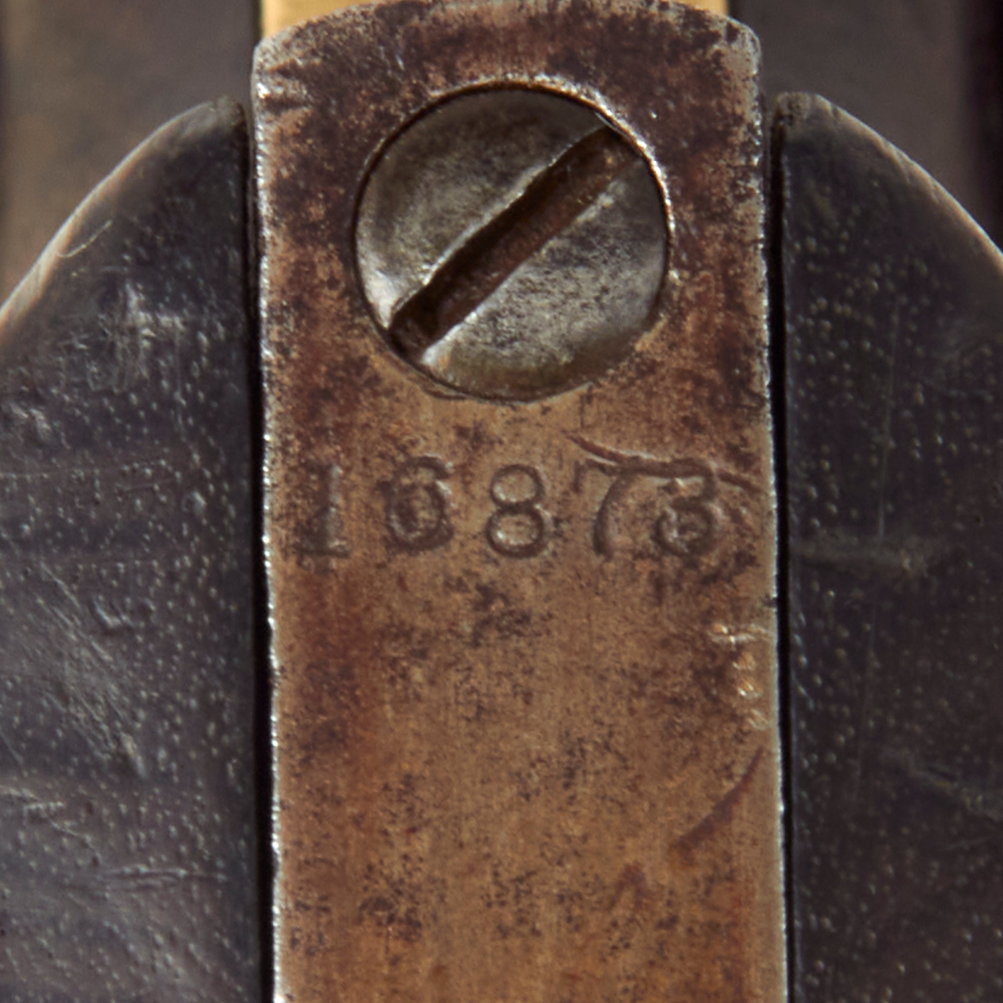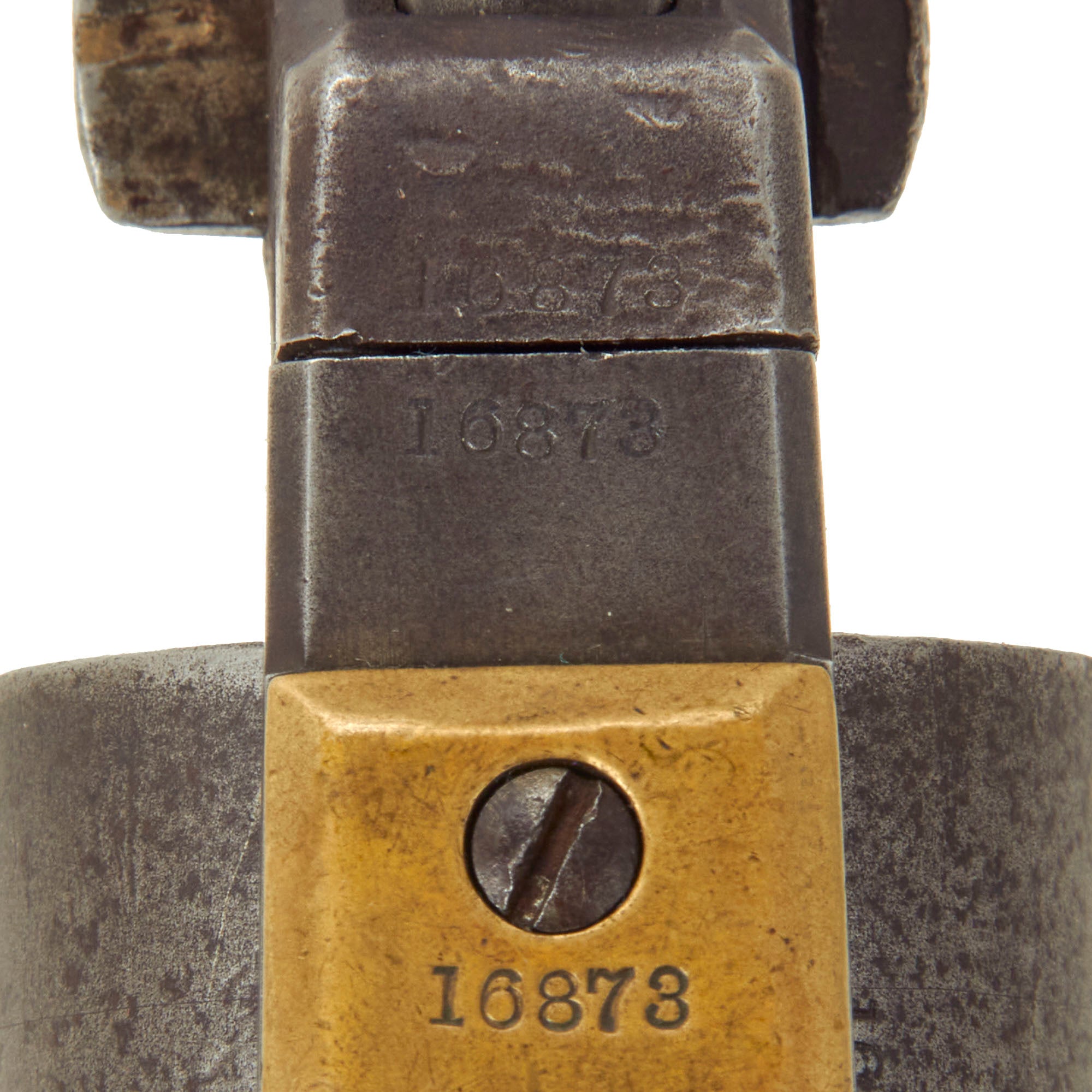 The pistol has a nice worn oxidized finish, and does not look to have been refurbished at any time. The barrel, frame, cylinder, trigger guard, grip frame all bear matching serial number 16873, denoting year of manufacture as 1858, only a few years before the outbreak, of the Civil War, so it was most likely used during the conflict. The loading rammer and barrel wedge are marked with shortened number 6873, while the arbor pin is marked with 687 (the rest is worn off), which makes this a great "ALL MATCHING" example, with no parts swapped out over the years.