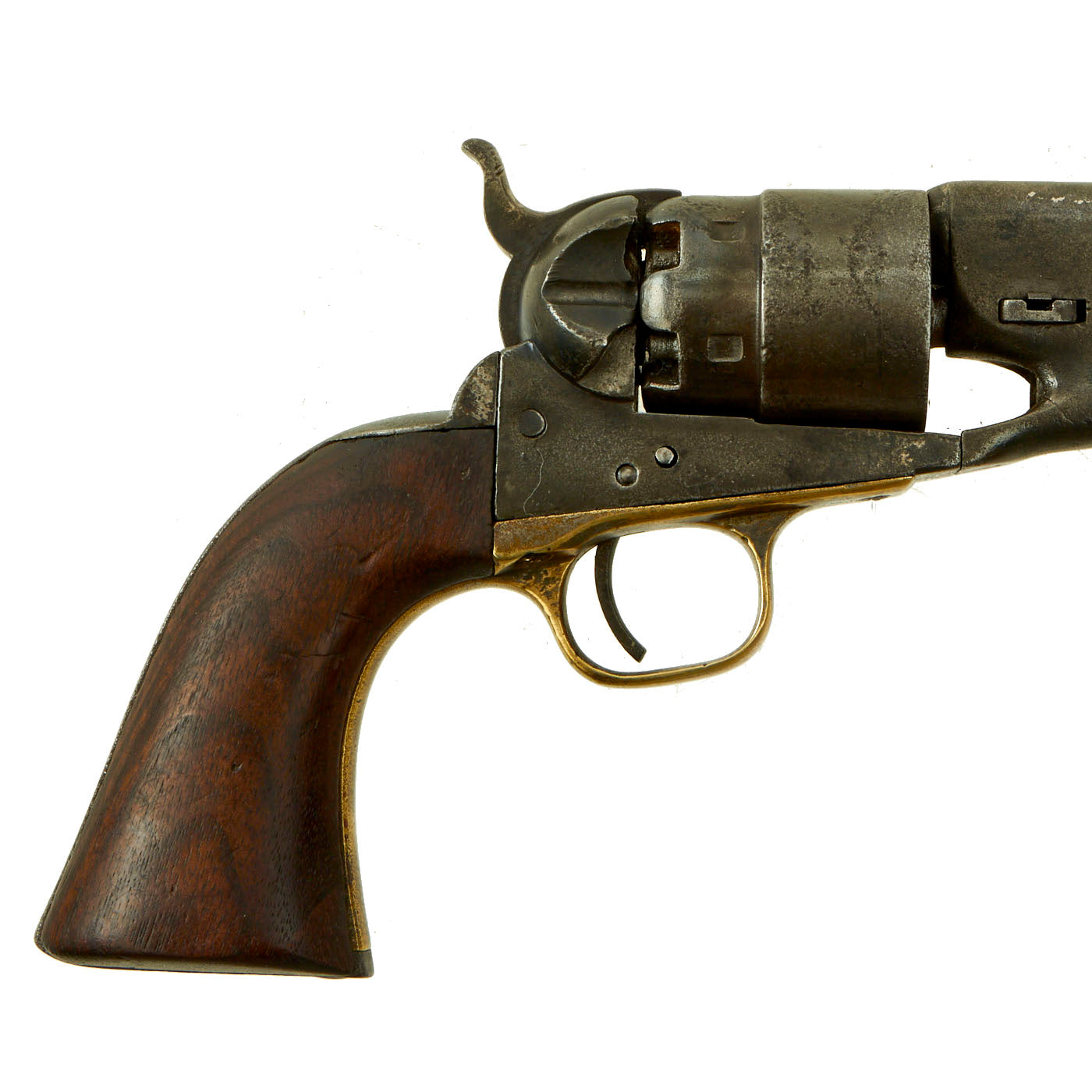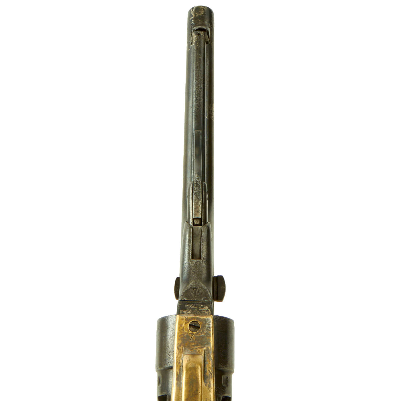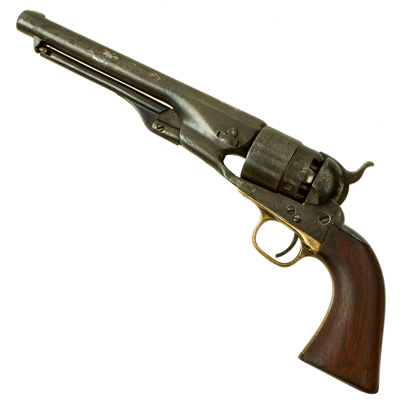 Original Item: Only One Available. This is a very interesting service used .44 caliber percussion, 6 shot round cylinder, 8" barrel Model 1860 Colt Army revolver, set up as a "Salesman Sample". Little is recorded of these revolvers, which were supplied upon request to retail Gunsmiths for use as client test pieces, so the retail buyer could satisfy himself that the 1860 Army Model was the ideal gun for him. Refurbished and deliberately re-numbered these were intended to save wear on brand new retail inventory. This example appears well used and maybe was once nickel plated now just about all gone, but is nevertheless a fine example of these Retail Trial revolvers.