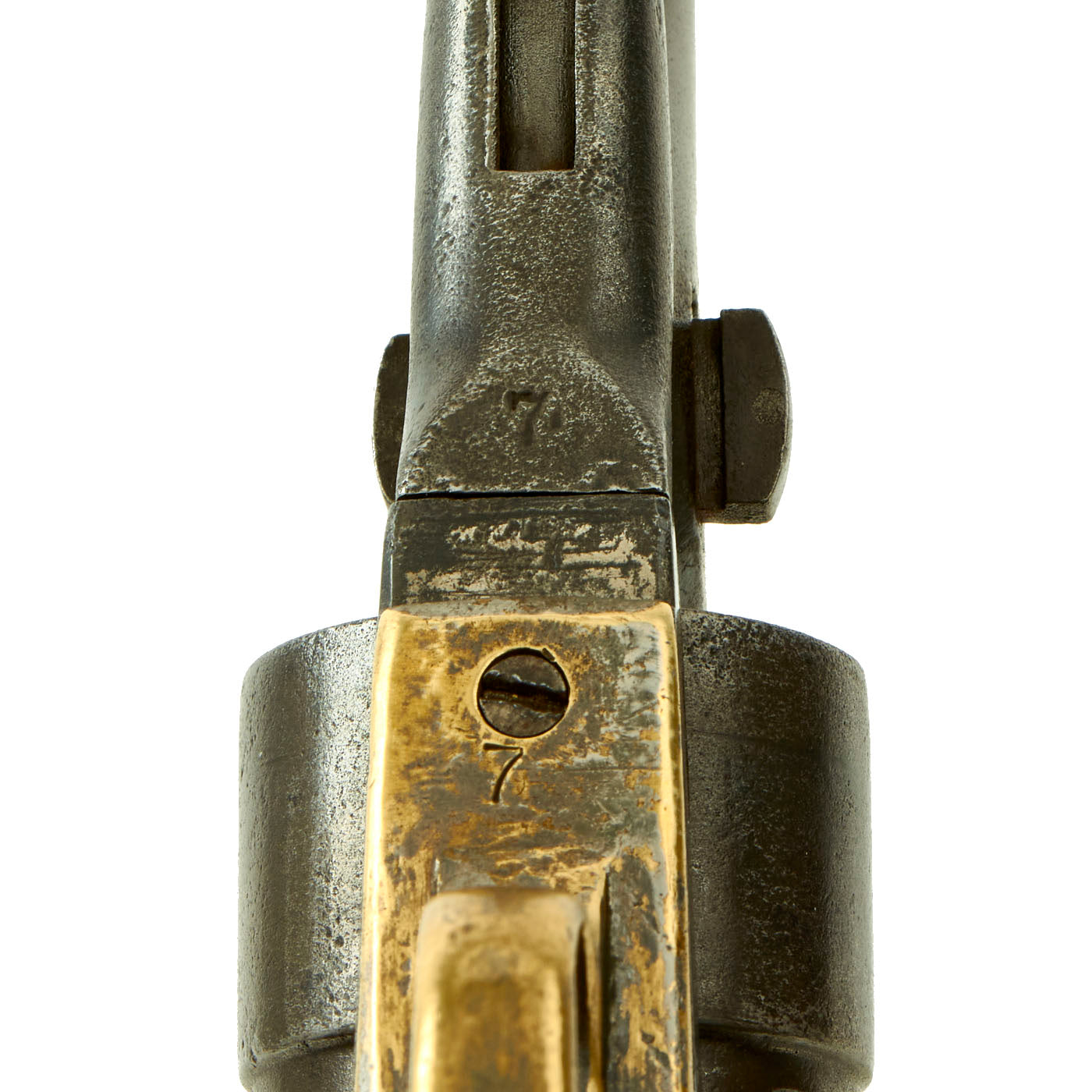 The COLT'S PATENT marking is still fully visible on the left side of the frame, however the cylinder has also had all of the markings on the sides worn away, including the serial number and "Naval Engagement Scene". The pistol overall has a nice worn oxidized finish, with the serial numbers on the barrel, frame, cylinder, trigger guard, and grip frame removed, and instead stamped with a large number 7.