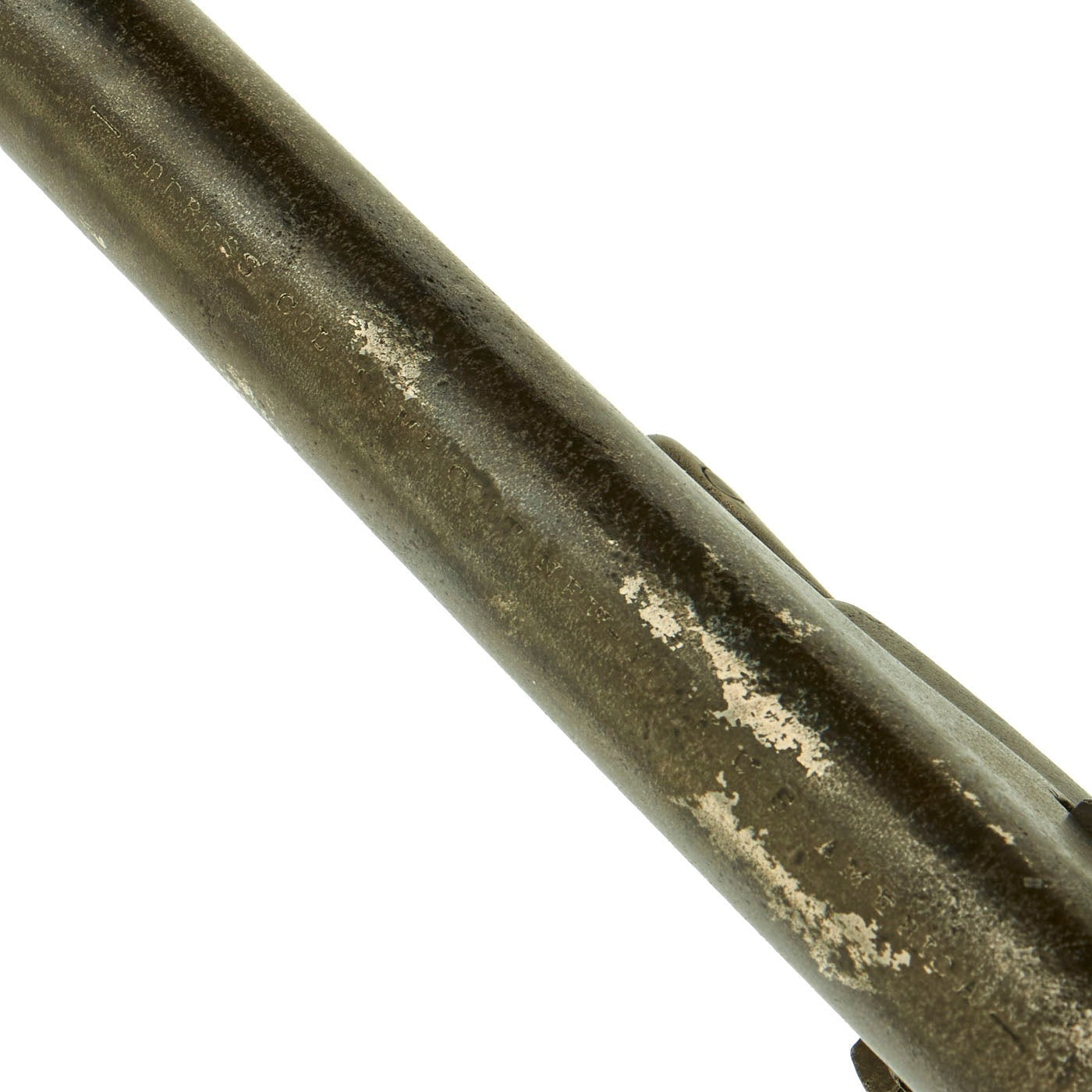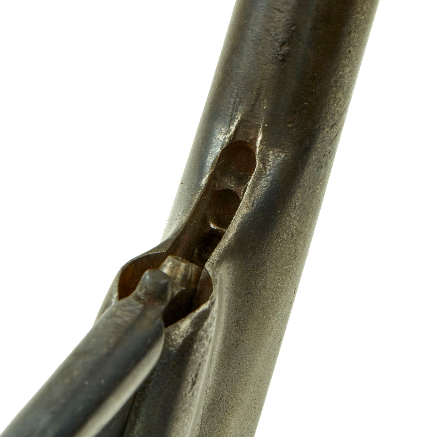 The pistol is complete and functions well, despite all the history it has seen. It has good indexing with a strong cylinder lockup, and a crisp dry fire. There is just a bit of play in the action due to wear. The bore shows clear lands and grooves, however there is also some oxidation and fouling overall. The barrel - frame connection does have just a bit of wobble due to wear. All 6 cap nipple cones are intact and clear, though they do show some oxidation and powder burn to the exterior.