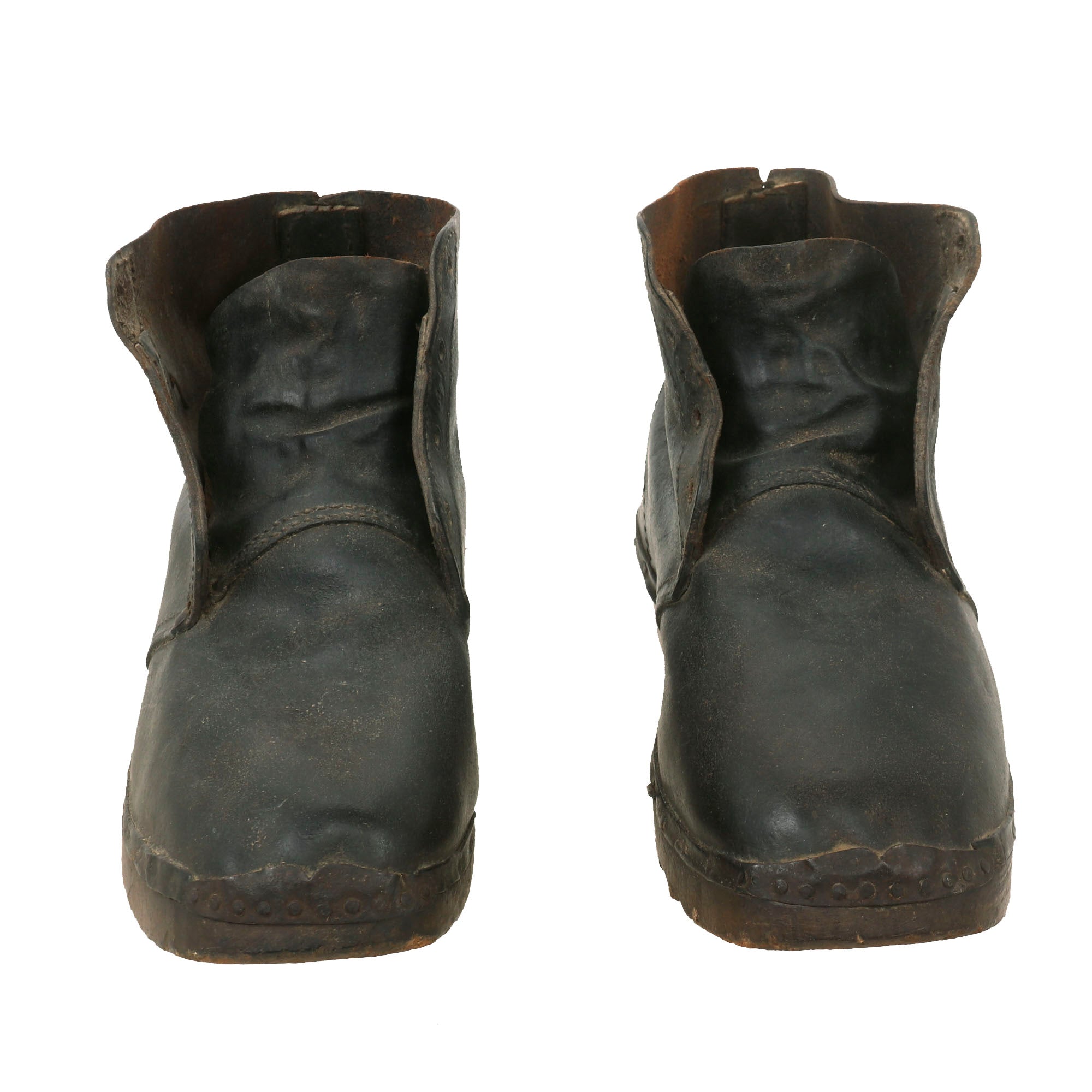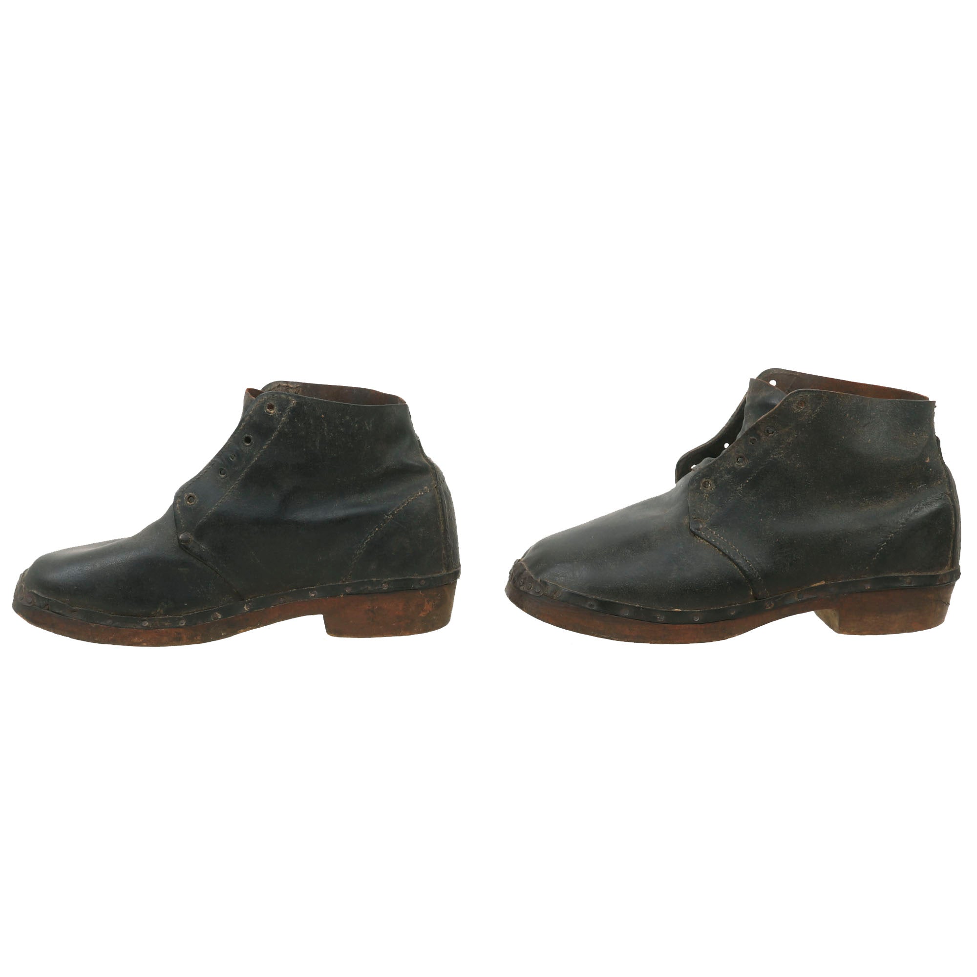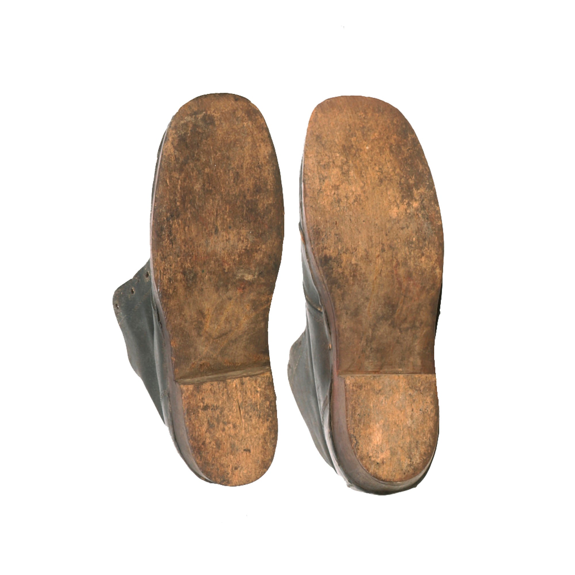 The boots themselves are in incredible condition especially for the age and materials used. The wood is unbelievably still solid with minimal cracking present. The leather is also very solid, indicating that these may have not seen much use during the war. The leather is rough to touch but not delicate as most encountered. The tongues are still attached very well as is the leather reinforcement tabs on the back of the shoes at the seams. There are no laces present.