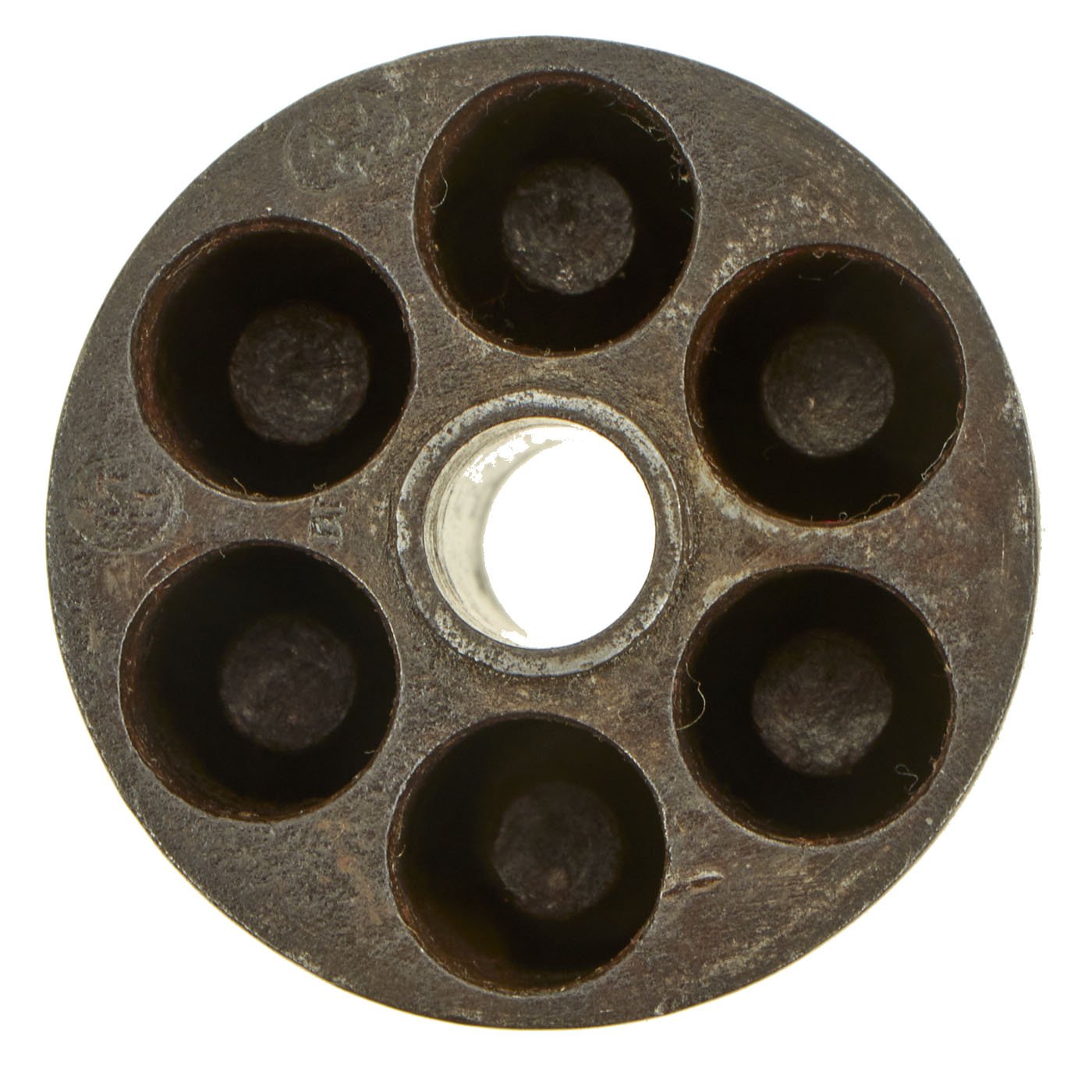 The revolver does function, however wear to the hand and cylinder ratchet now requires that the cylinder be rotated by hand often. There is also overall slop around the cylinder due to wear and powder oxidation. The bore shows clear lands and grooves, with a partly bright finish showing oxidation and powder fouling, as well as wear. The cap nipples vary in condition, with some intact, while others are broken or crushed.