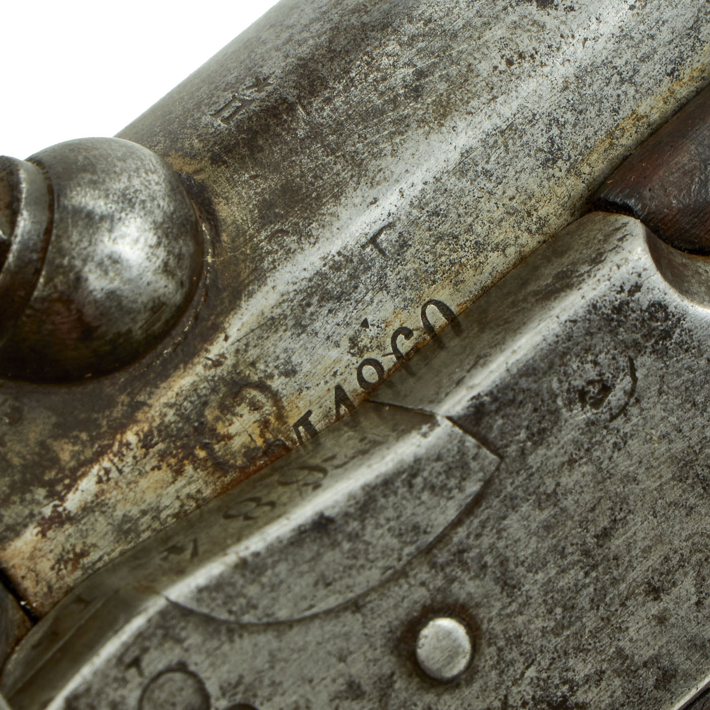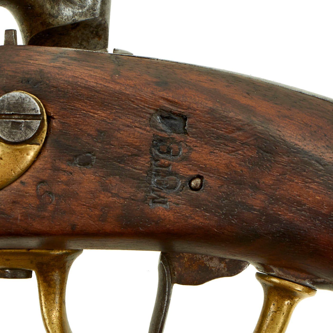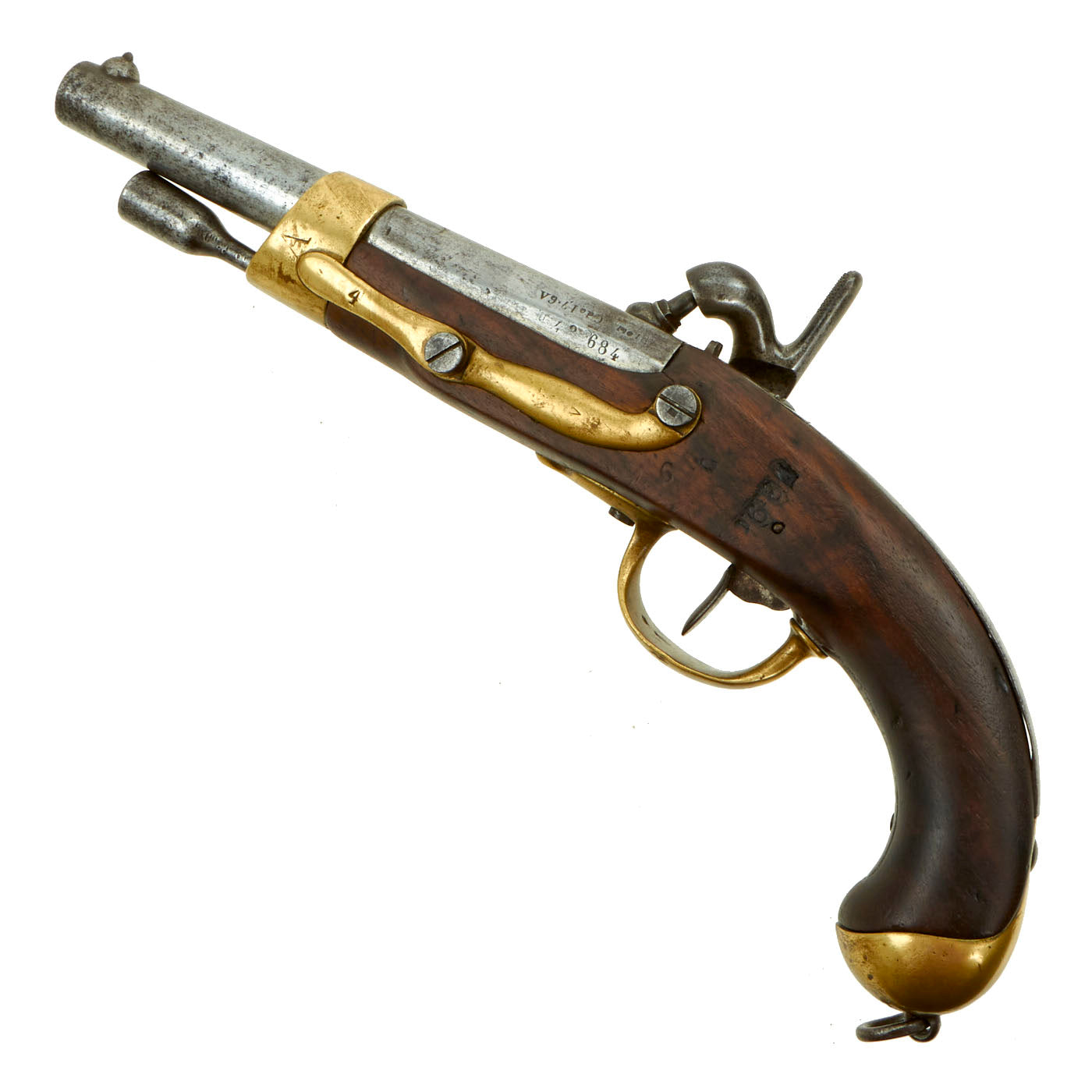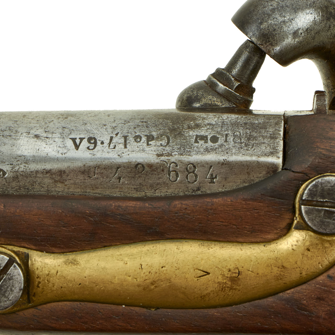 The lock definitely was manufacturer marked at one point, however now the markings are too faint for us to read accurately. There is however a stamped mark 684 where the flash pan used to be, which matches the 684 on the left side of the stock and on the barrel. The stock has several other stamped inspection Cartouches and the rifled 7 3/4" barrel has some faded proofs, as well as Cde 17,6 for an 17.6 mm bore, which is approximately .69".