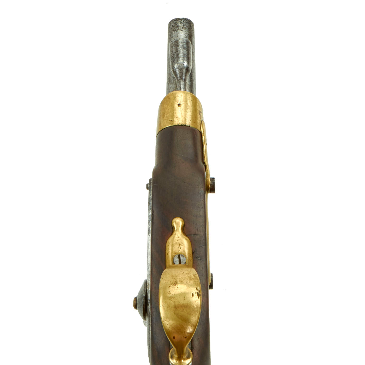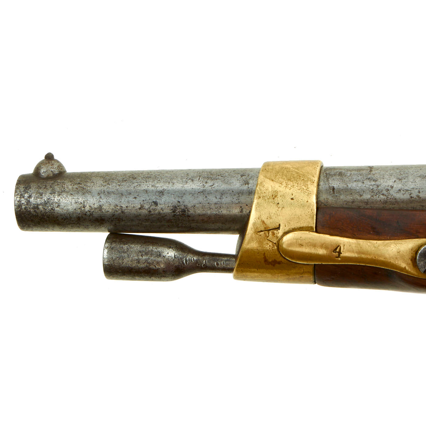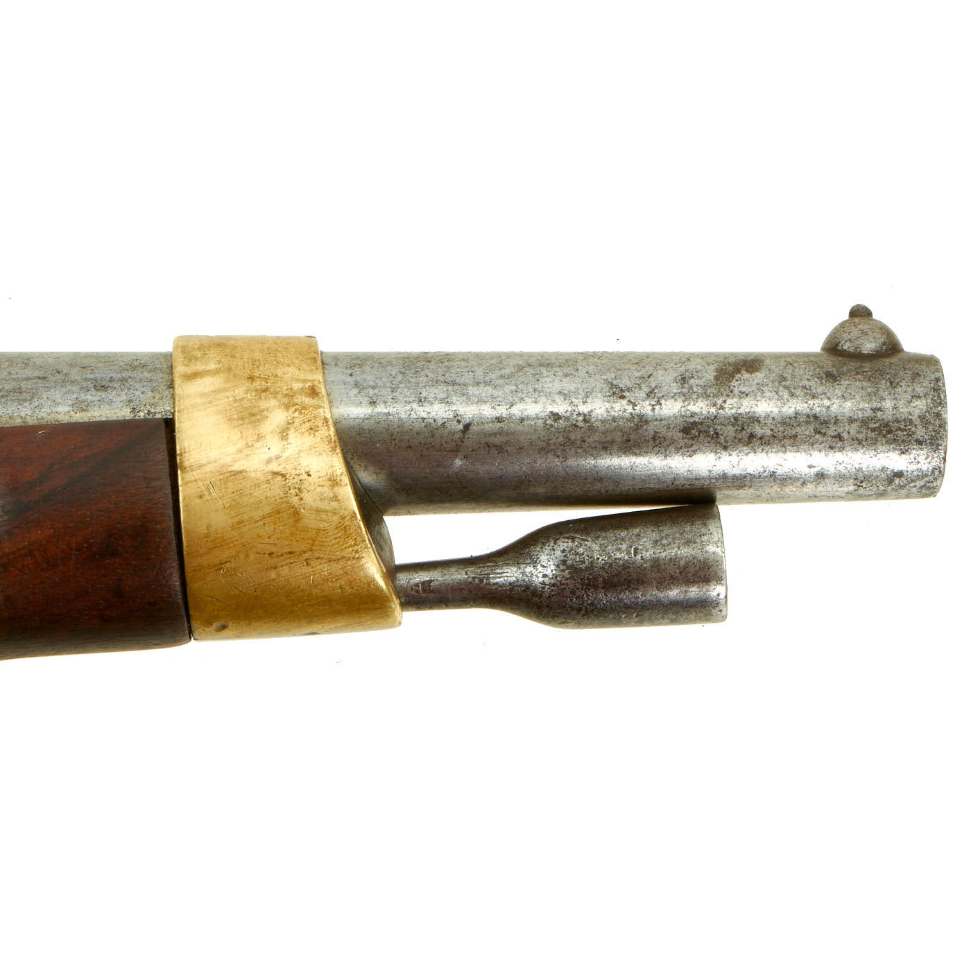 The finish is patinated and worn, showing that this was not a "museum" example, but a real service used example. The barrel does show rifling on the inside, though there is also wear from service. The lock is functional, however the tumbler is worn and it does not currently have a half cock position, and only holds and fires from full cock. It still has the original ramrod present, as well as the lanyard loop on the butt cap.