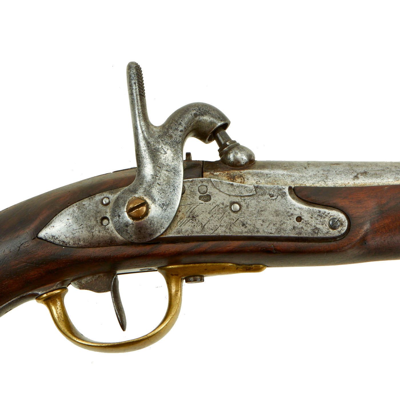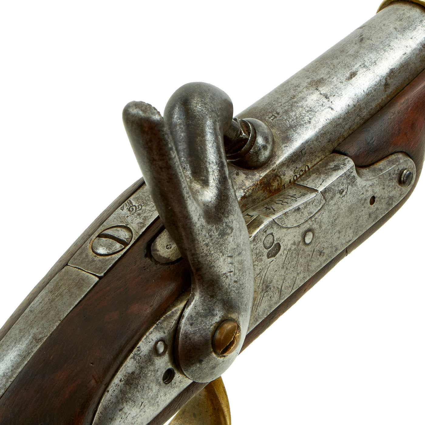 Original Item: Only One Available - As used in the U.S. Civil War. This is very unusual and interesting, being both rifled and converted to percussion. This started life as a French Modèle 1822 Flintlock pistol, made at one of the various government arsenals. This was one of the last flintlock models put into service. In the years since it was produced, it was both converted to percussion, and now has a very nice .69" rifled barrel, bored out from the original. The model number is missing from the barrel tang, however it still has the script T indicating a percussion "transformation", over the word bis (again), indicating another "transformation", in this case the addition of rifling to the barrel. There are various markings on the pistol, showing that this fine example has definitely had a long and interesting history.