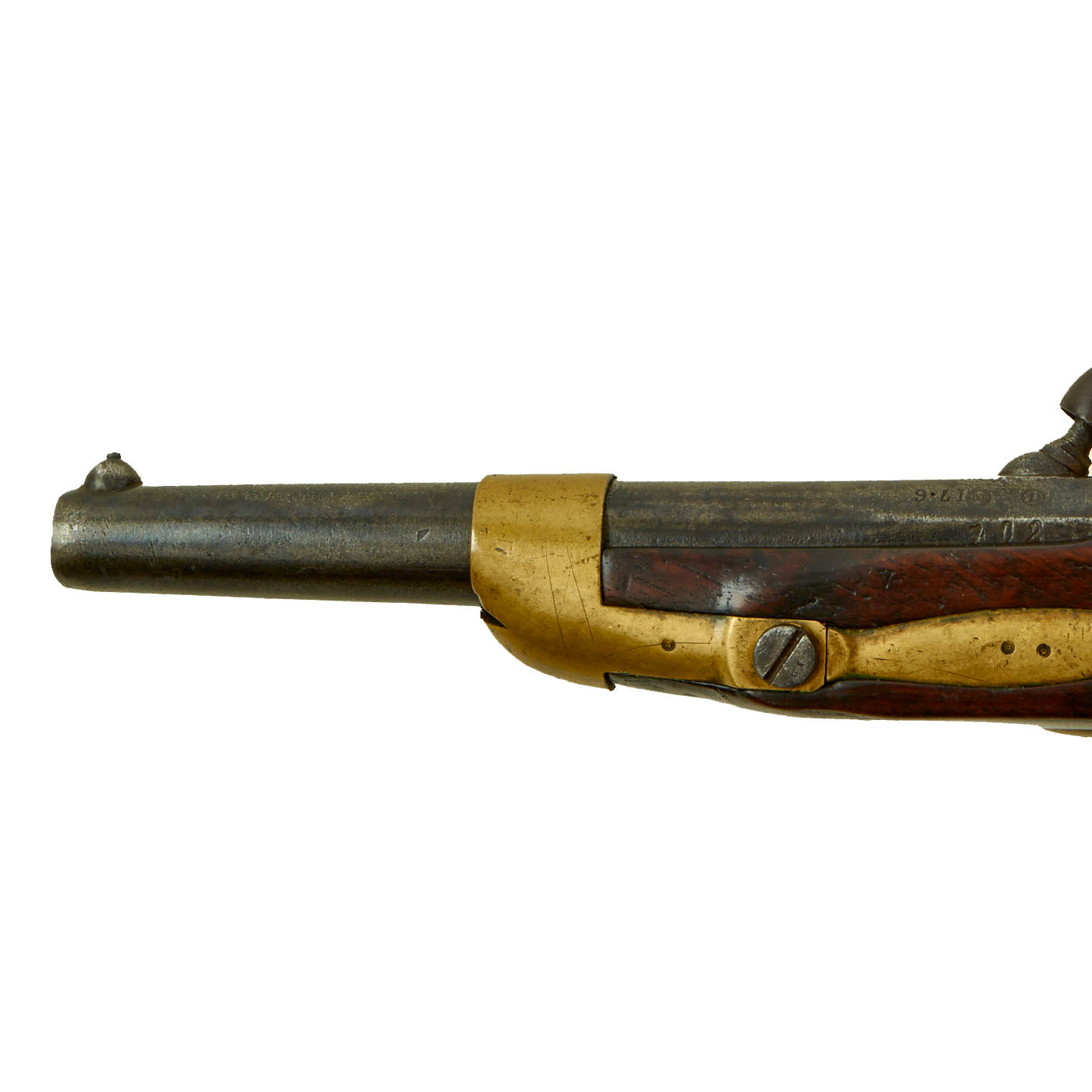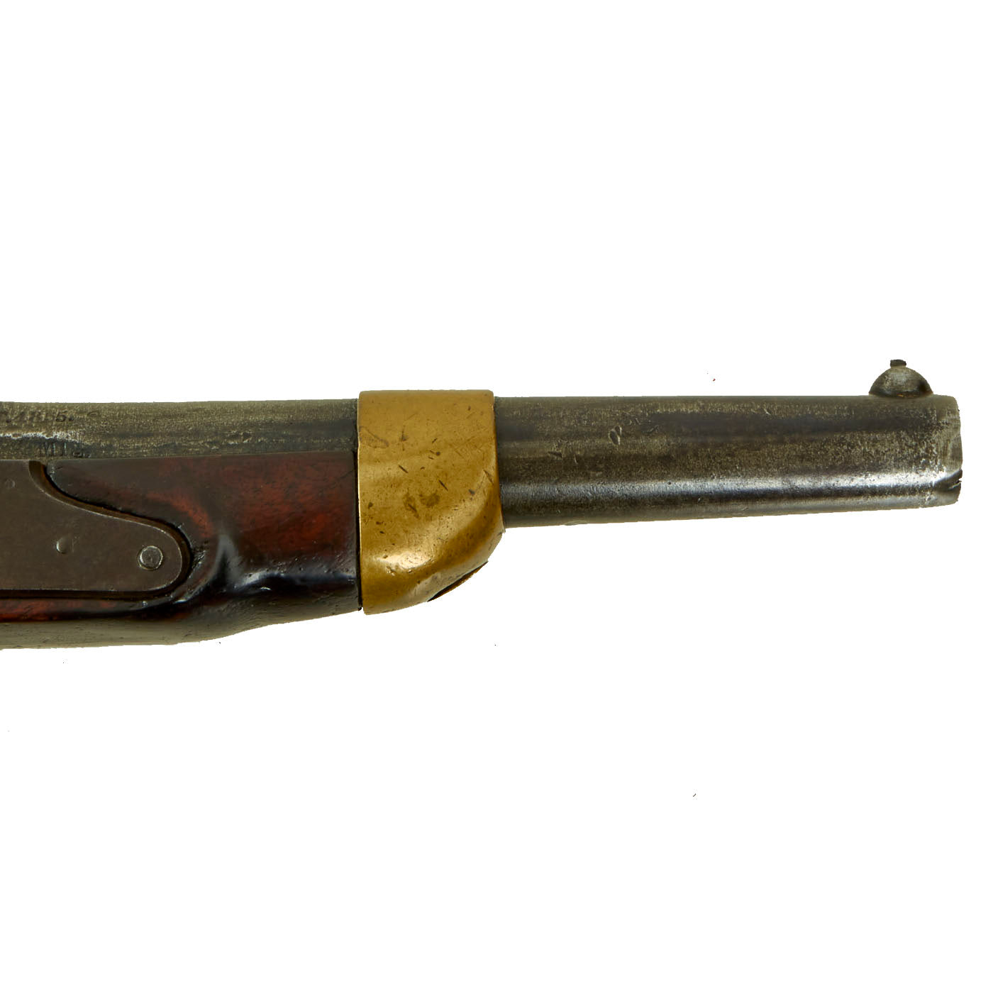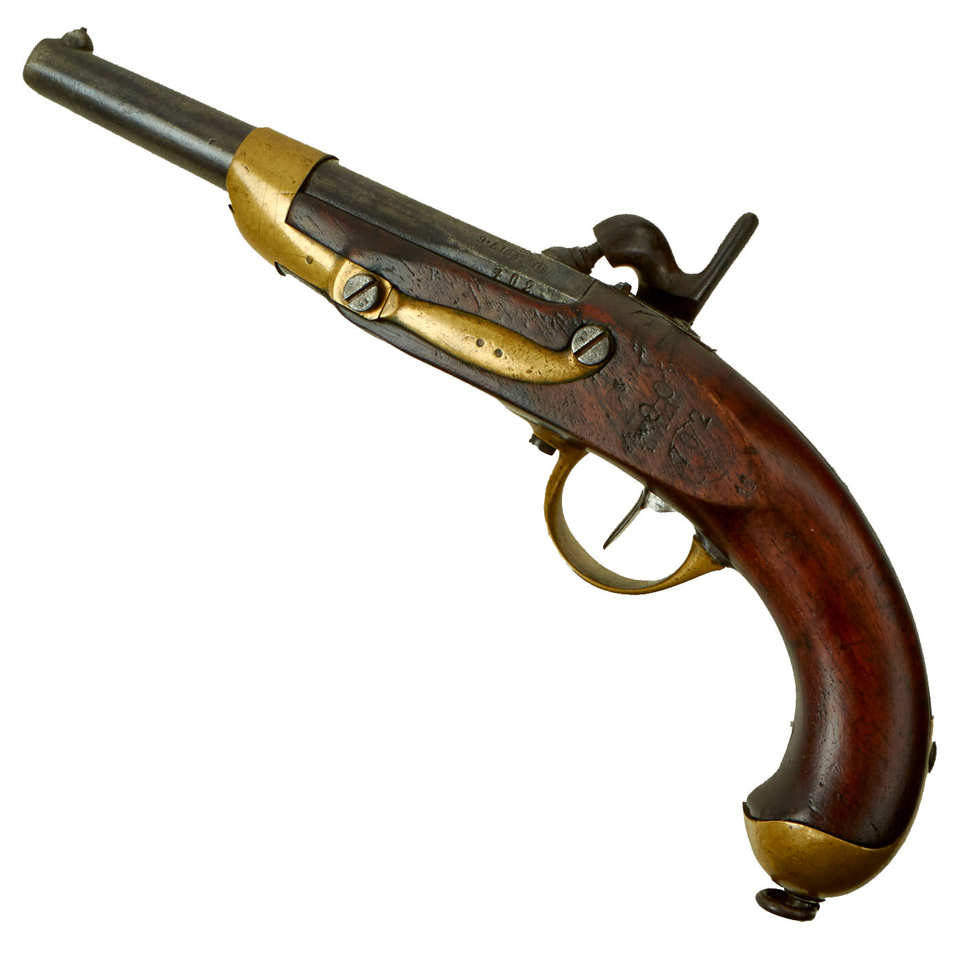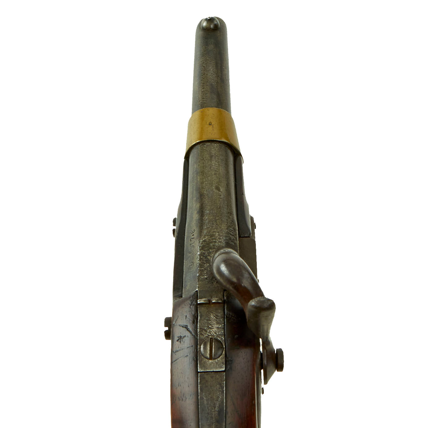 Original Item: Only One Available - As used in the U.S. Civil War. This is very unusual and interesting, having been both rifled and converted to percussion. This started life as a French Modèle 1822 Flintlock pistol, made at Tulle Arsenal. This was one of the last flintlock models put into service. In the years since it was produced, it was both converted to percussion, and then rifled. It then saw much use, enough to wear the barrel from .69" out to .73" and remove all of the rifling.