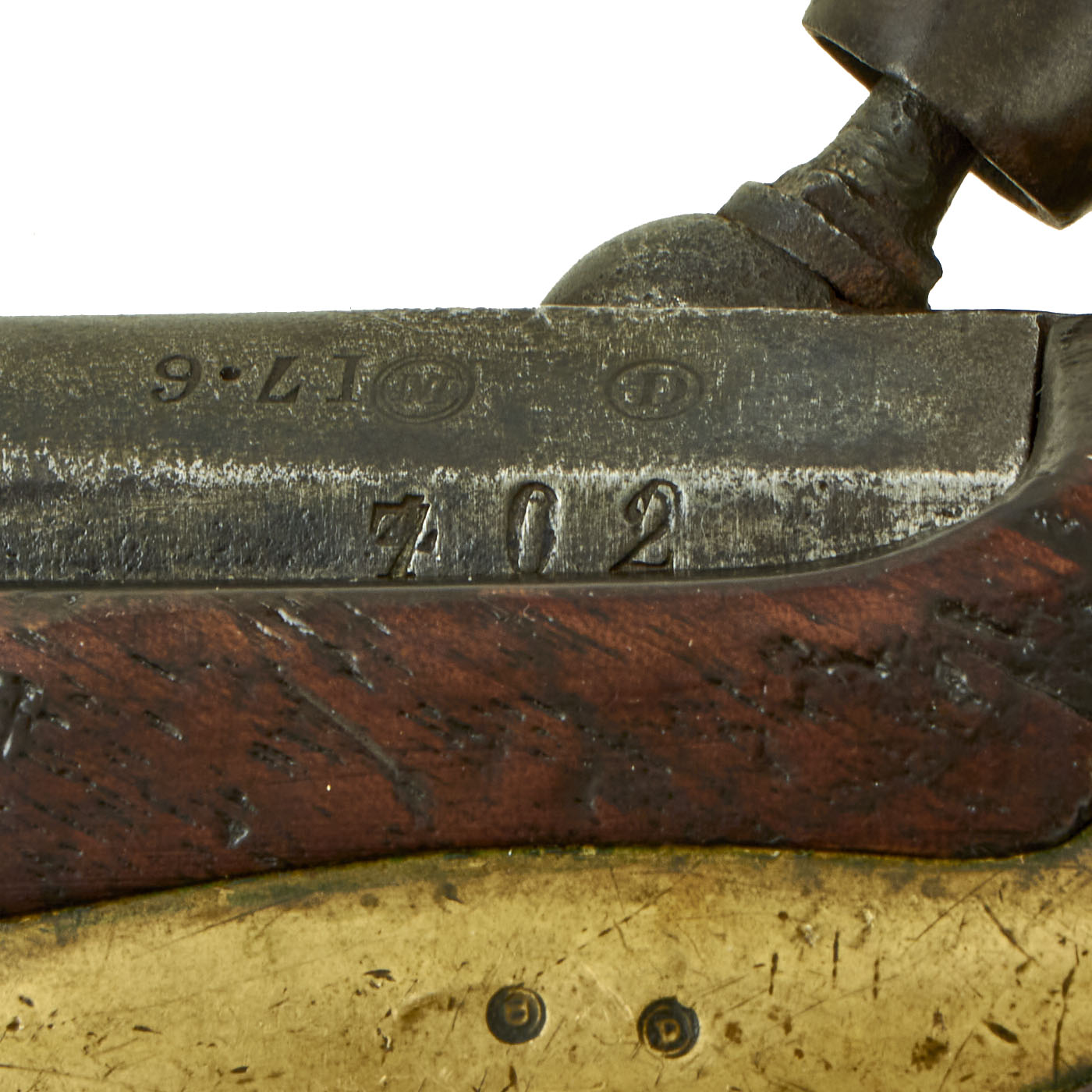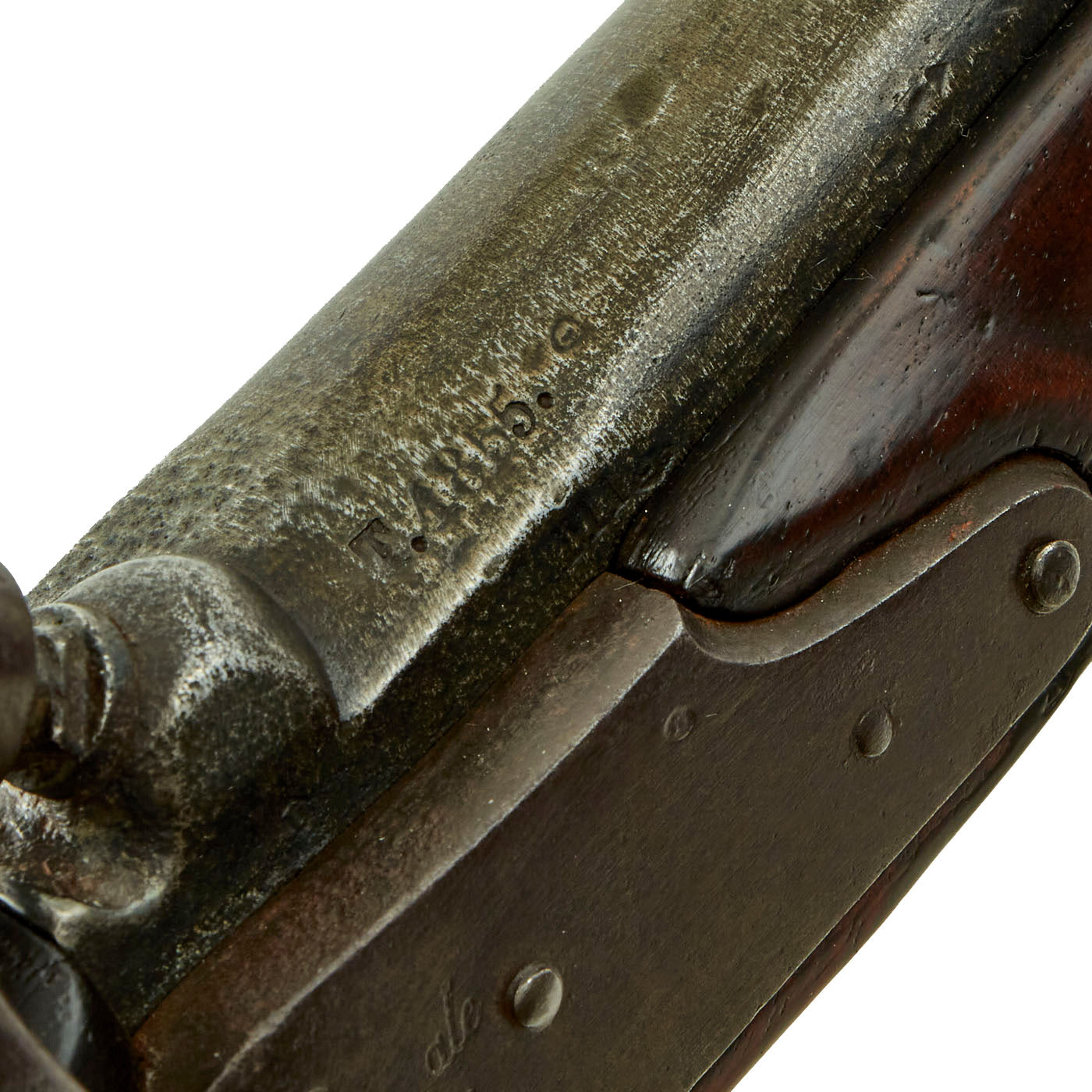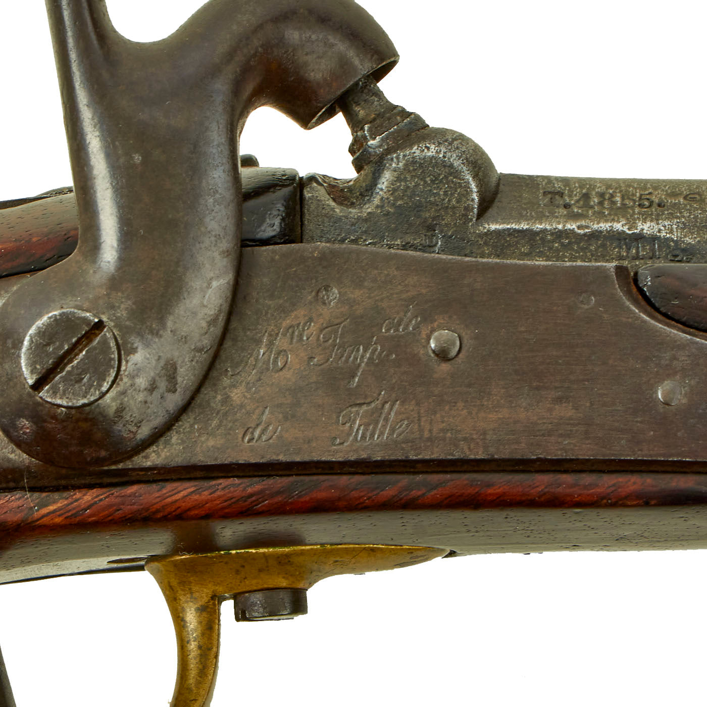 The stock has several stamped inspection Cartouches and the 7 3/4" barrel has some faded proofs, as well as I7.6 for an 17.6 mm bore, which is approximately .69". There is also a T. 1855 marking by the cap bolster, indicating that it underwent one of the conversions in 1855 at Tulle.