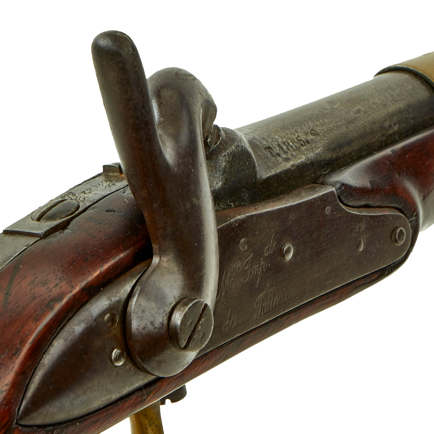The tang of the barrel by the rear sight is marked M'le 1822 T, for the model and the "T" indicates a percussion "transformation". There is also the word bis (again) under this marking, indicating another "transformation", in this case the addition of rifling to the barrel. The right side of the stock has various number markings stamped, including a very faint TULLE and what look to be rack numbers. This fine example has definitely had a long and interesting history.