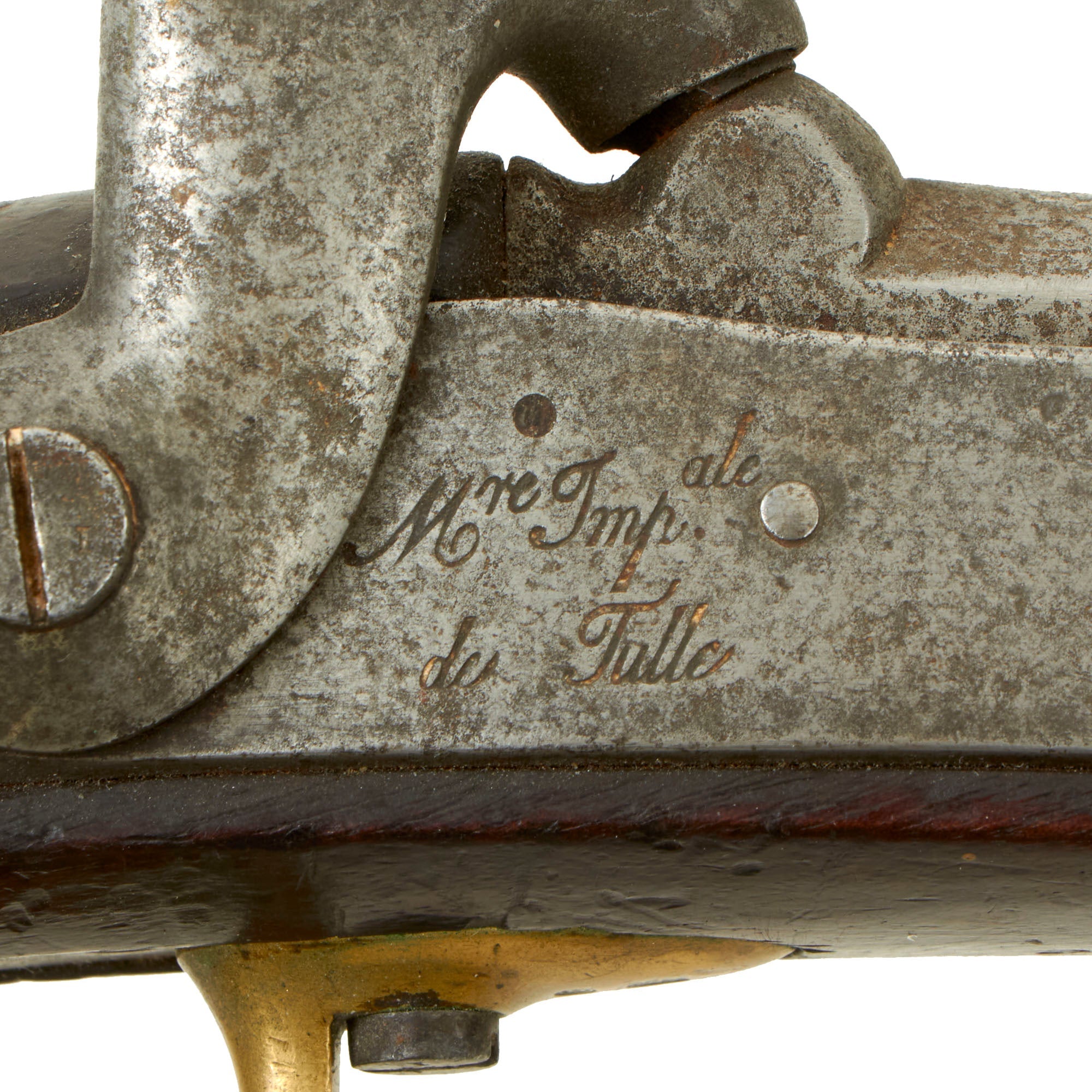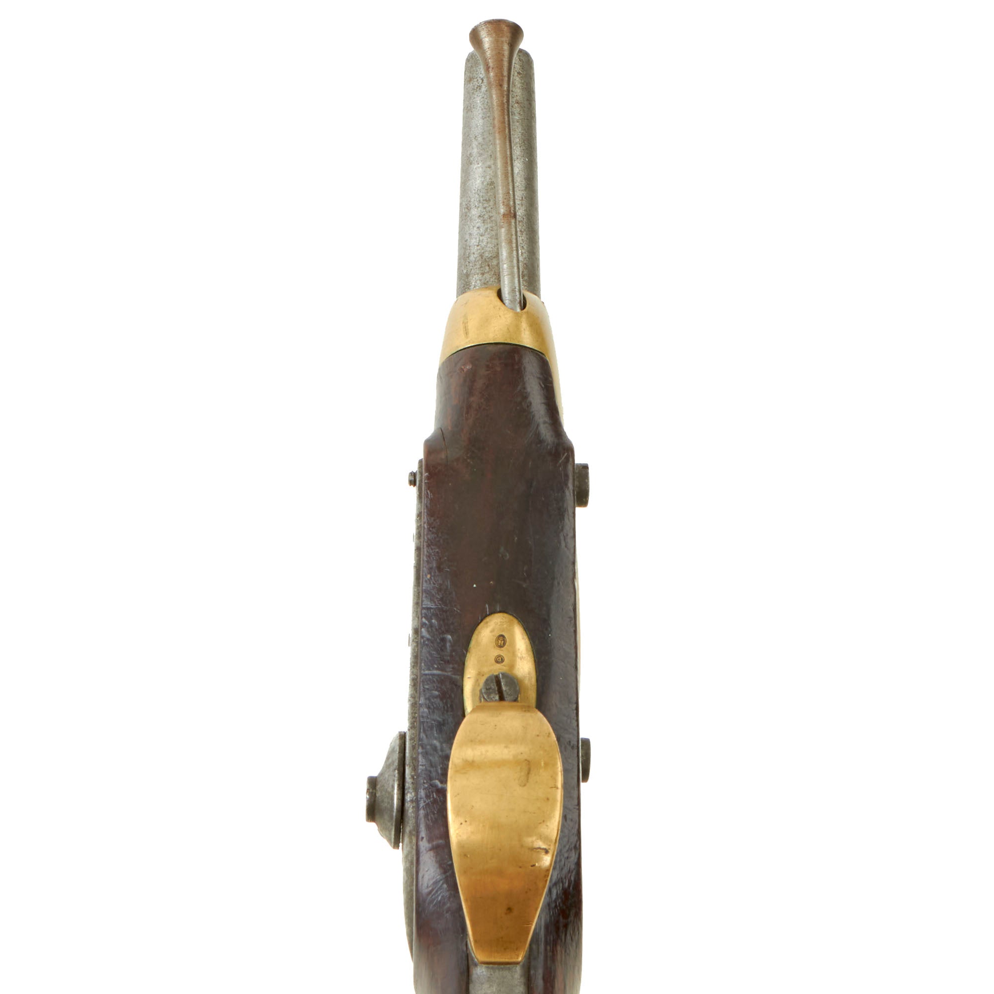 The stock has several stamped inspection Cartouches and the 7 3/4" barrel has some faded proofs, as well as C.de 17.6 for an 17.6 mm bore, which is approximately .69". There is also a T. 1856 marking by the cap bolster, indicating that it underwent one of the conversions in 1856 at Tulle.