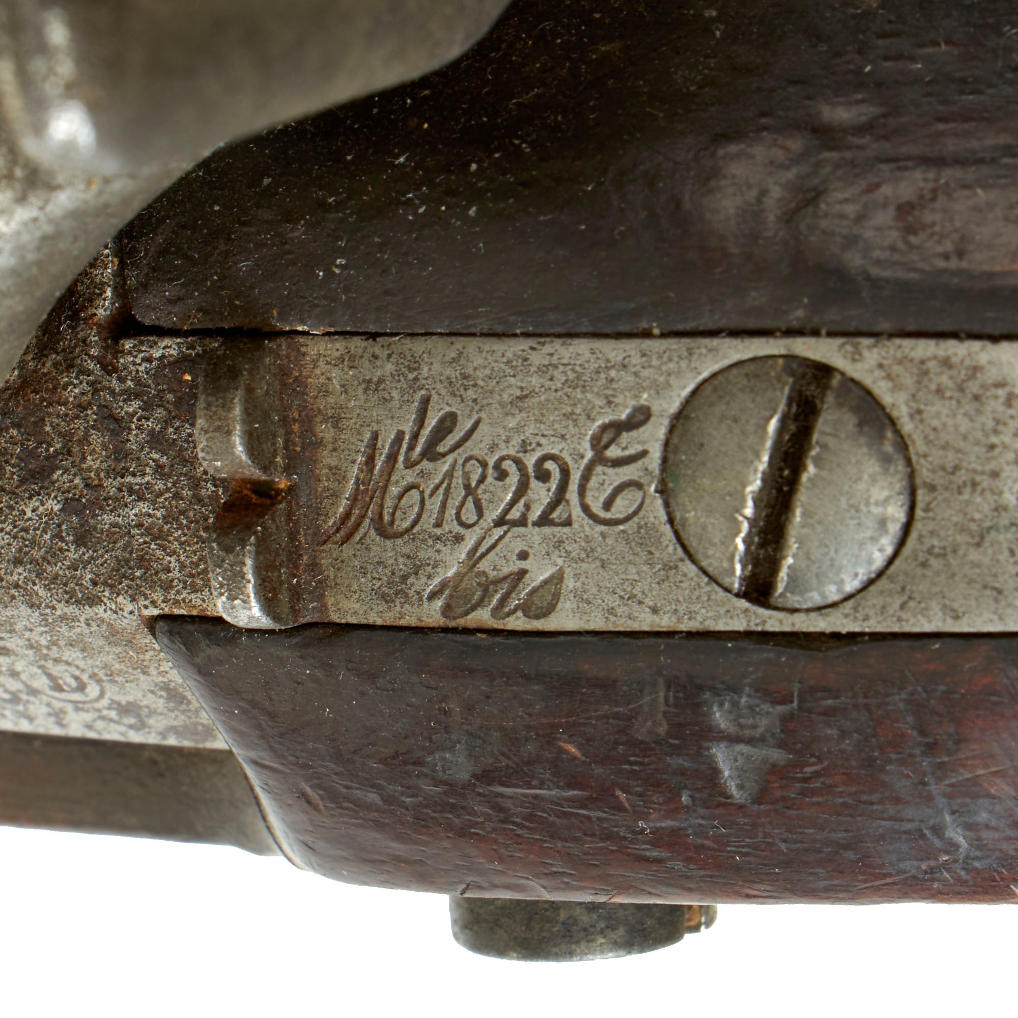 The tang of the barrel by the rear sight is marked M'le 1822 T, for the model and the "T" indicates a percussion "transformation". There is also the word bis (again) under this marking, indicating another "transformation", in this case the addition of rifling to the barrel. The right side of the stock has various number markings stamped, including CHATEL'T (for Châtellerault Arsenal) and what look to be rack numbers and a round cartouche. This fine example has definitely had a long and interesting history.
