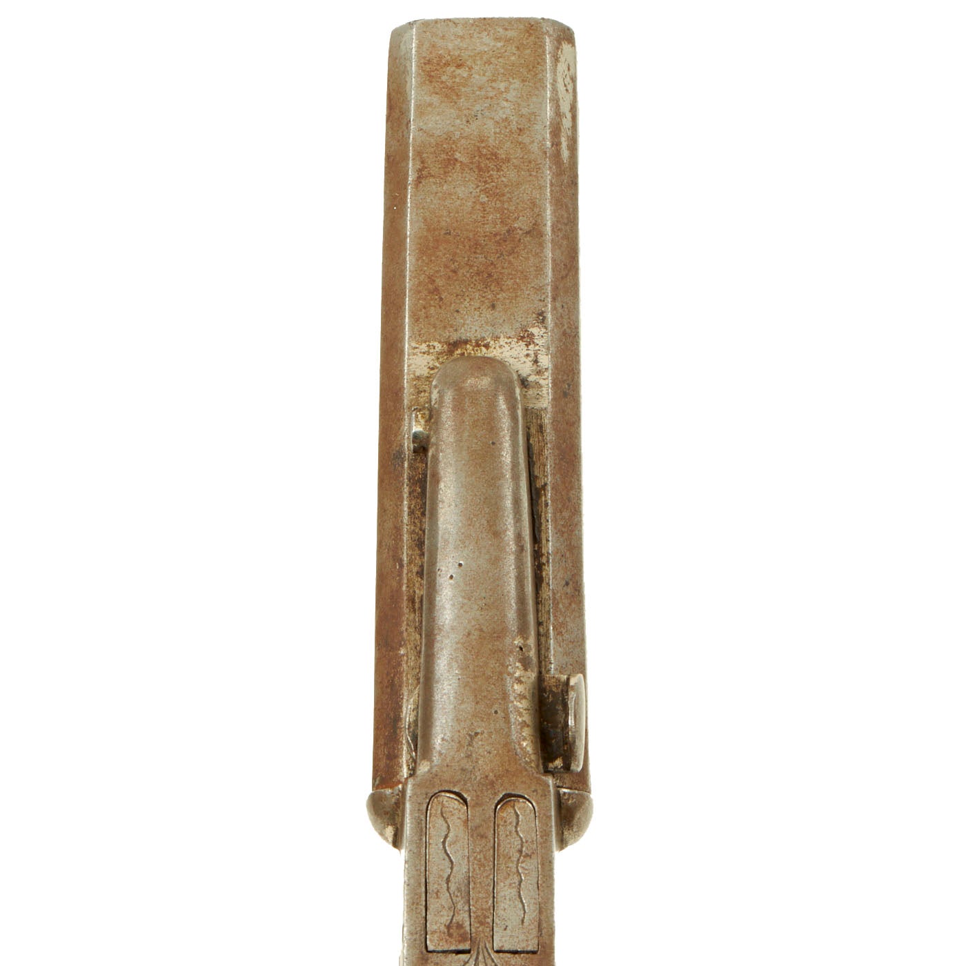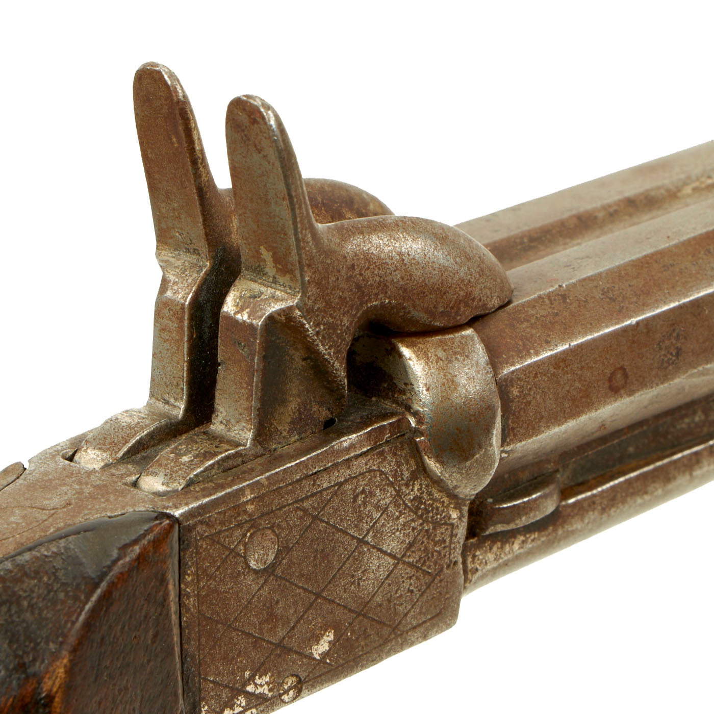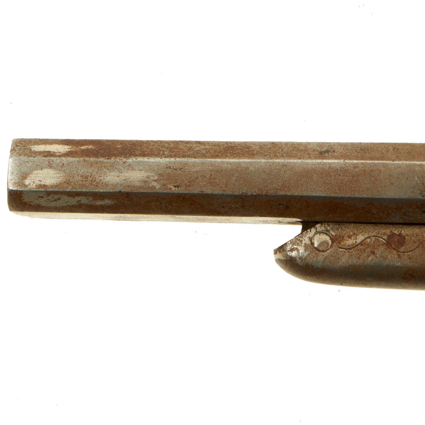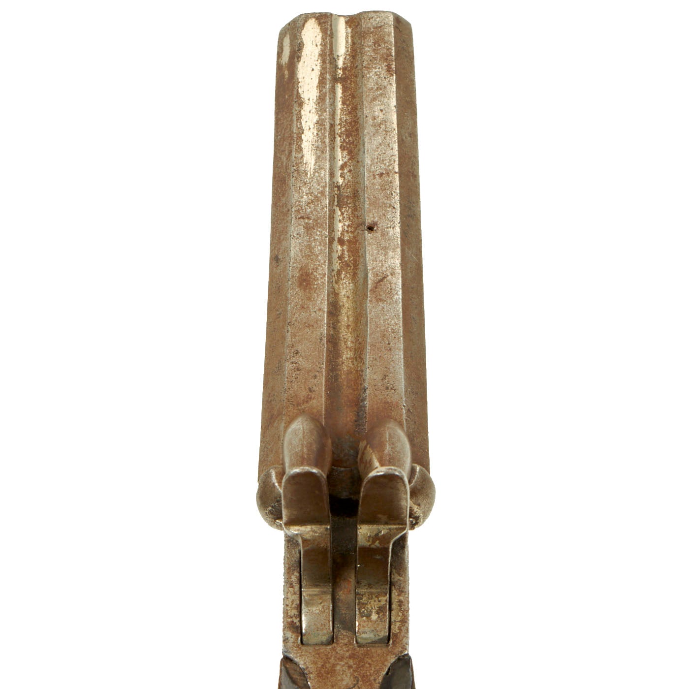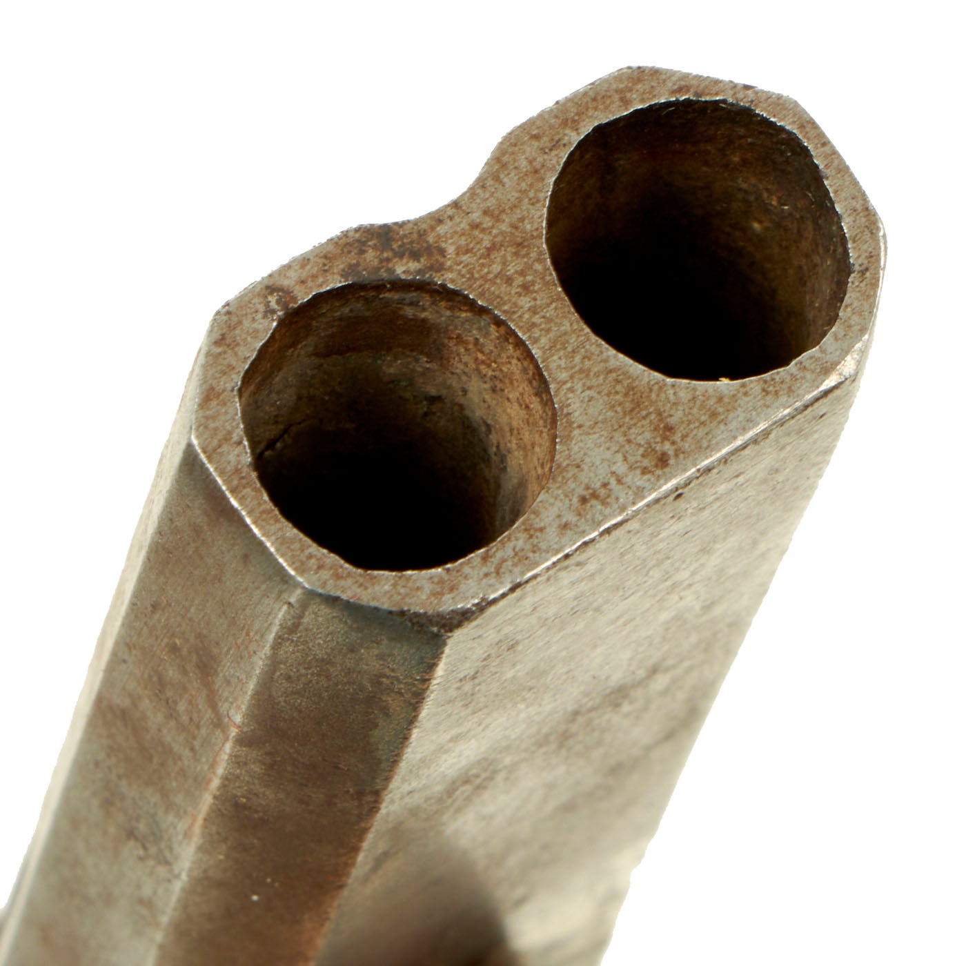 Condition is good, though most of the original nickel plating has long worn away. The pistol also looks to have seen a lot of use, as the insides of the barrels are fouled and corroded. There is even a small hole on the top of the right barrel, which extends into the bore.