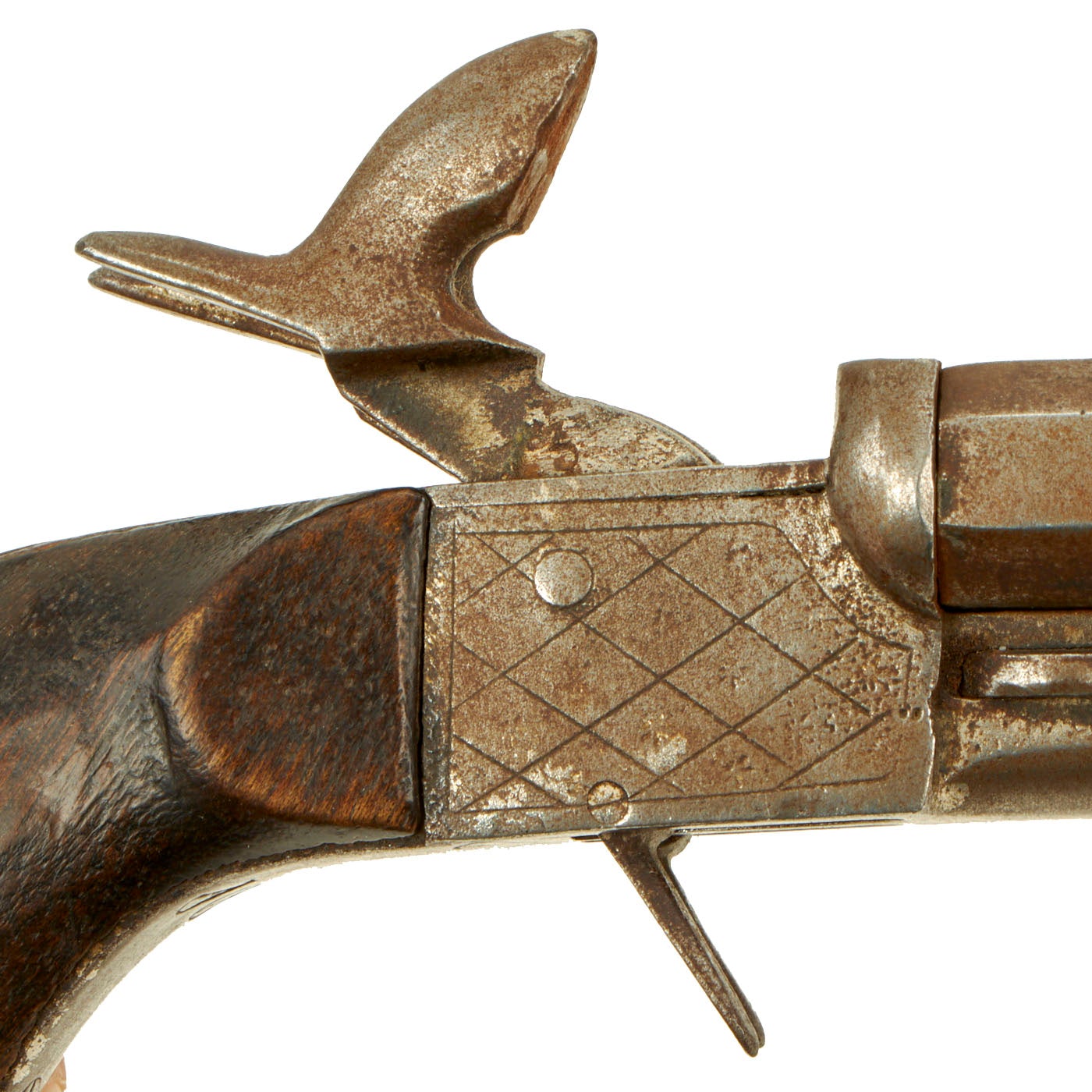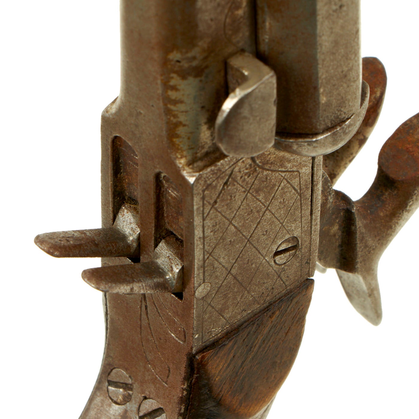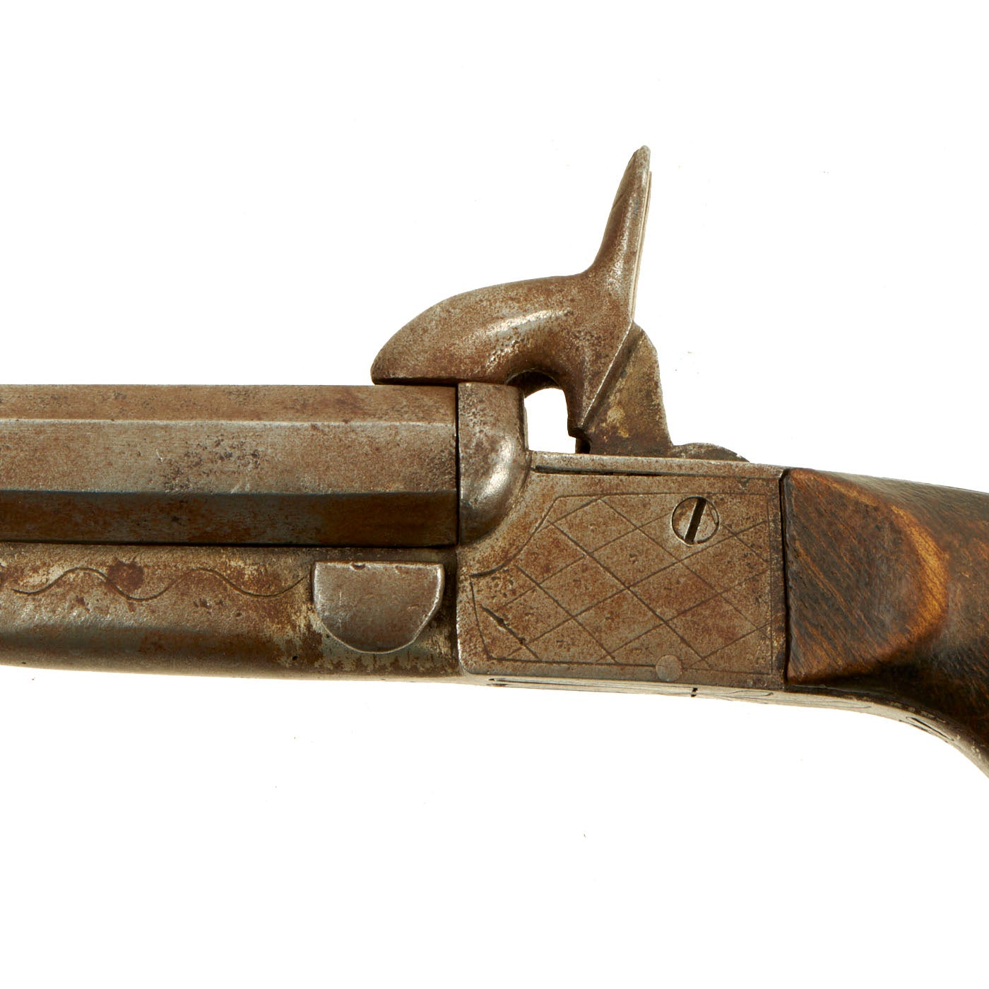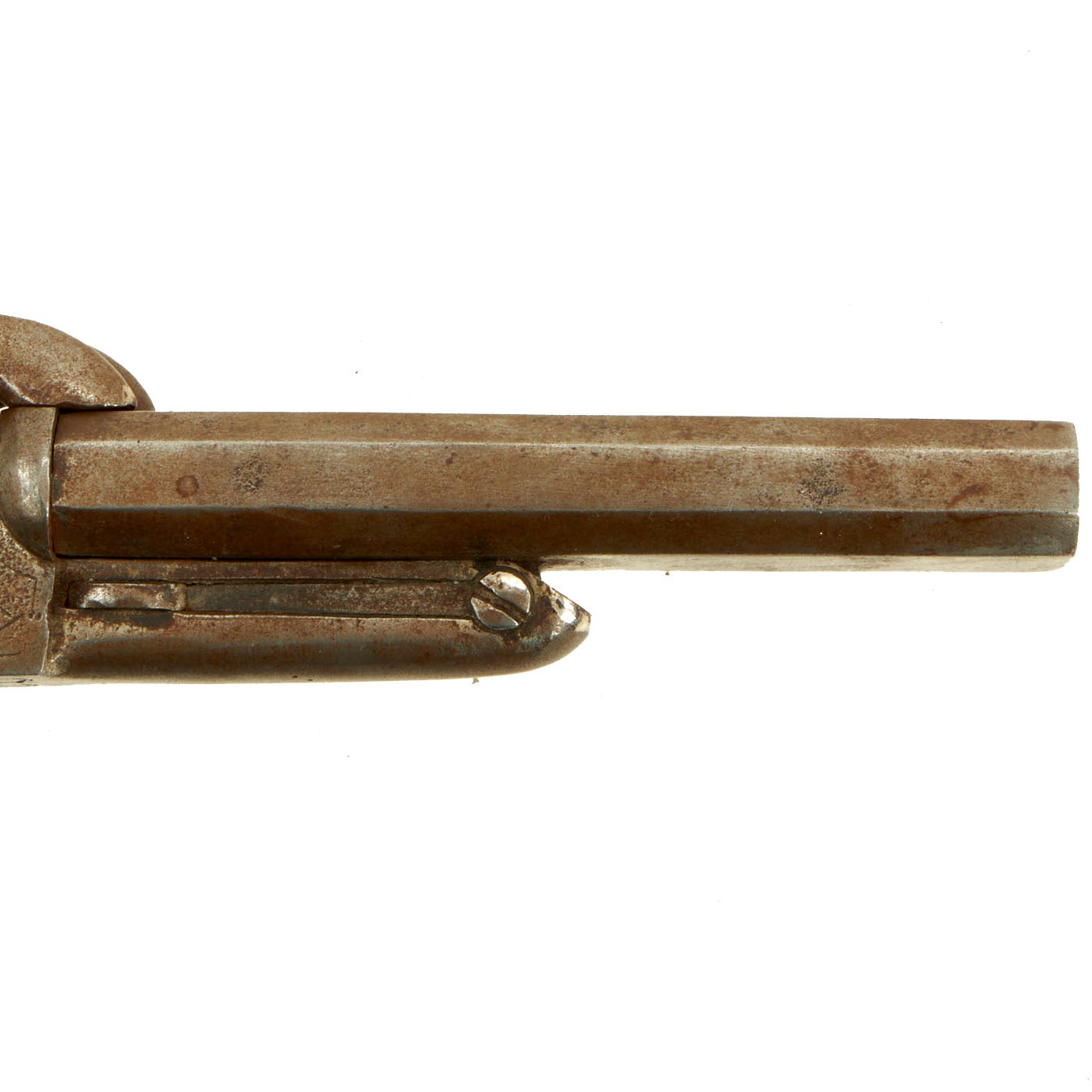 Original item. Only One Available. Originally nickel plated, this is a very nice French style double barrel pinfire pistol, most likely made in Belgium just before the U.S. Civil War. We were not able to find any markings, which is common for Belgian arms not made under contract for private purchase. The "NEW" French "Pinfire" cartridge had just been introduced, which featured a pin extending from the rear side of the cartridge that when depressed discharged the round. Never as popular as might have been expected and by 1870 quite obsolete.
