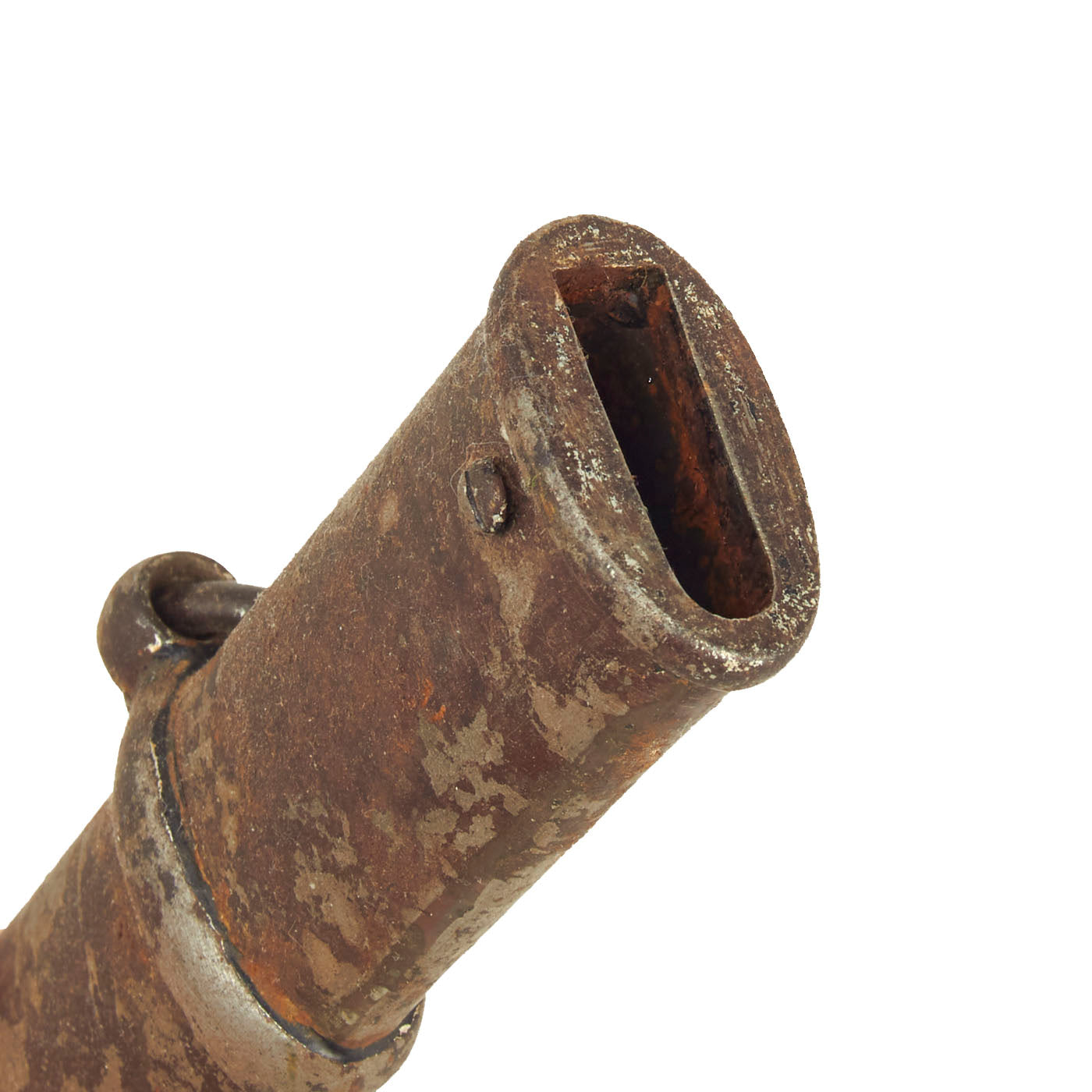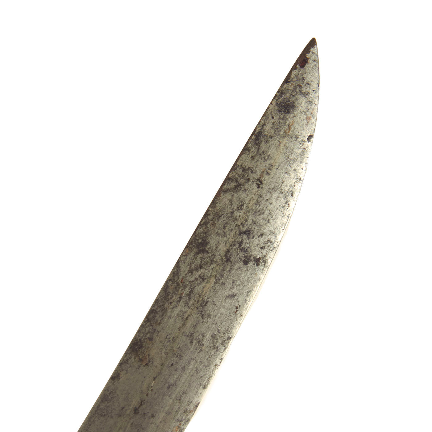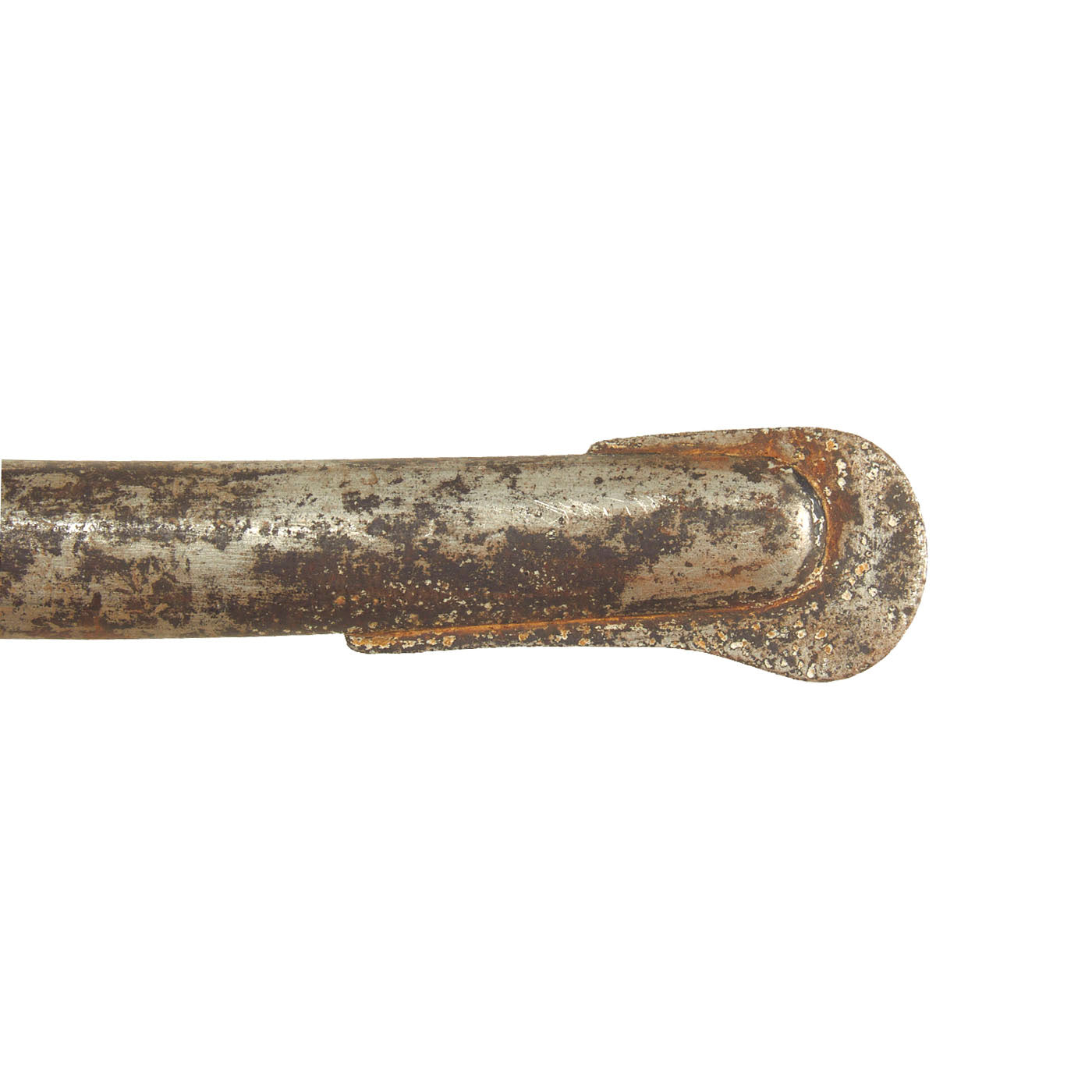 The scabbard is in very good condition, with no dents we can see, and a great aged oxidized patina. It still retains both original hanger rings, and is a very good example of this type of scabbard though it was repainted at some point.