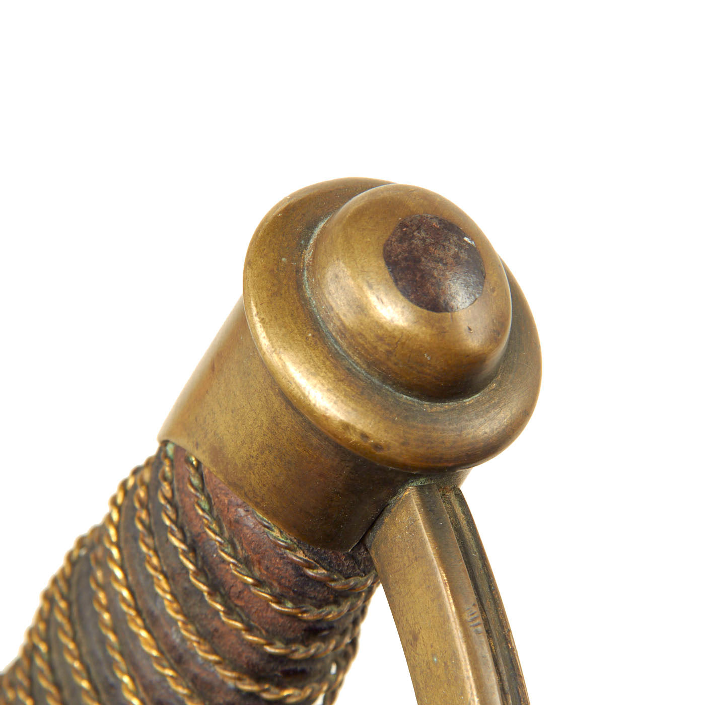 The saber has a very nice brass wire bound leather grip, which is mostly intact with some leather degradation, and a brass three branch brass hand guard. The original leather blade buffer washer is still present, and the sword comes with its original heavy steel scabbard with two hanger rings.