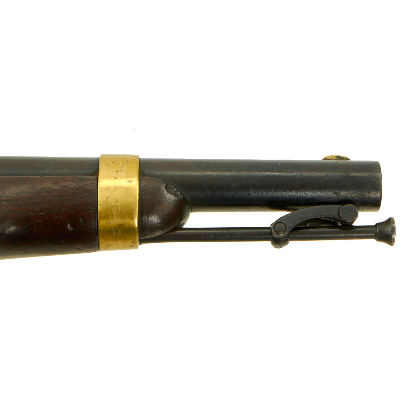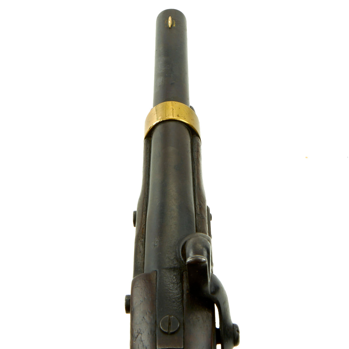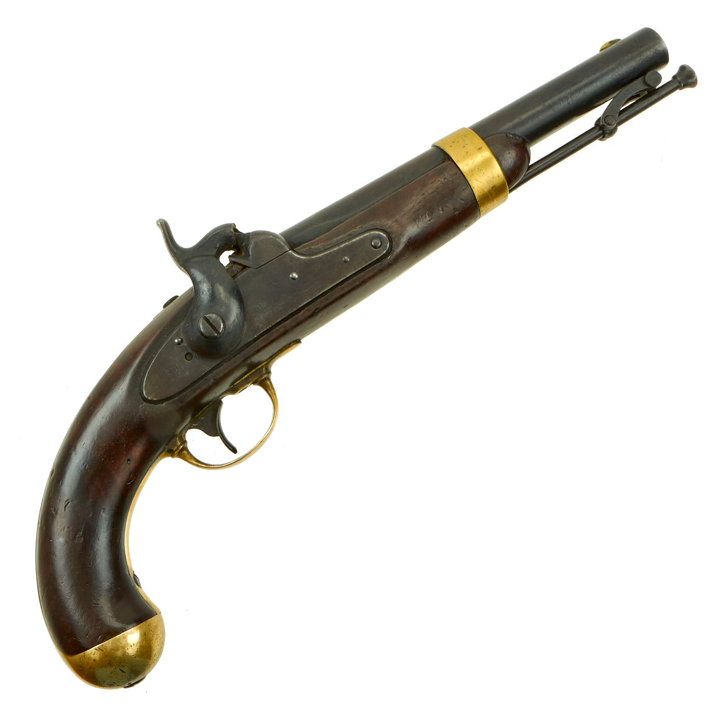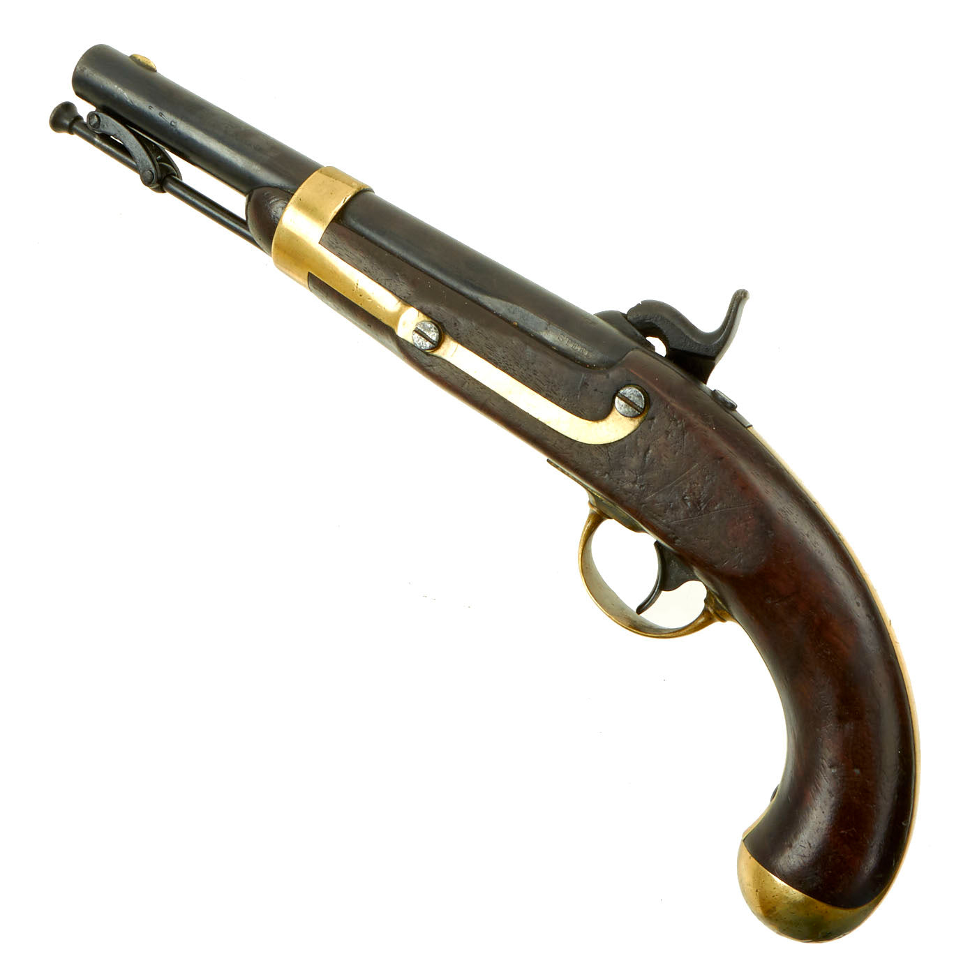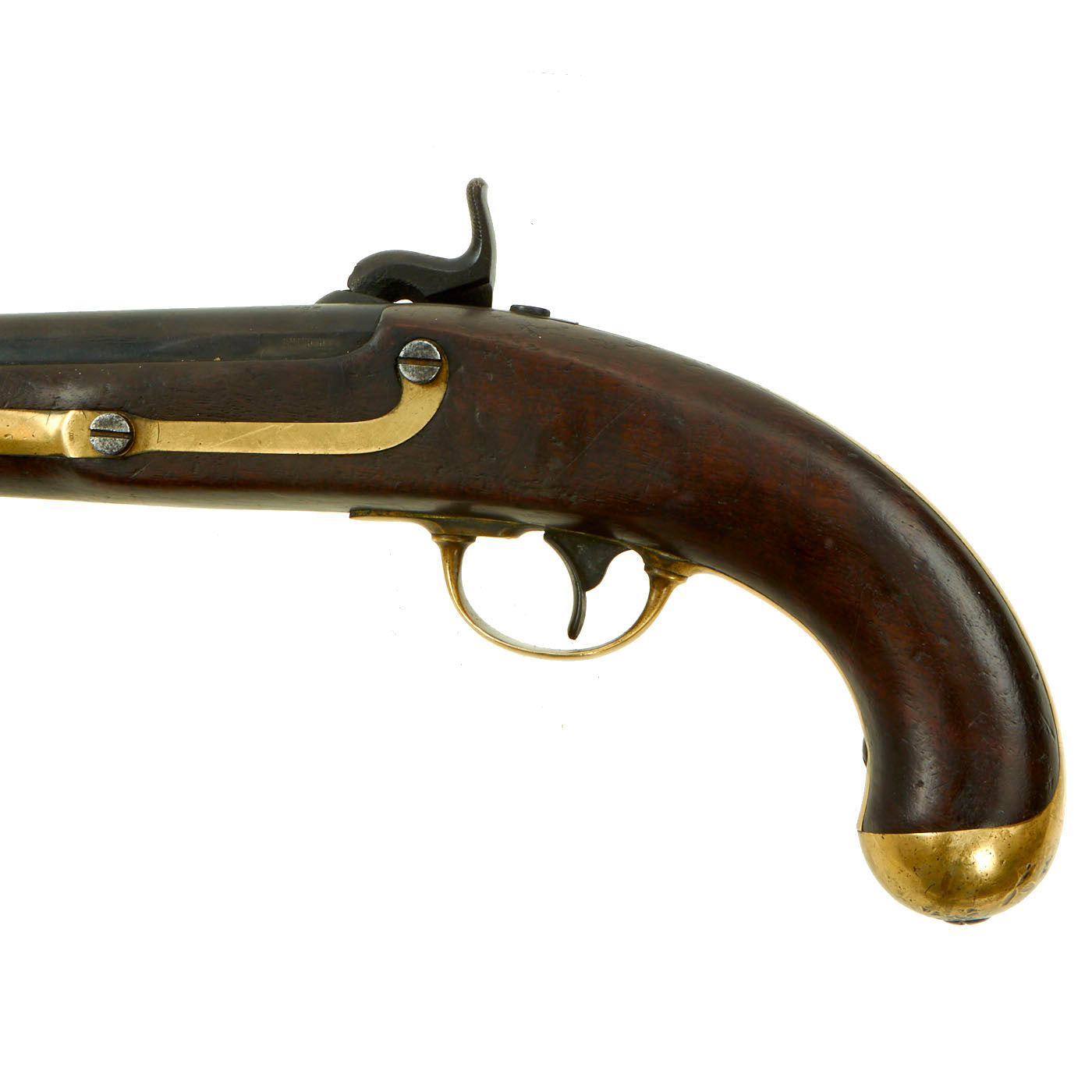 Original Item: Only One Available. This U.S.-made single-shot, smoothbore pistol is a very nice example of the Model 1842 percussion pistol, produced by Ira N. Johnson of Middletown, Connecticut. Ira Johnson received a contract from the U.S. Ordnance Dept in March 1851 to produce 10,000 M1842 pistols. Johnson was a partner in the firm of H. Aston & Co when he resigned to start his own company to manufacture single shot pistols. Johnson delivered pistols that were identical to Aston’s arms save for the markings on the plate.