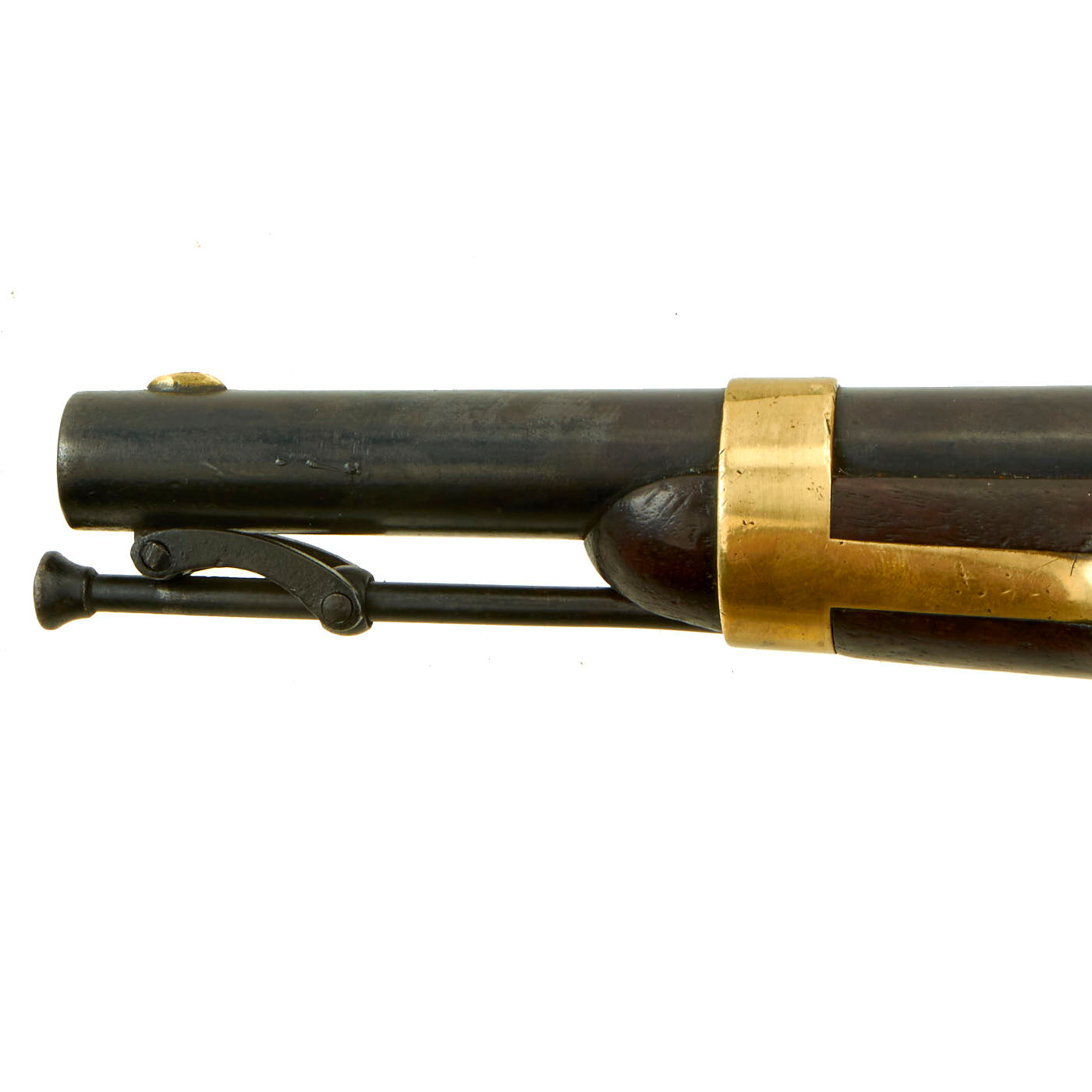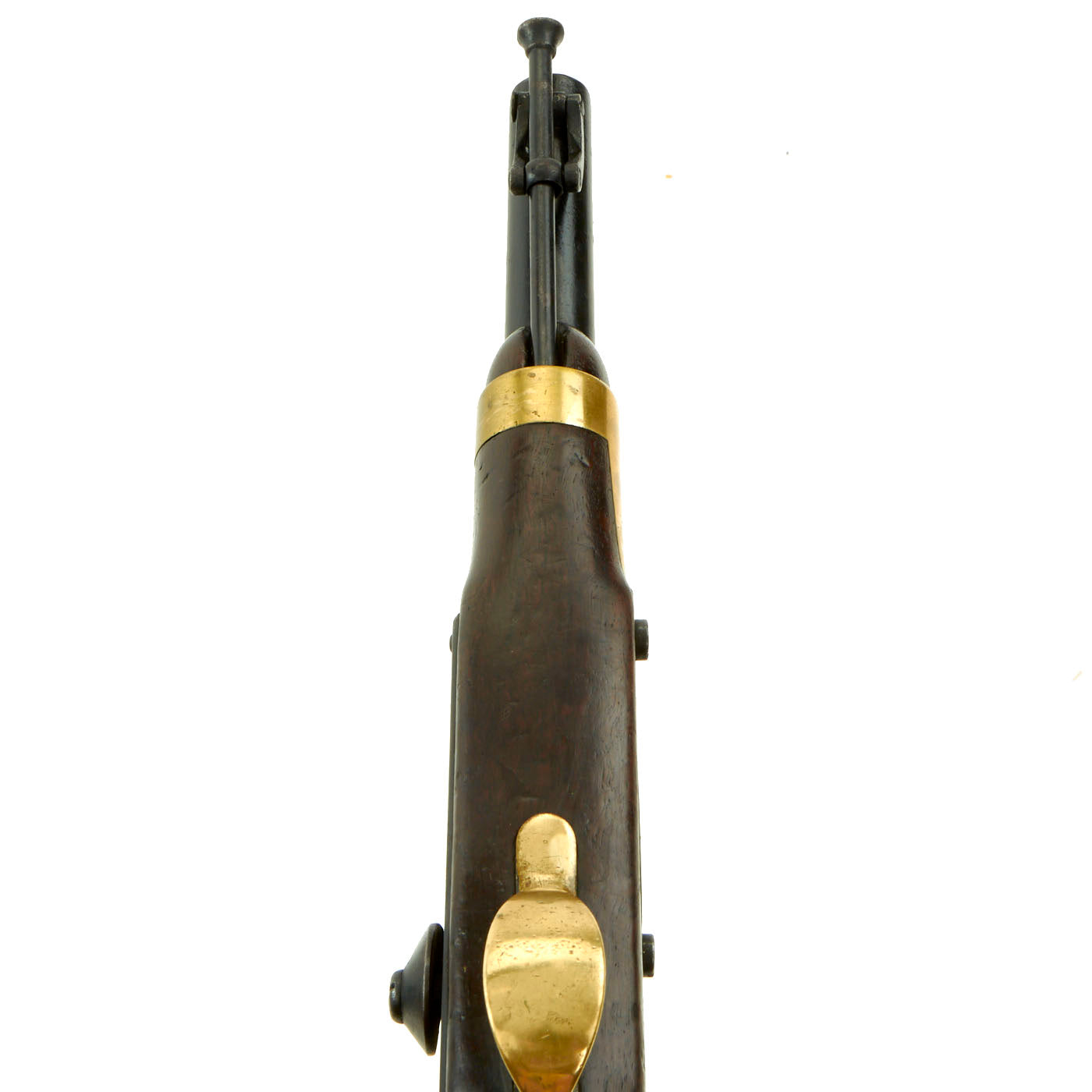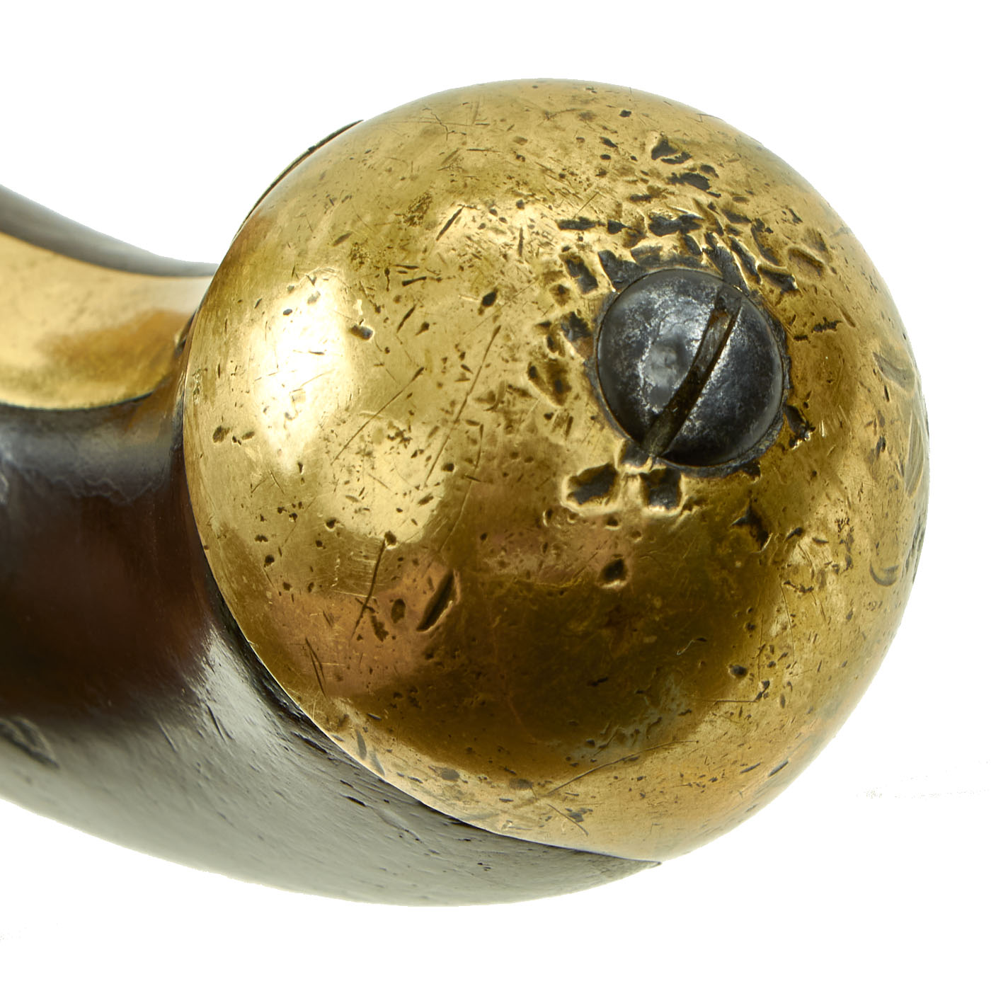 The walnut stock is in good condition, though it has been cleaned over the years, which has made any original inspection cartouches very faint, or removed them completely. It does have a crack near the rear lock screw, but it does not look to go all the way through. The brass mounts all in very fine condition. The lock is fully functional, holding correctly at half cock and firing at full. The "captured" cleaning rod functions correctly, though it is loose in the stock, so the retainer spoon is worn.